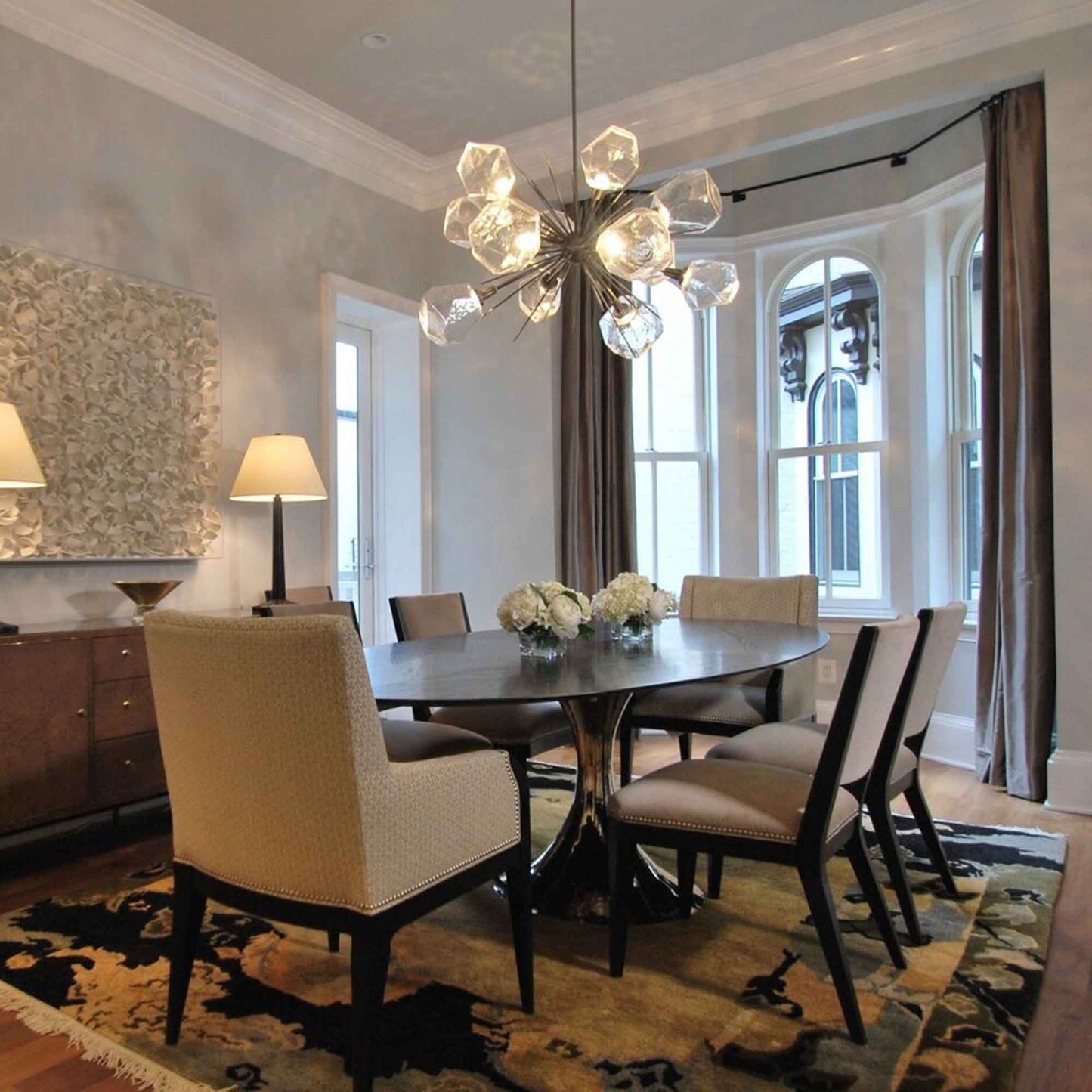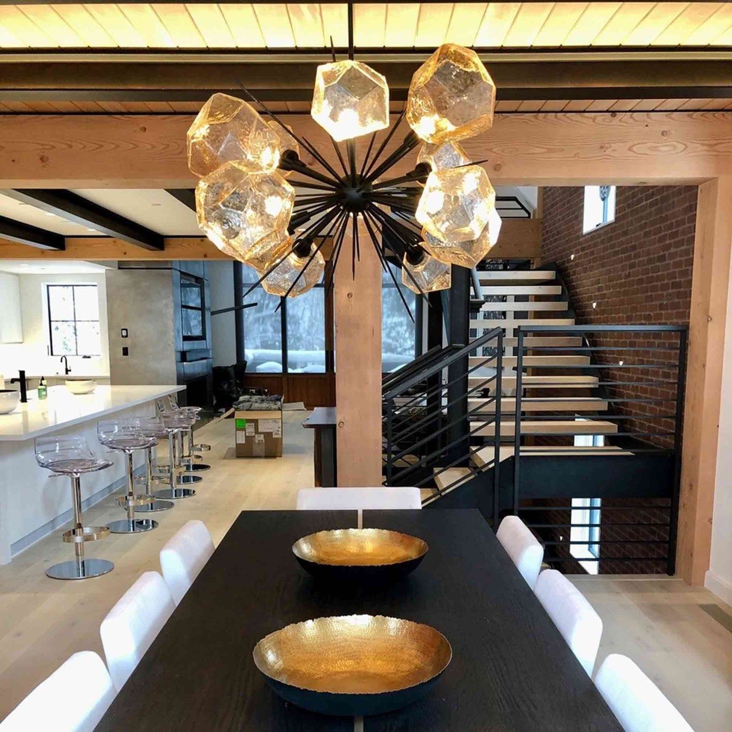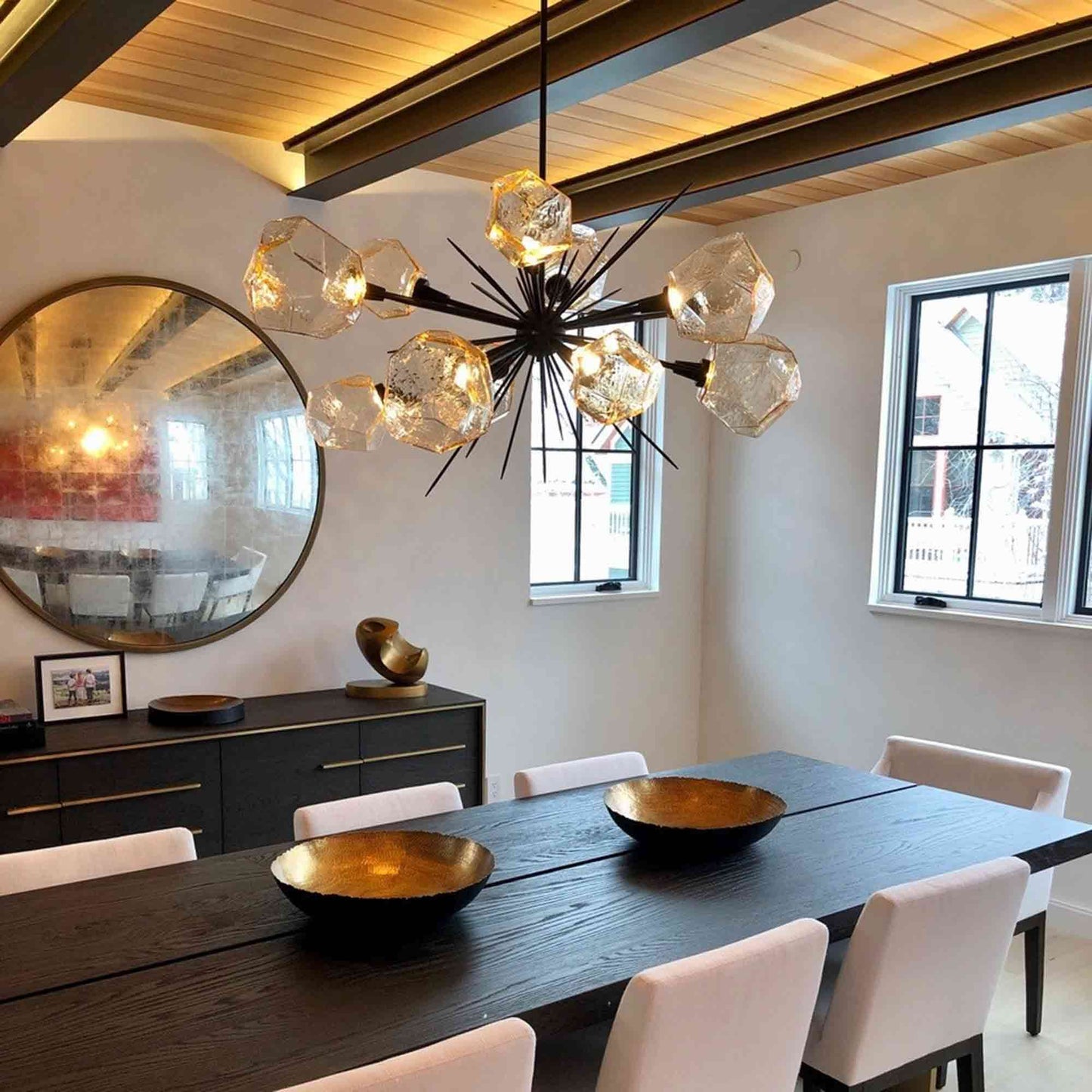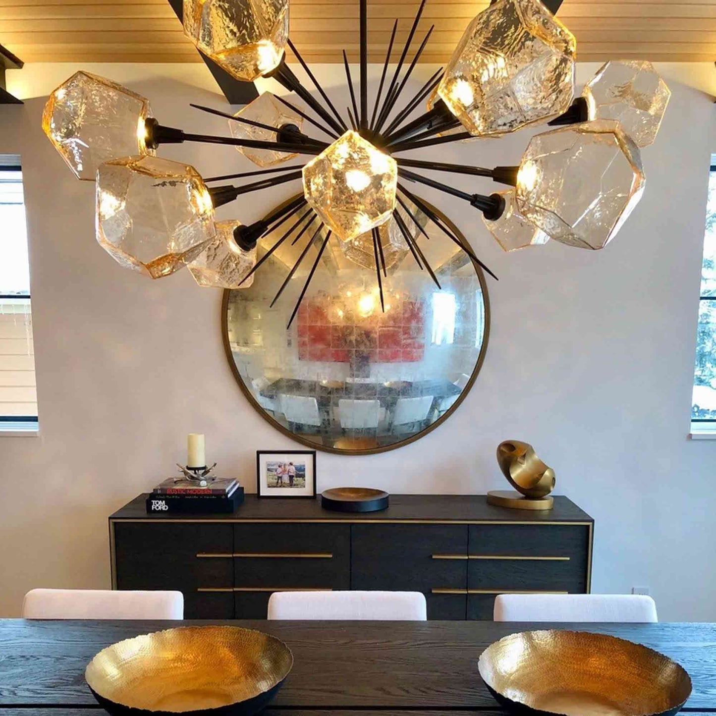 An explosion of sophistication, the Gem Oval Starburst LED Chandelier from Hammerton Studio is a dynamic addition over a dining table or in an entry. Metal shards reinforce the starburst motif while faceted, blown glass shades bring organic flair to any space.