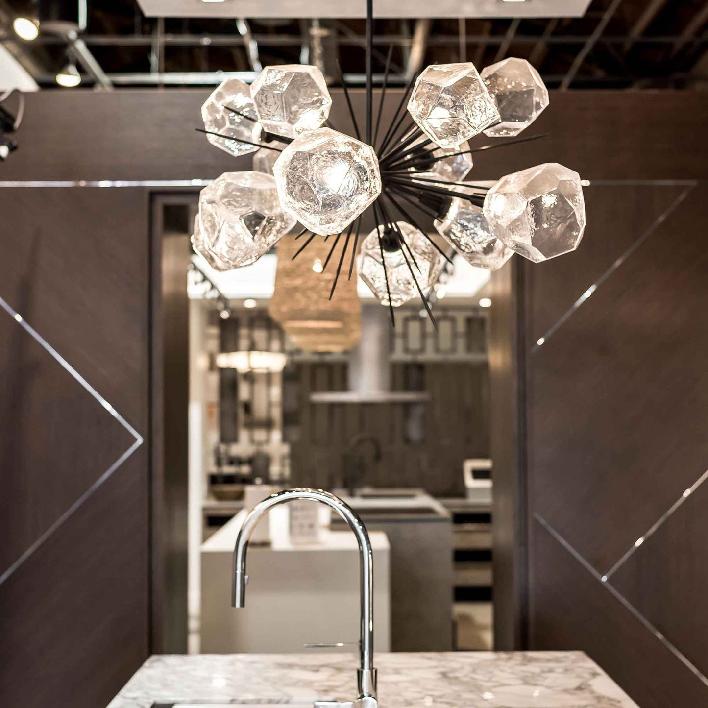 | Customers with especially refined tastes will gravitate to Hammerton Studios’ hand-crafted lighting collections. The designers transform classic shapes into new forms, capturing the essence of light and blown glass. Nothing extraneous distracts from the pure design statement. Chandeliers, for example, may spring undulating blossoms or radiate geometric pendeloques, making entryways or dining areas unforgettable. A vertical sconce sports crystals of light that turn a simple hallway into an art gallery. Parallel linear suspension lights, illuminated by LEDs, perfectly suit an urban loft. Recycled glass finds its way into luminaires with an ice-like sparkle. |