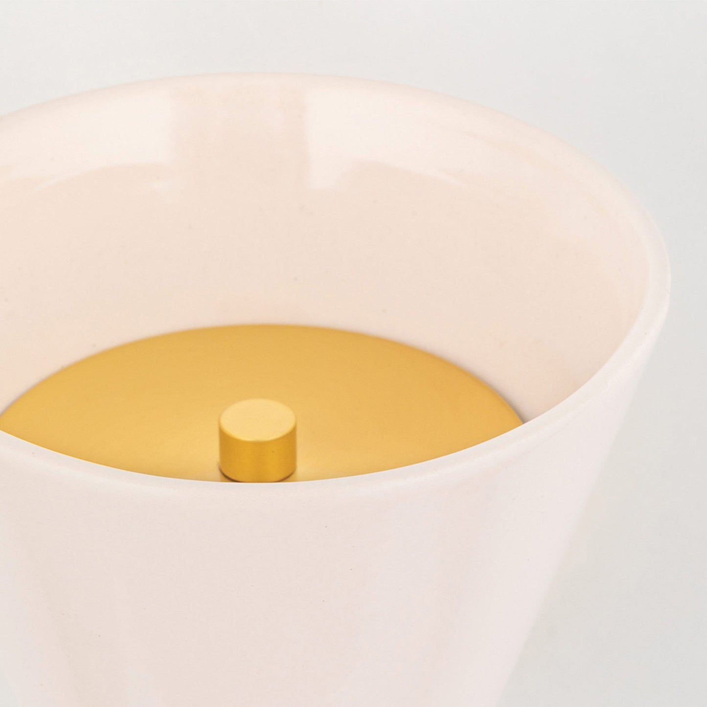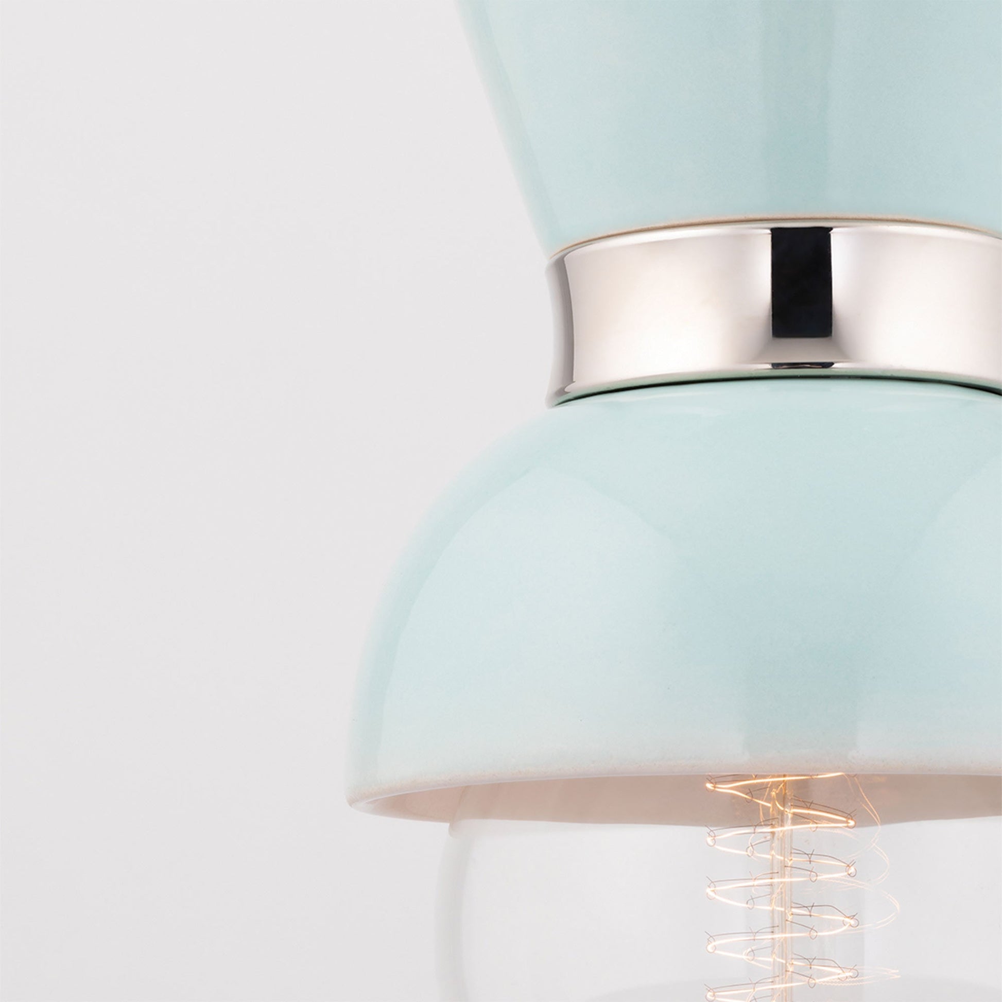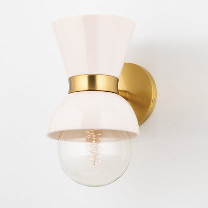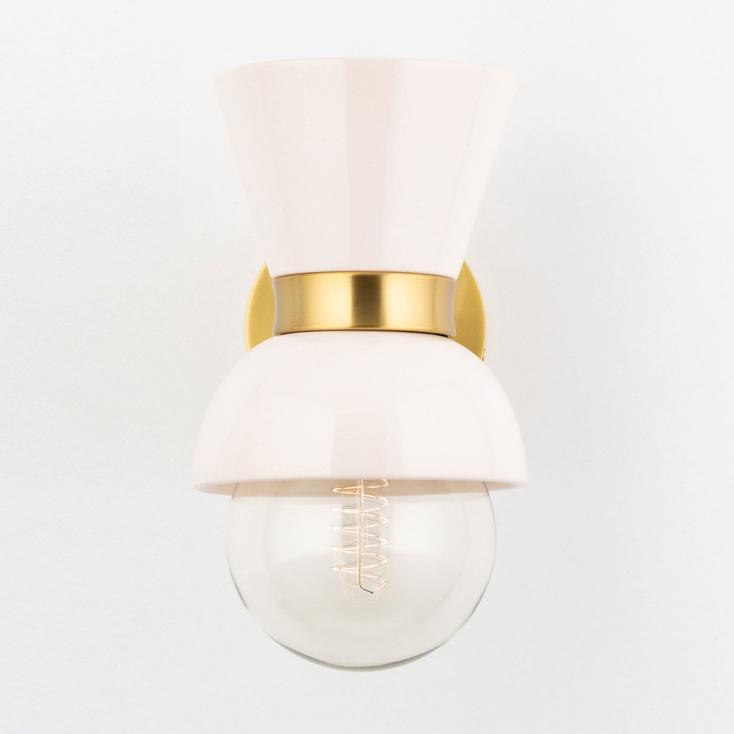 Sleek, glossy ceramic creates the hourglass shade of the boldly modern Gillian Wall Light from Mitzi. A metallic band warms the ceramic while an exposed bulb adds an industrial finishing touch.