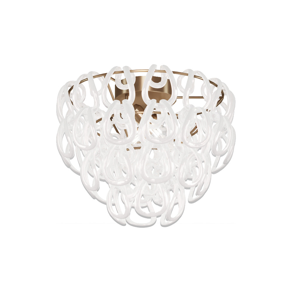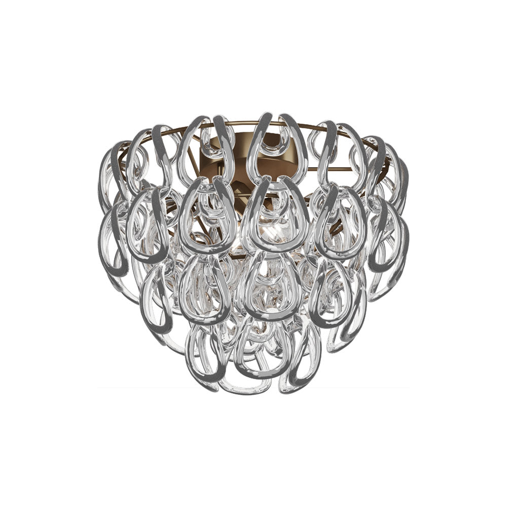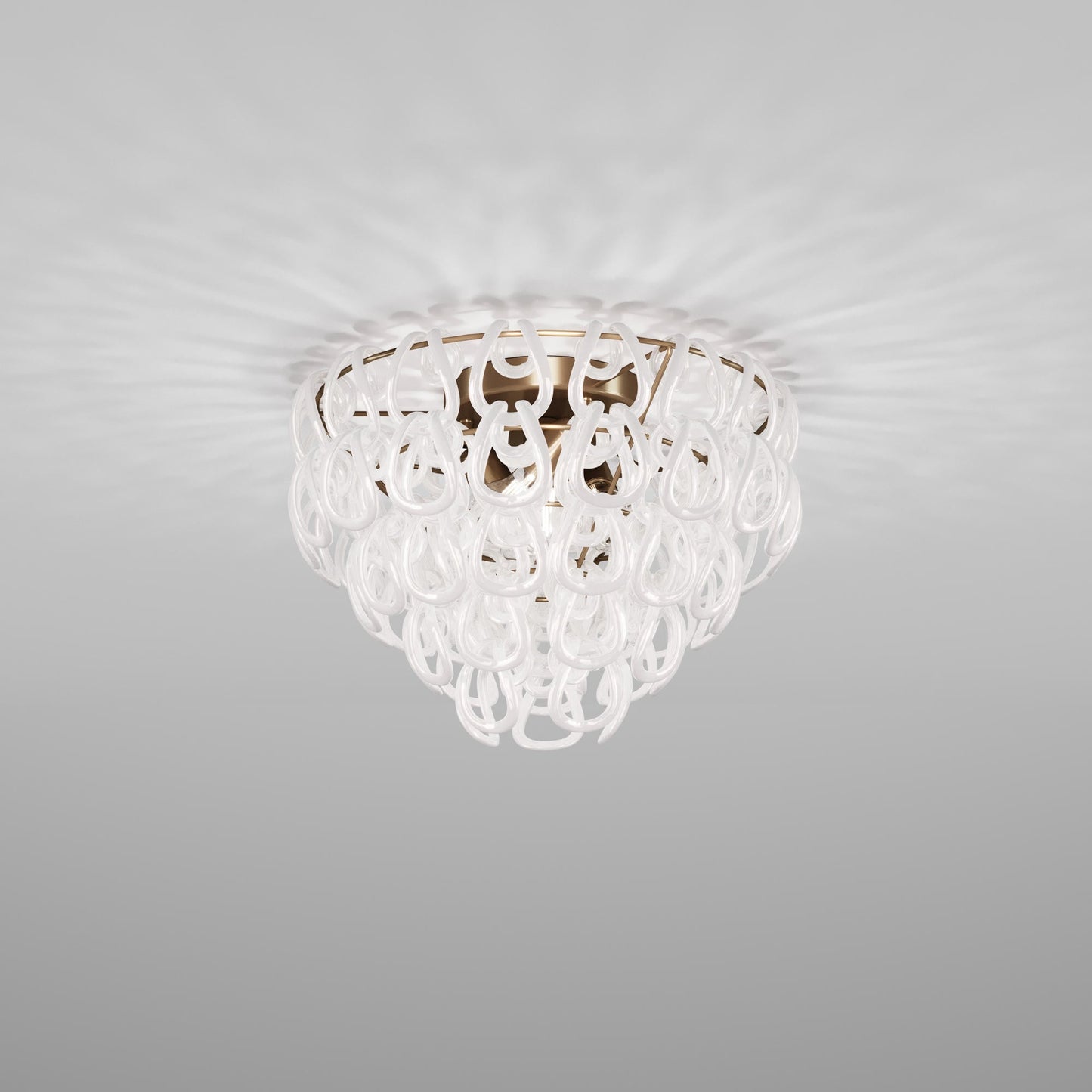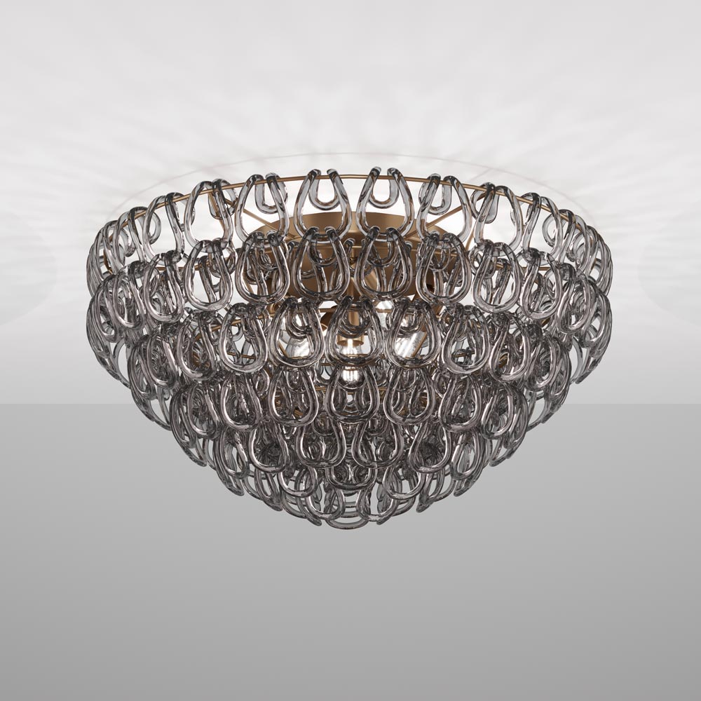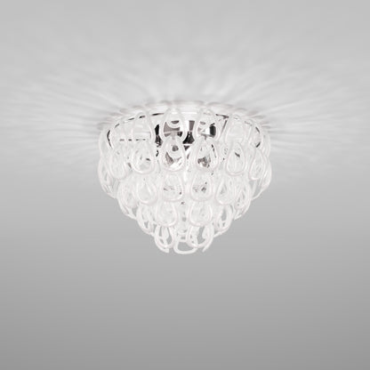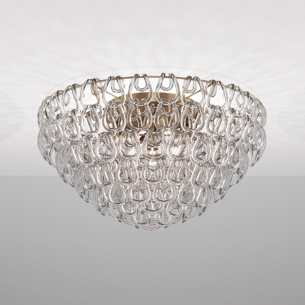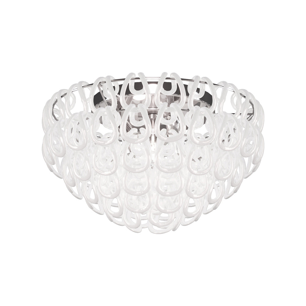 A unique blend of fine art and boho style adds a chic look to any space when the Giogali Flush Mount Ceiling Light from Vistosi becomes a central focus. Tapered silhouetting follows rows of delicate glass loops aligned around metal framing, offering a romantic effect in light reflection and transforming a living space into a gallery setting.