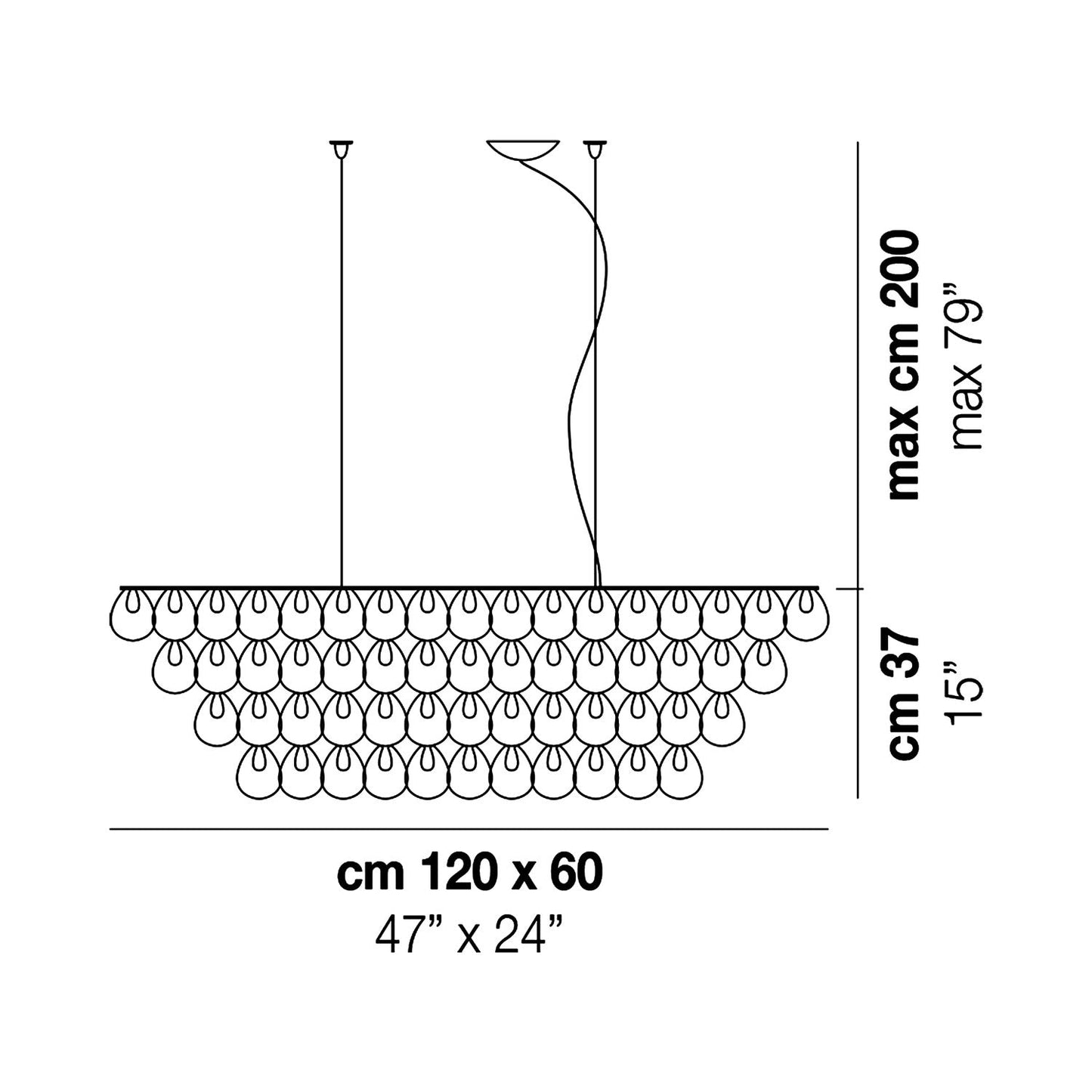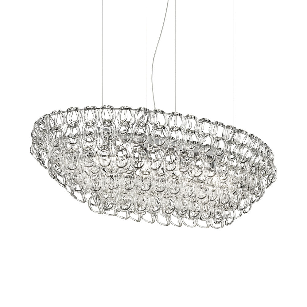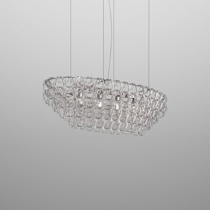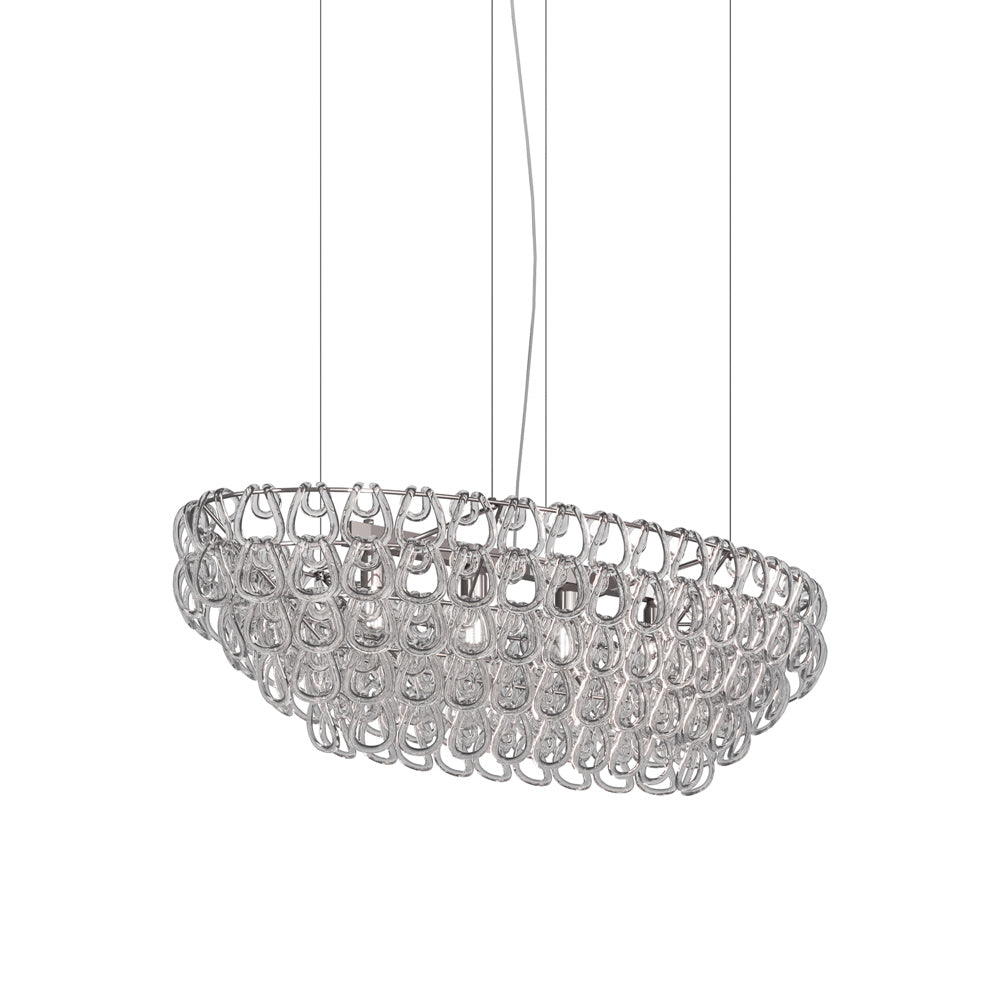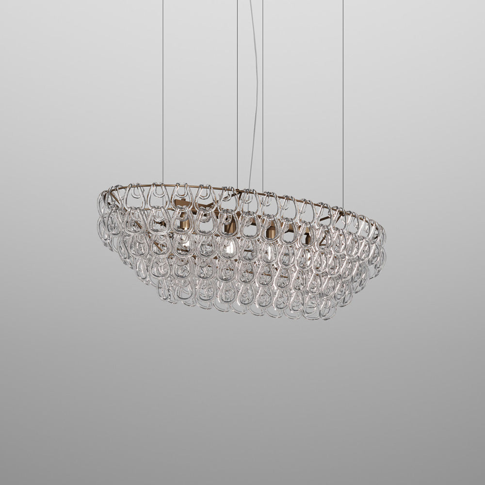 Artistry in lighting reflects beautiful, luxurious styling and becomes a central focus in a custom setting. The Giogali Oval Pendant Light from Vistosi loops delicate clear glass figures over a layered metal frame, creating a basket-like look and a chic way to reflect ambient lighting over a kitchen island or entertaining space.