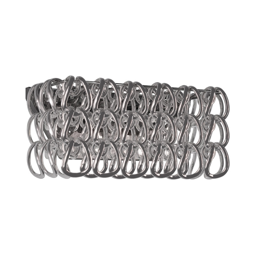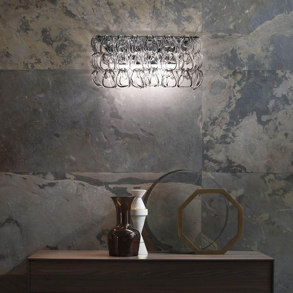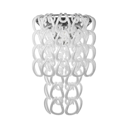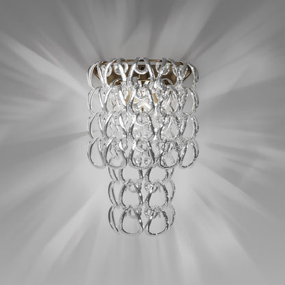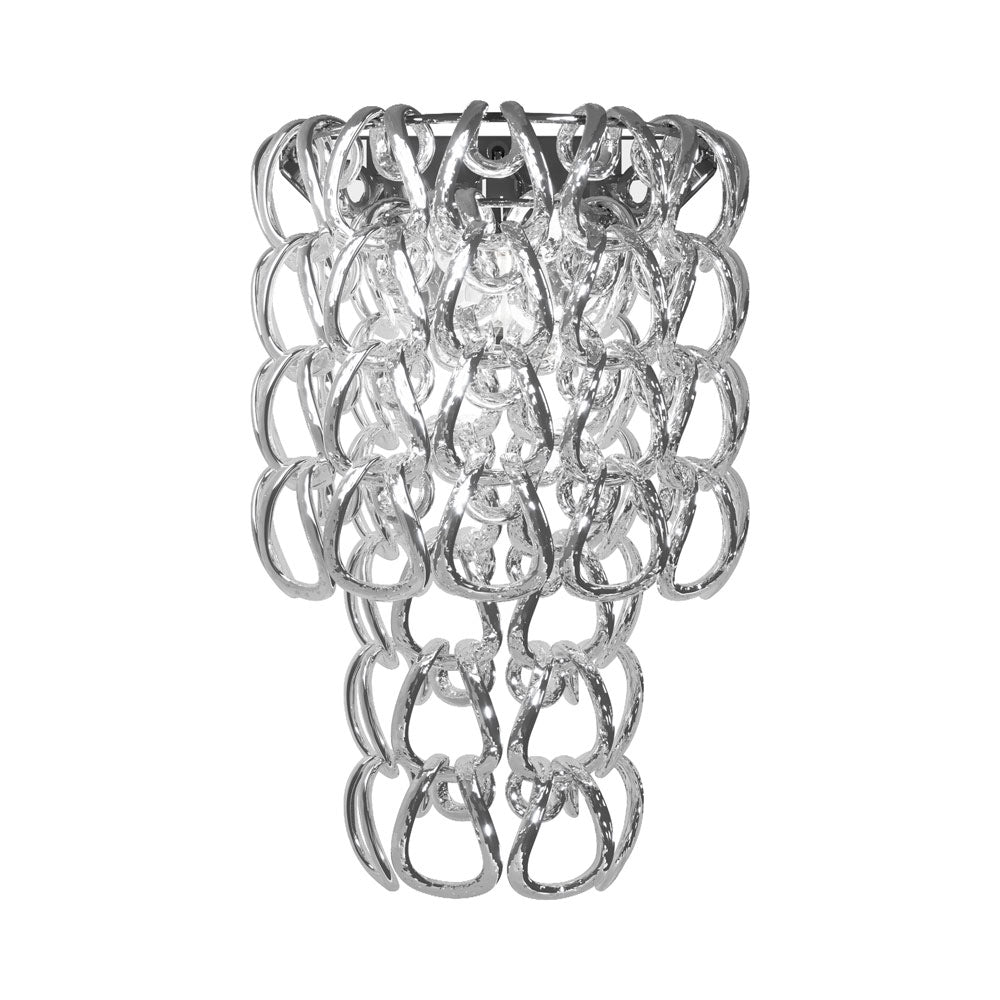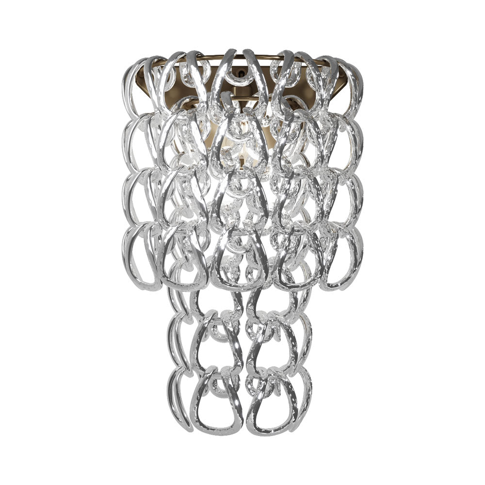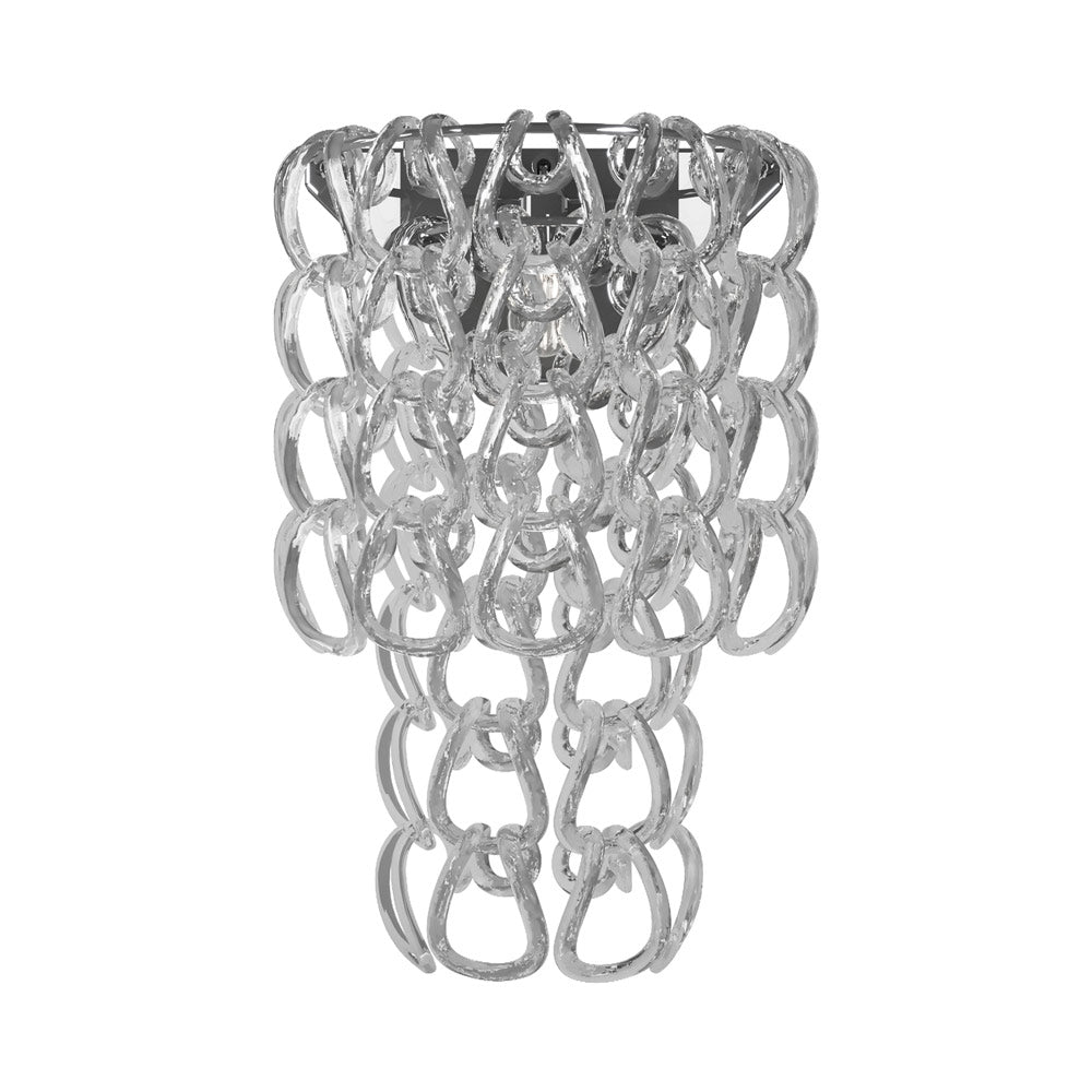 Work the Giogali Wall Light from Vistosi into a stylish interior setting, embracing the reflective power of glass in lighting and a striking industrial vibe. Chain-like links of delicate glass cascade over metal framing, creating a visually enticing effect with extraordinary personality.