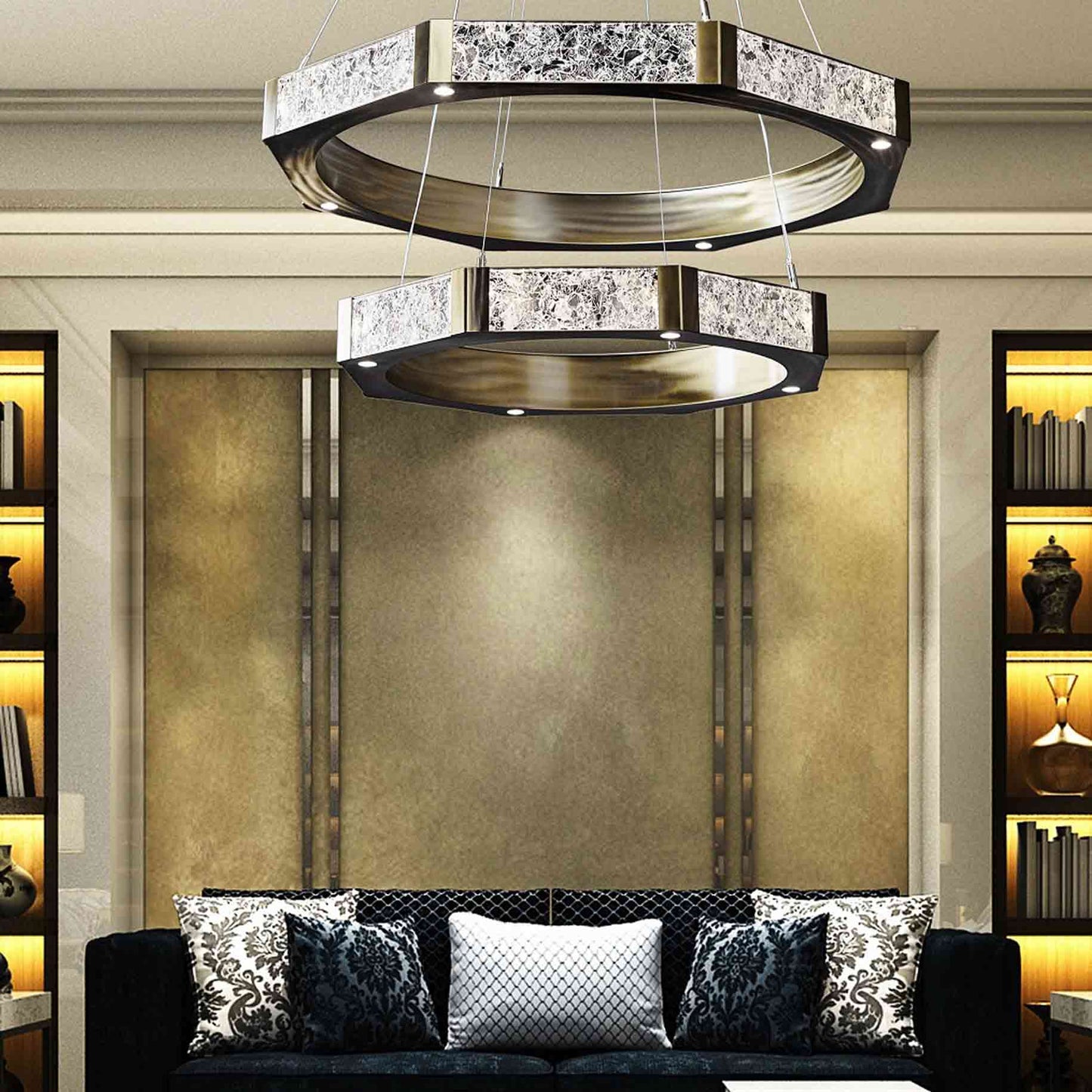 Artisan glass pairs with chic metalwork to create a bold, impressive look for the Glacier Double Tier LED Chandelier from Hammerton Studio. Uniquely crafted, each icy glass panel glitters and glows when energy efficient LED lighting is illuminated over a living or dining room.