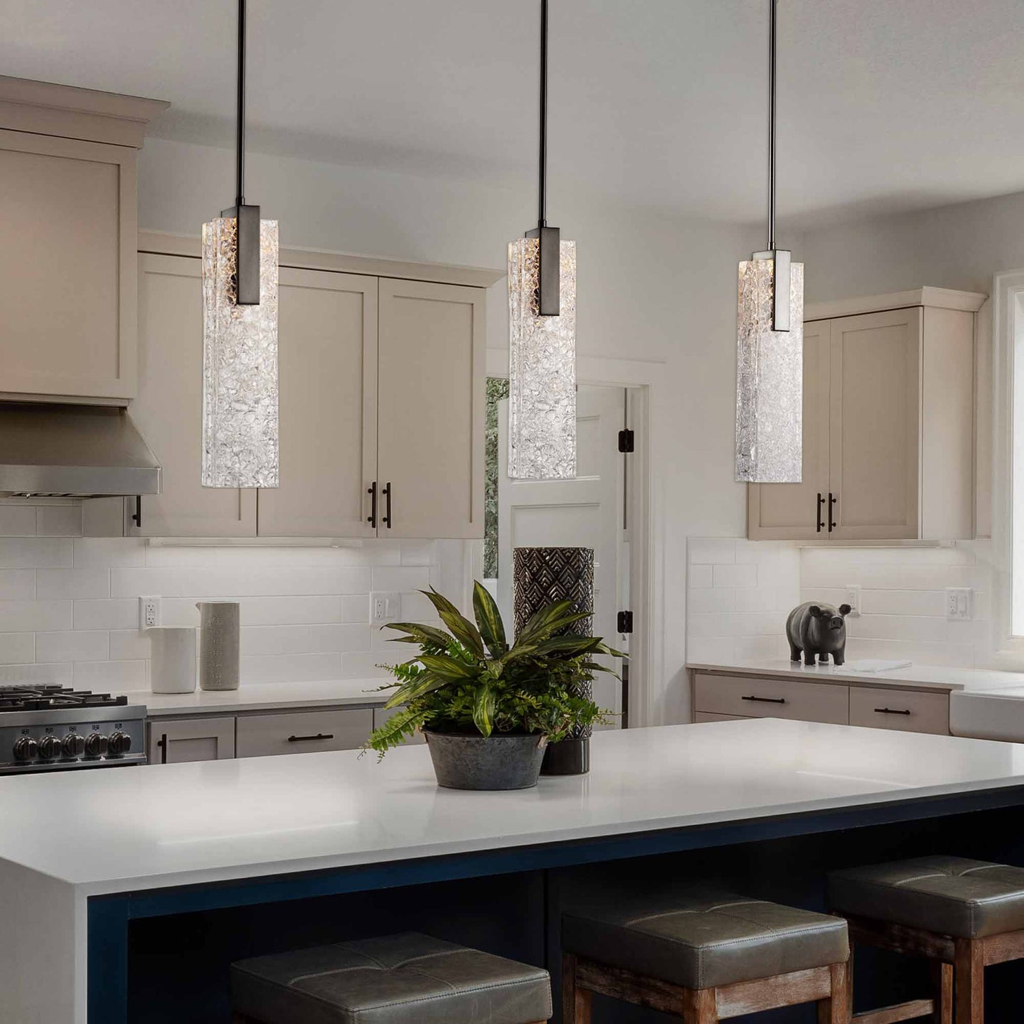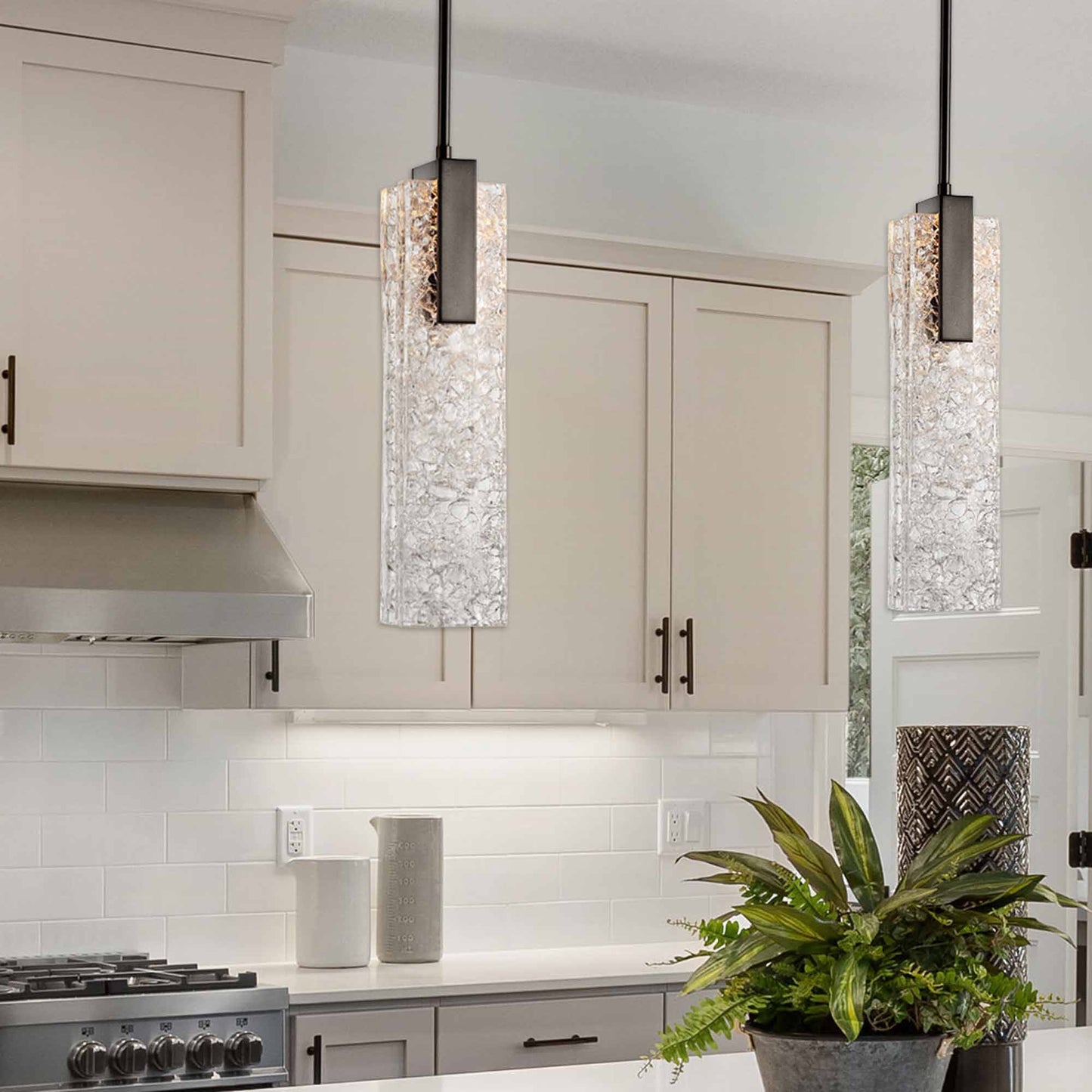 Sparkling like diamonds, unique textured glass creates a bold, dimensional look for the Glacier LED Pendant Light from Hammerton Studio. A sleek block of glass is bracketed with smooth metal to create a juxtaposition of textures designed to impress in any room.