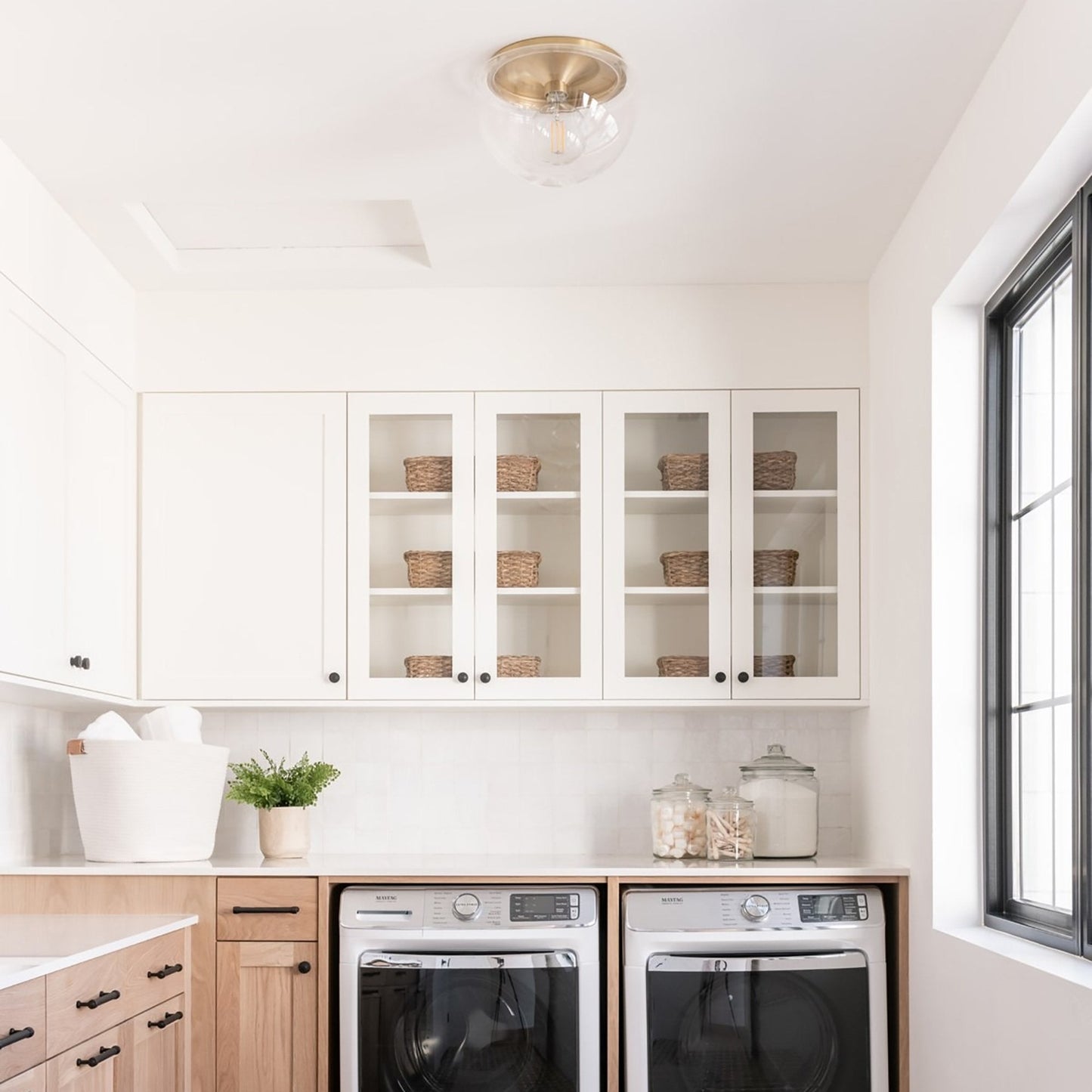 A straightforward design with a clean, classic vibe, Grace Round Flush Mount Ceiling Light from Mitzi elevates the look of modern décor. Featuring a single bulb surrounded by a clear glass shade with metal accents offered in two rich finishes, this piece radiates subdued elegance and no-nonsense style.