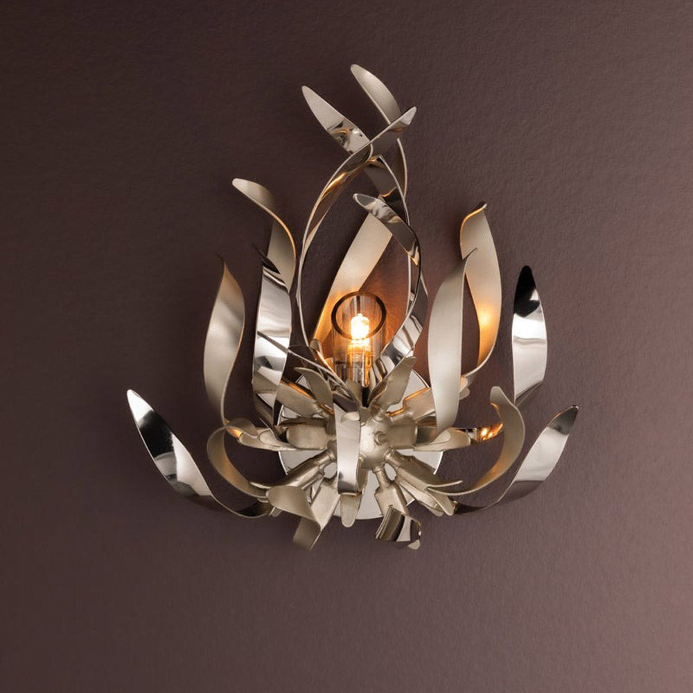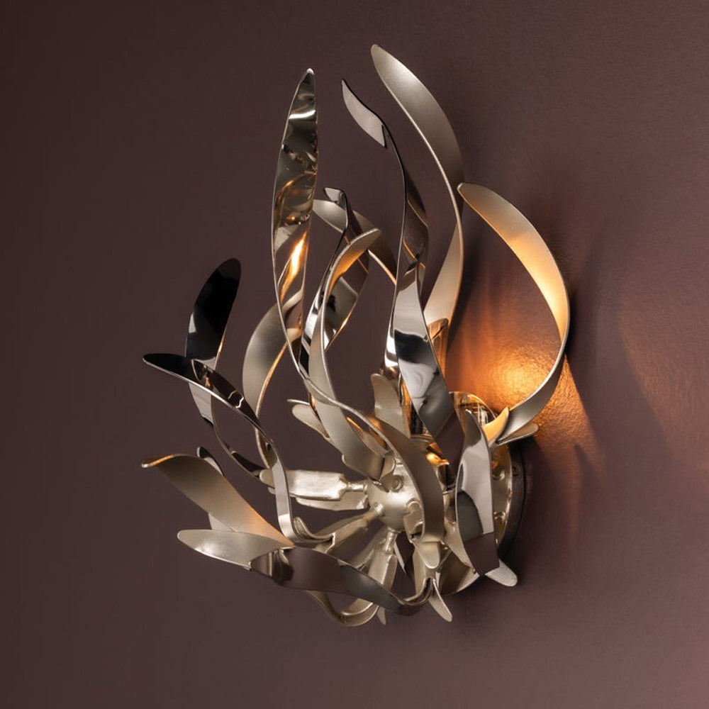 Delicate artistry shows off a glam design in the Graffiti Wall Light from Corbett Lighting, adding a tempting display of twisting metal ribbon-like bands of silver leaf polished stainless steel and transforming a living or dining space into a gallery haven.