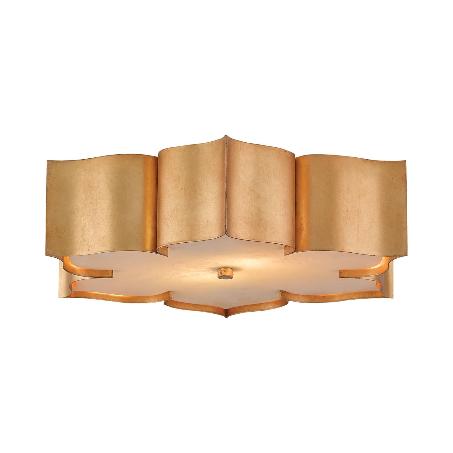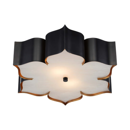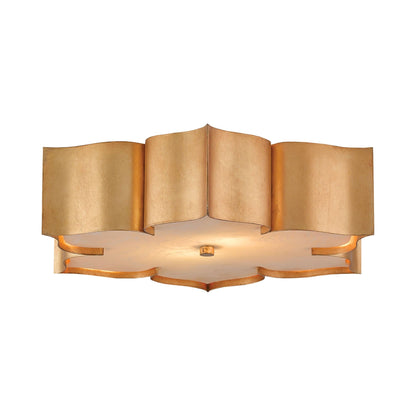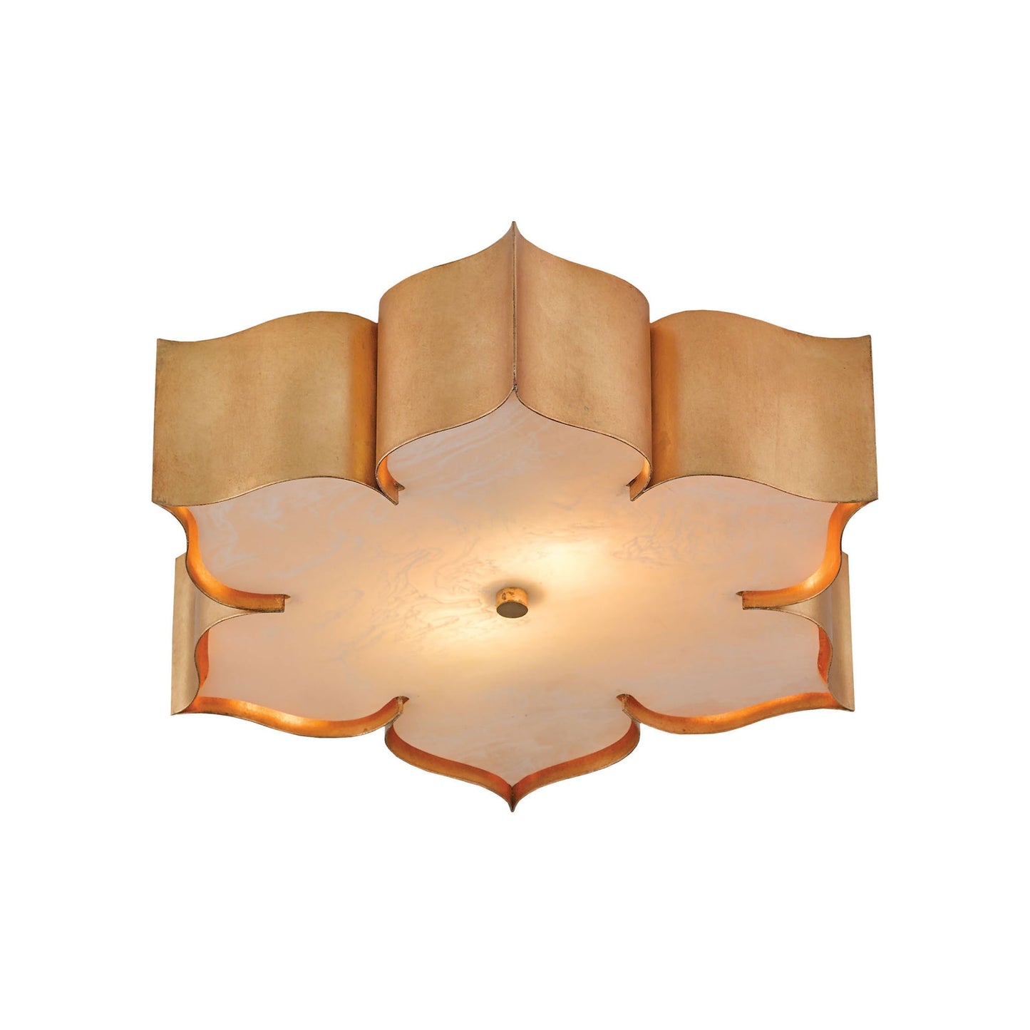 Exquisite craftsmanship and organic design are in full display with the Grand Lotus Flush Mount Ceiling Light from Currey and Company. Sheets of wrought iron receive a glowing antique gold finish and are fashioned to create the silhouette of a lovely lotus bloom. An acrylic diffuser softens its illumination while creating a soothing sense of elegance.