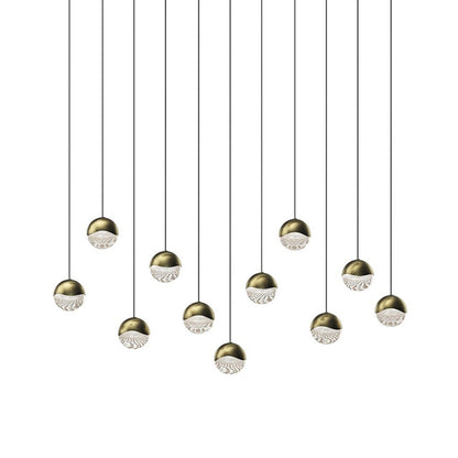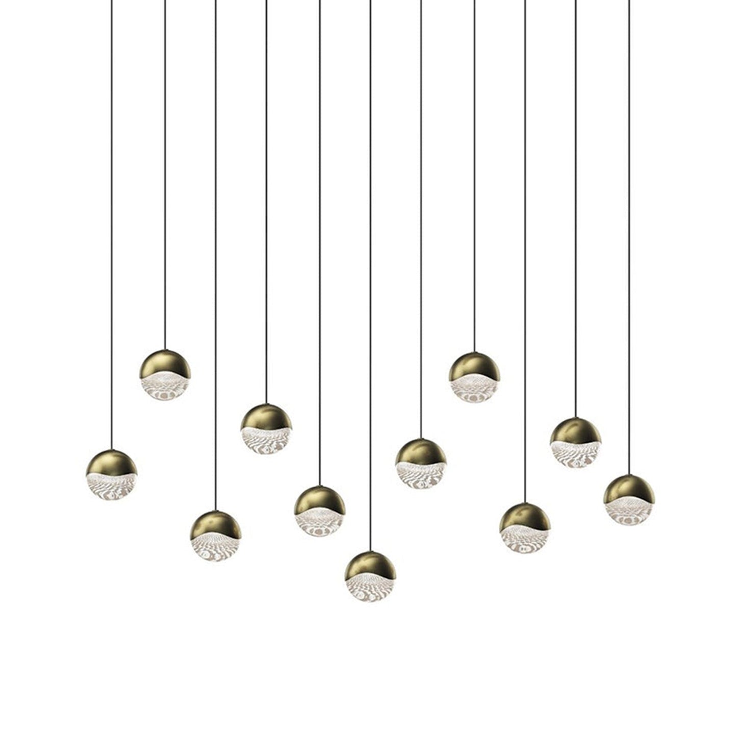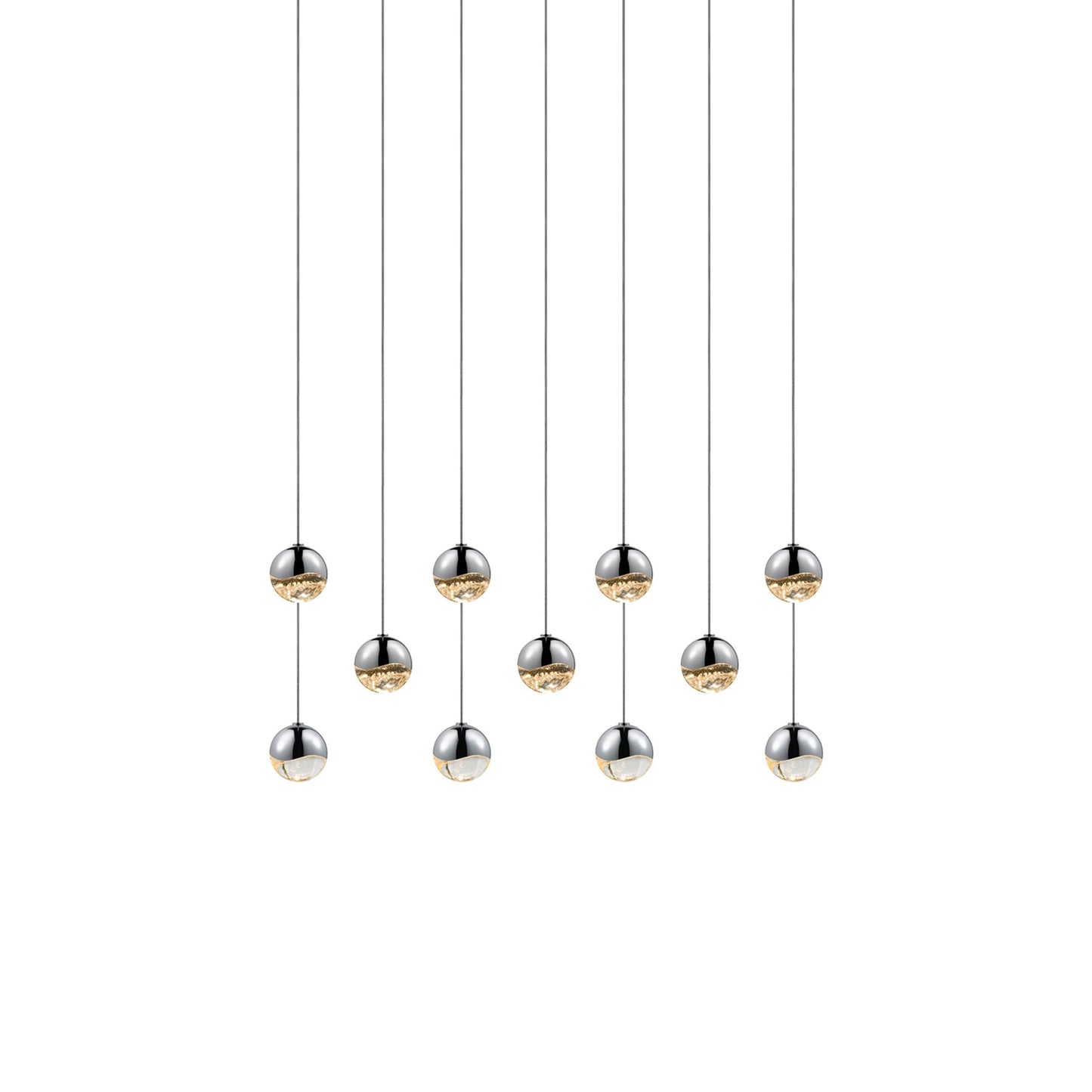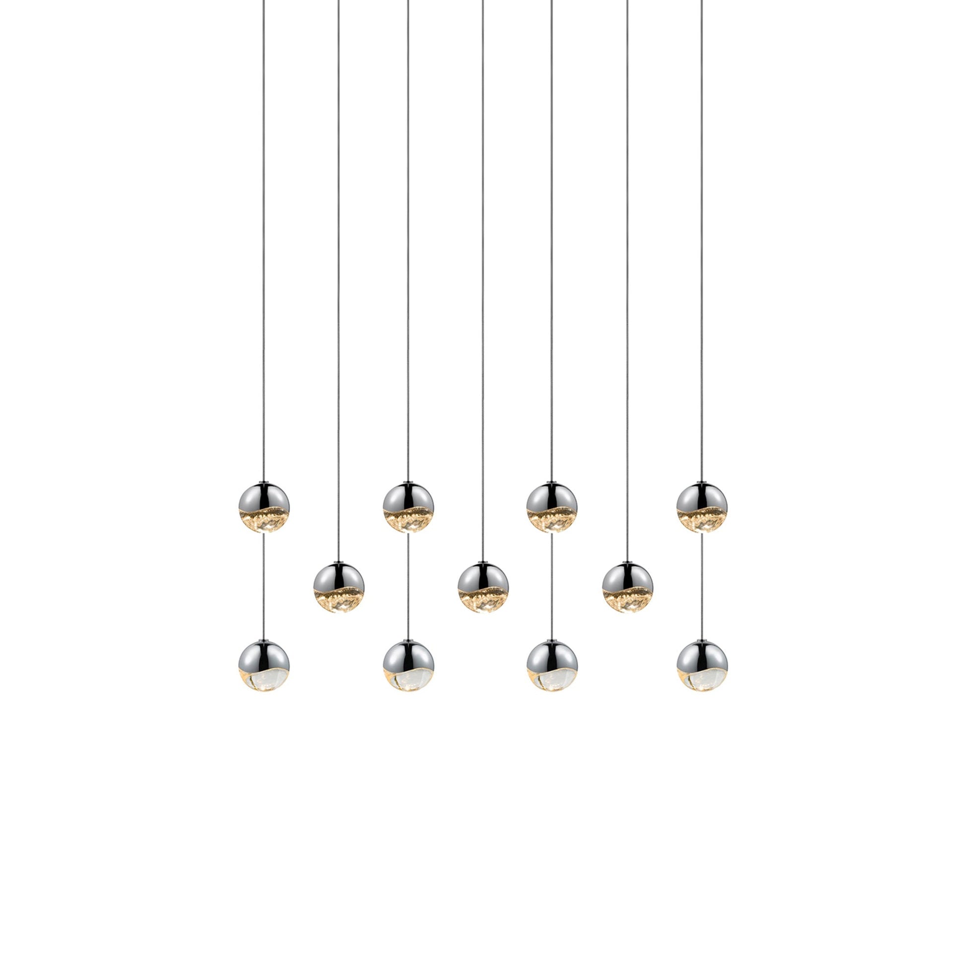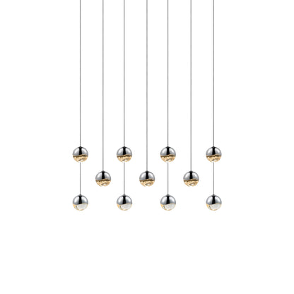 Borrowing from a holiday glam aesthetic, the elegant Grapes® 11-Light Rectangle LED Multipoint Pendant Light from Sonneman Lighting offers gleaming, dimmable illumination from staggered orbs made of metal with glass lenses and presenting a chic gallery motif in the process.
