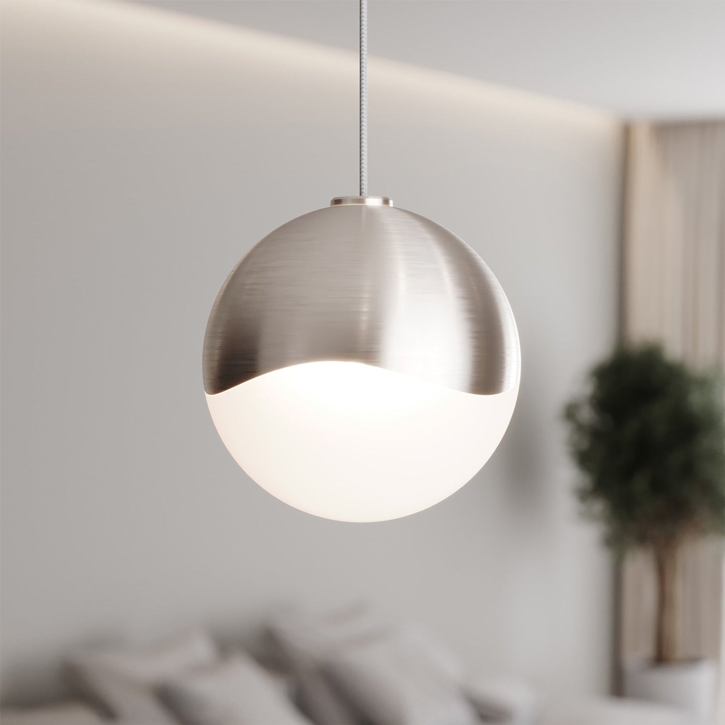 A single glass and metal orb shade suspends from a metal canopy, offering a stunning look to the contemporary Grapes® LED Pendant Light from Sonneman Lighting and infusing dimmable targeted lighting in a modern space.