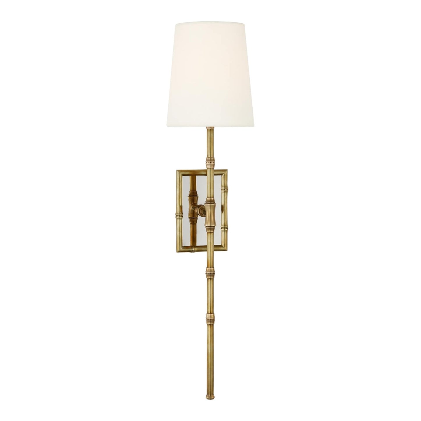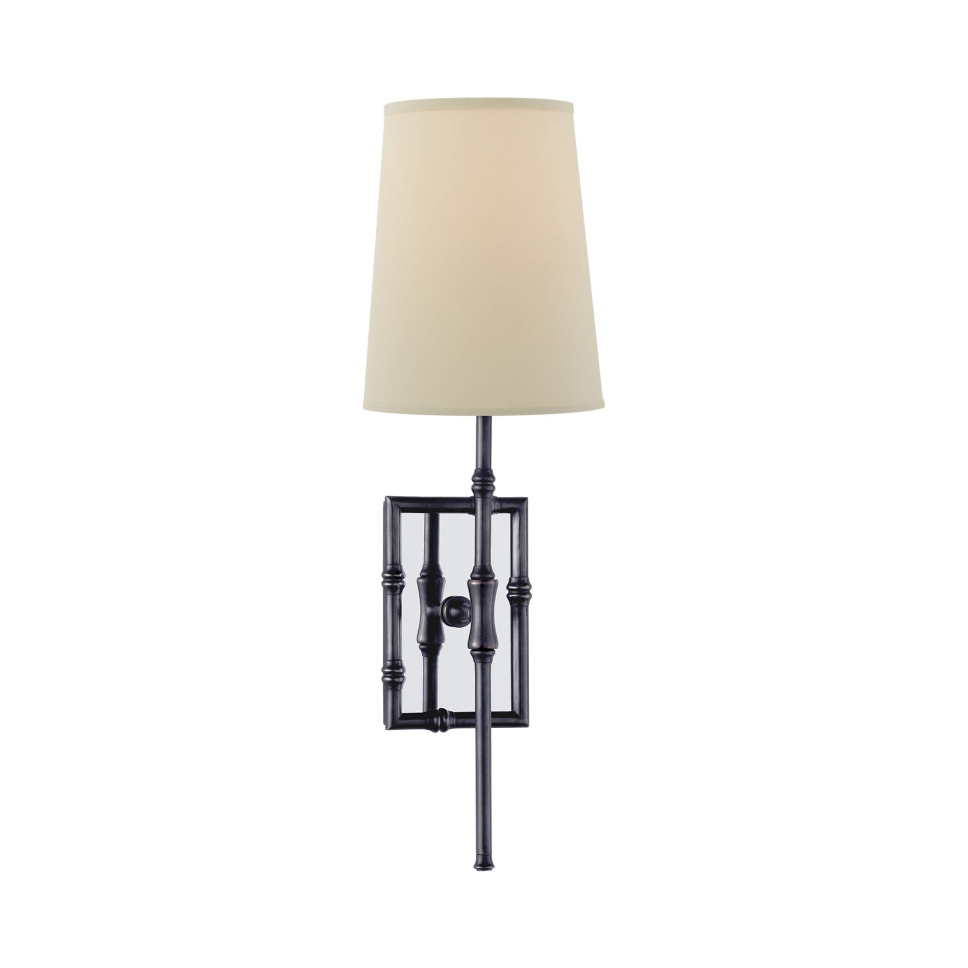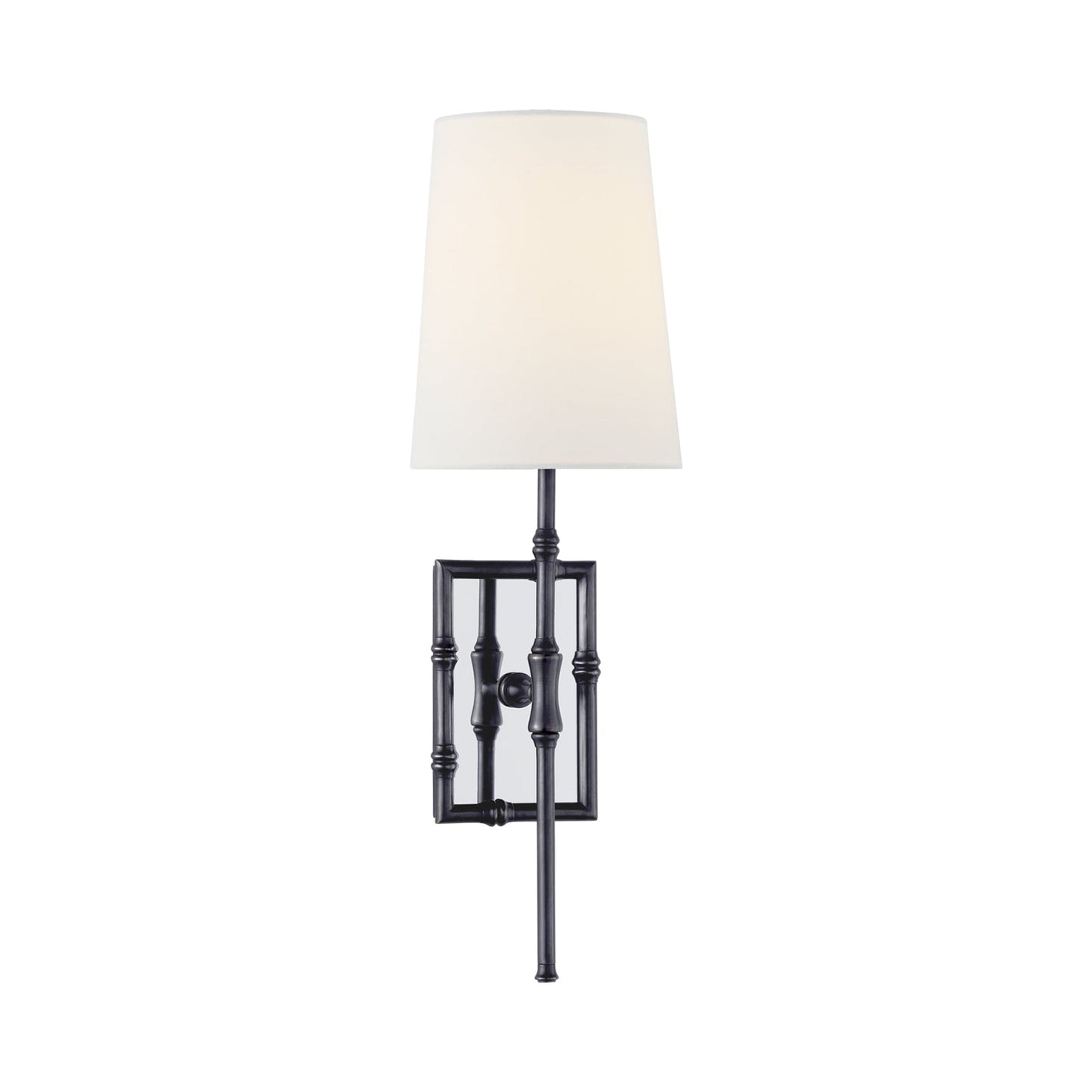 A sleek contemporary vibe reflects island inspiration in the Grenol Modern Wall Light from Visual Comfort Signature, delivering just a hint of retro influence and substantive simplicity in its elegance. Metal framing offers bamboo-like knotting detail to a rectangular framed mirror wall plate and a light stem perfectly dissecting it. A tapered natural percale shade repurposes the soft traditional element with casual vibes.
