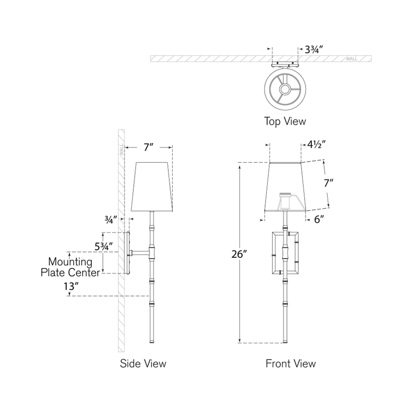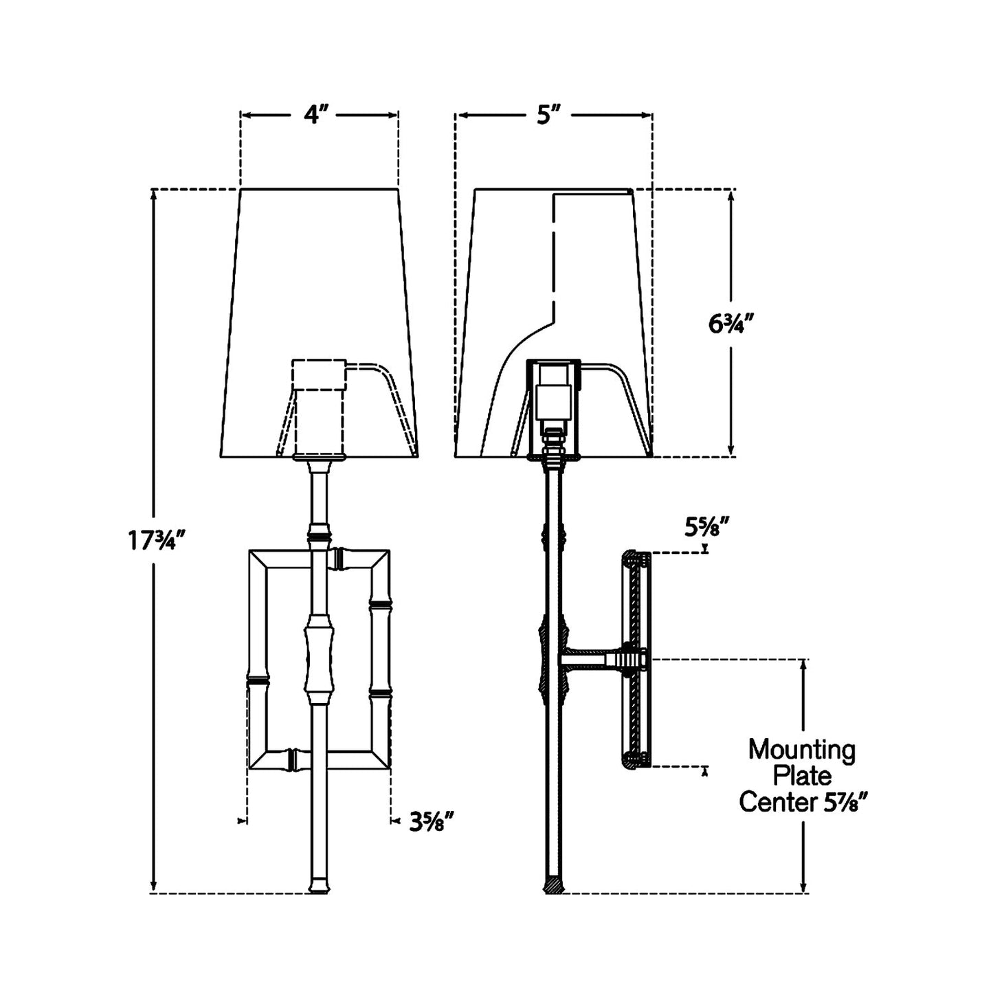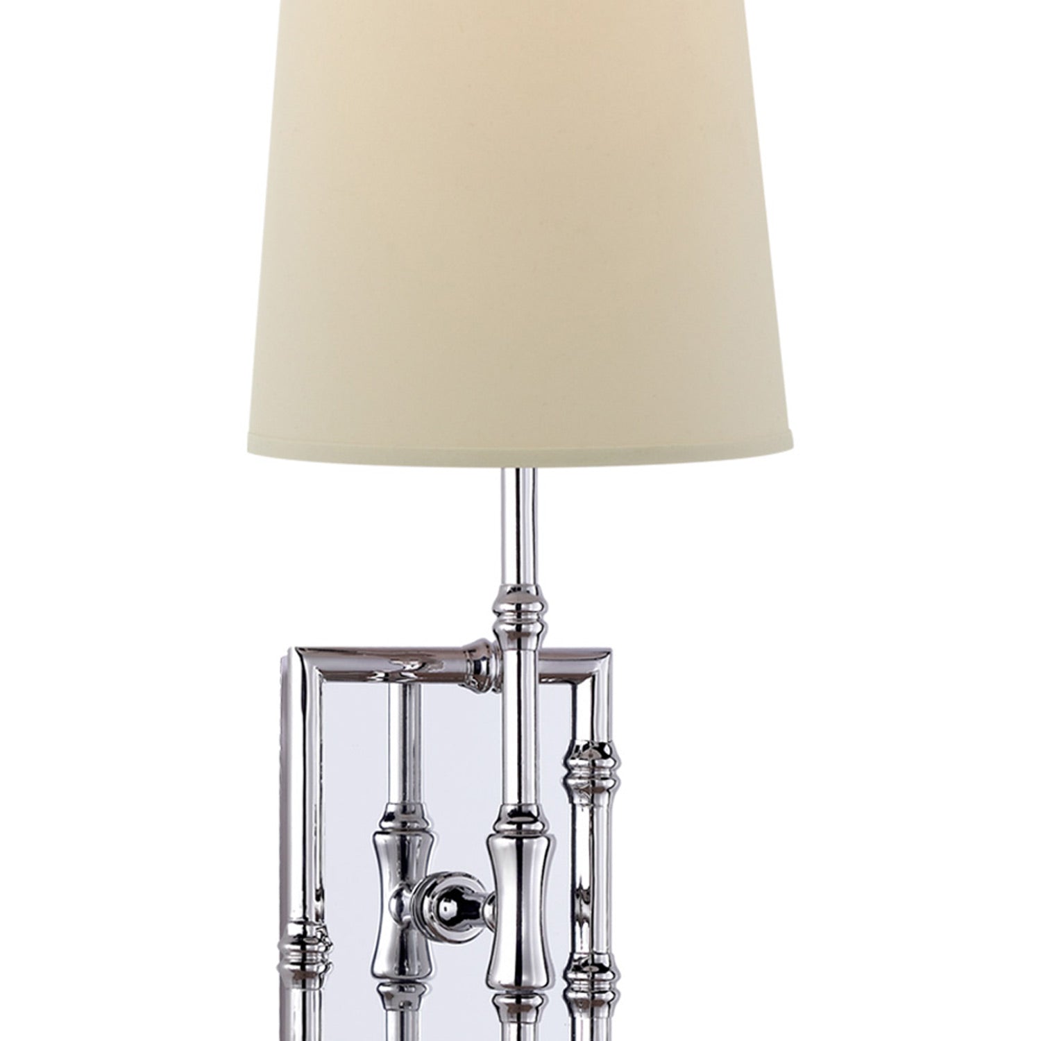 A sleek contemporary vibe reflects island inspiration in the Grenol Modern Wall Light from Visual Comfort Signature, delivering just a hint of retro influence and substantive simplicity in its elegance. Metal framing offers bamboo-like knotting detail to a rectangular framed mirror wall plate and a light stem perfectly dissecting it. A tapered natural percale shade repurposes the soft traditional element with casual vibes.