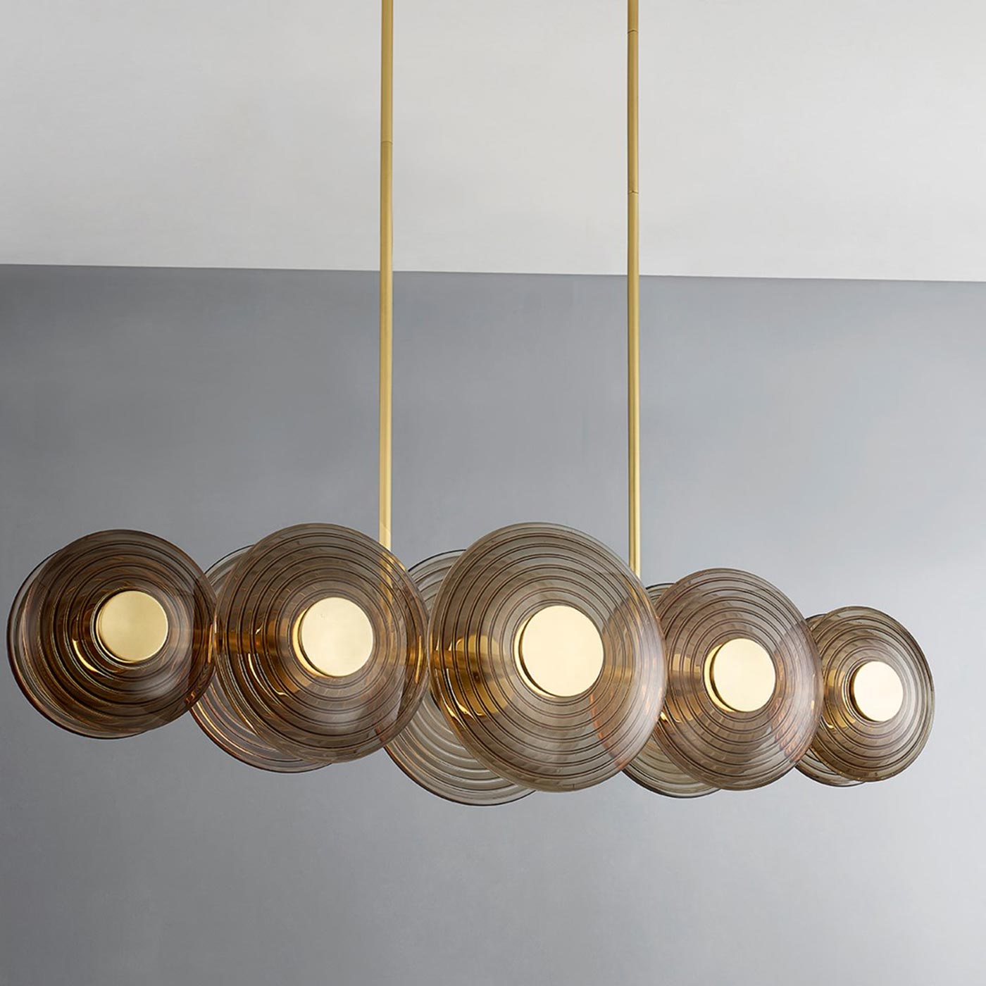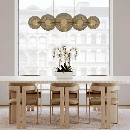 Creative design elements borrow from iconic retro style as the Griston LED Linear Pendant Light from Hudson Valley Lighting offers a festive feel in a modern or transitional space. Working with elements creating optical illusions, this fixture blends graduated sizing of round diffusers with spiraling linear accents and linear, structured framing in warm aged brass metal. Grab a bit of Mid-Century Modern style to light up any space.