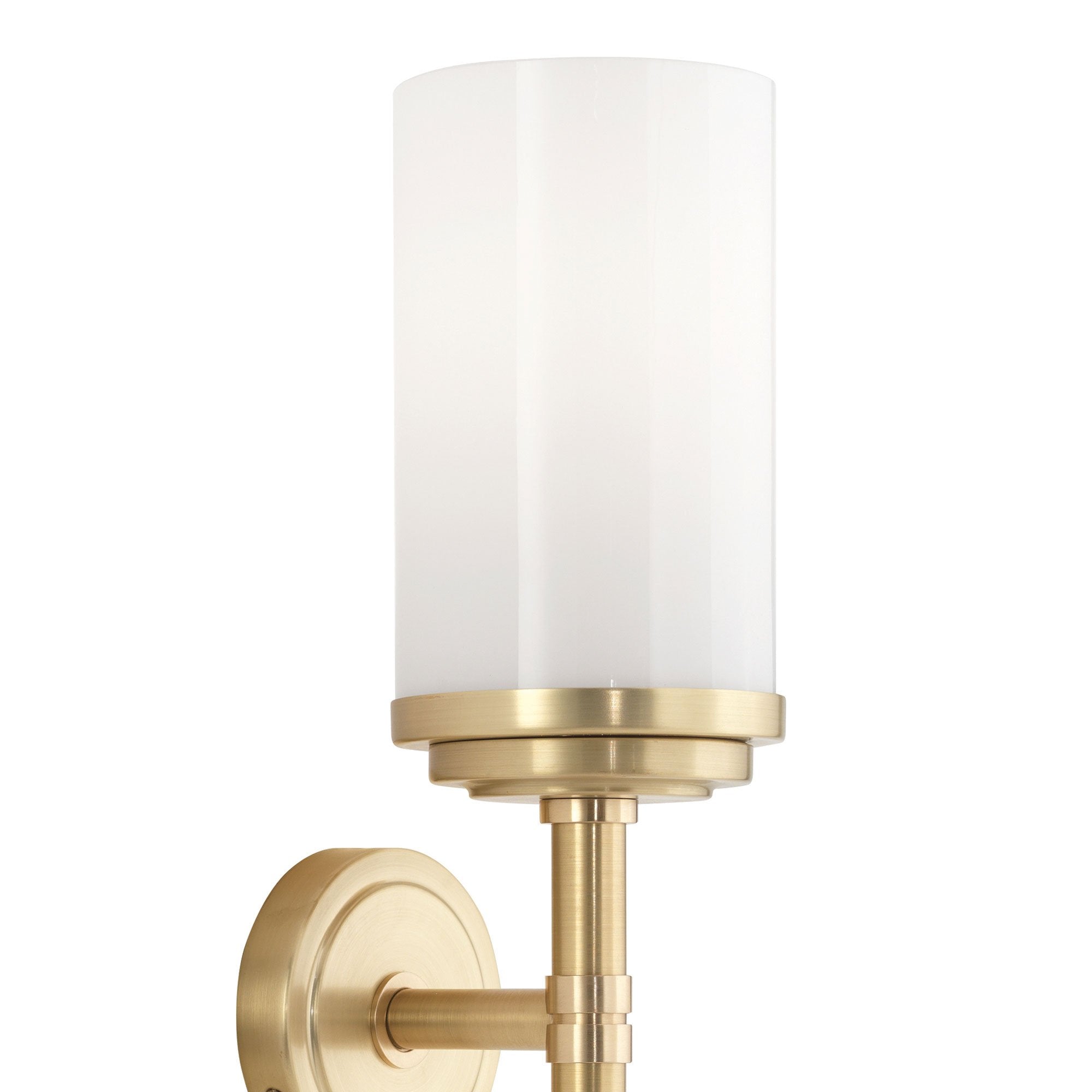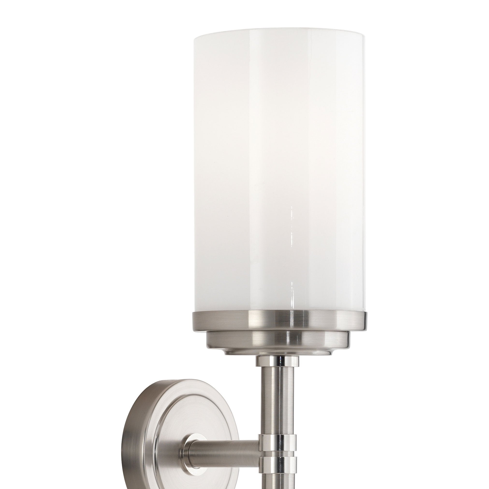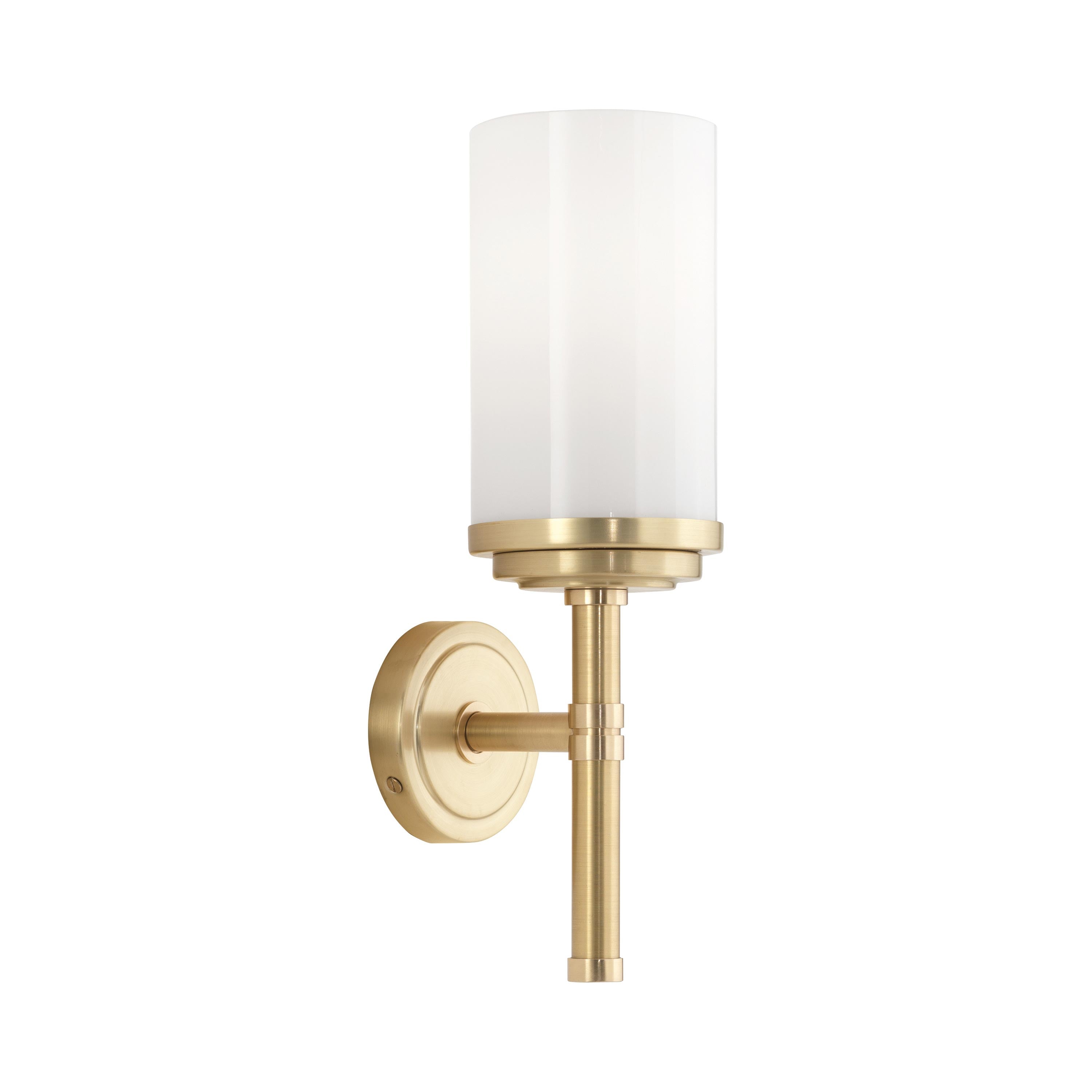 A cased white glass shade in a cylindrical silhouette becomes a central focus to the sophisticated design of this Halo Wall Light from Robert Abbey, bringing a tasteful minimalism to a modern living or bedroom space.