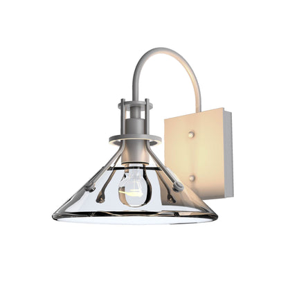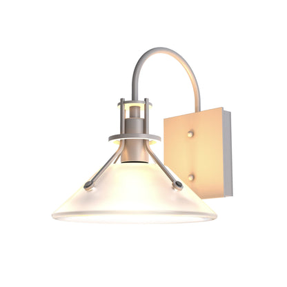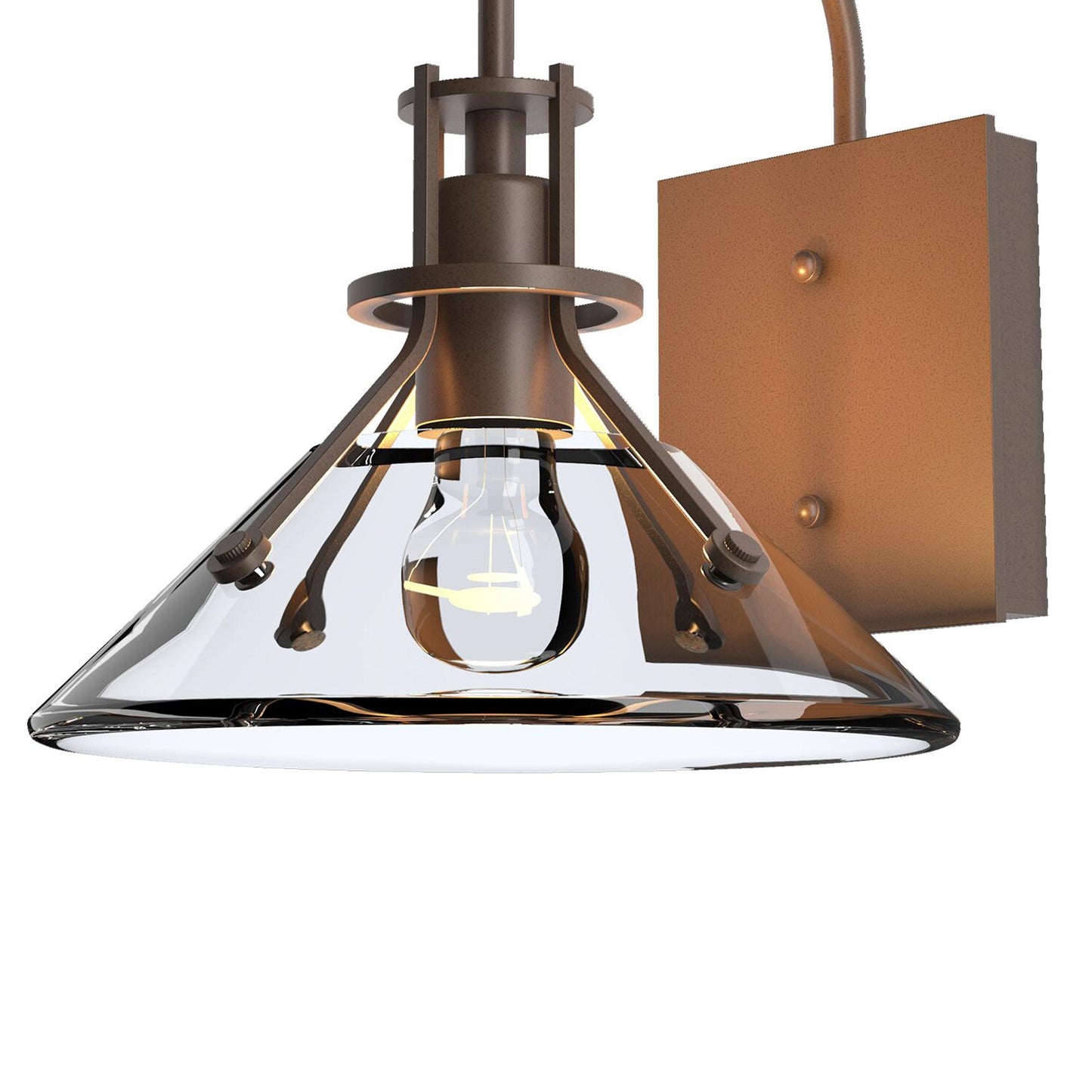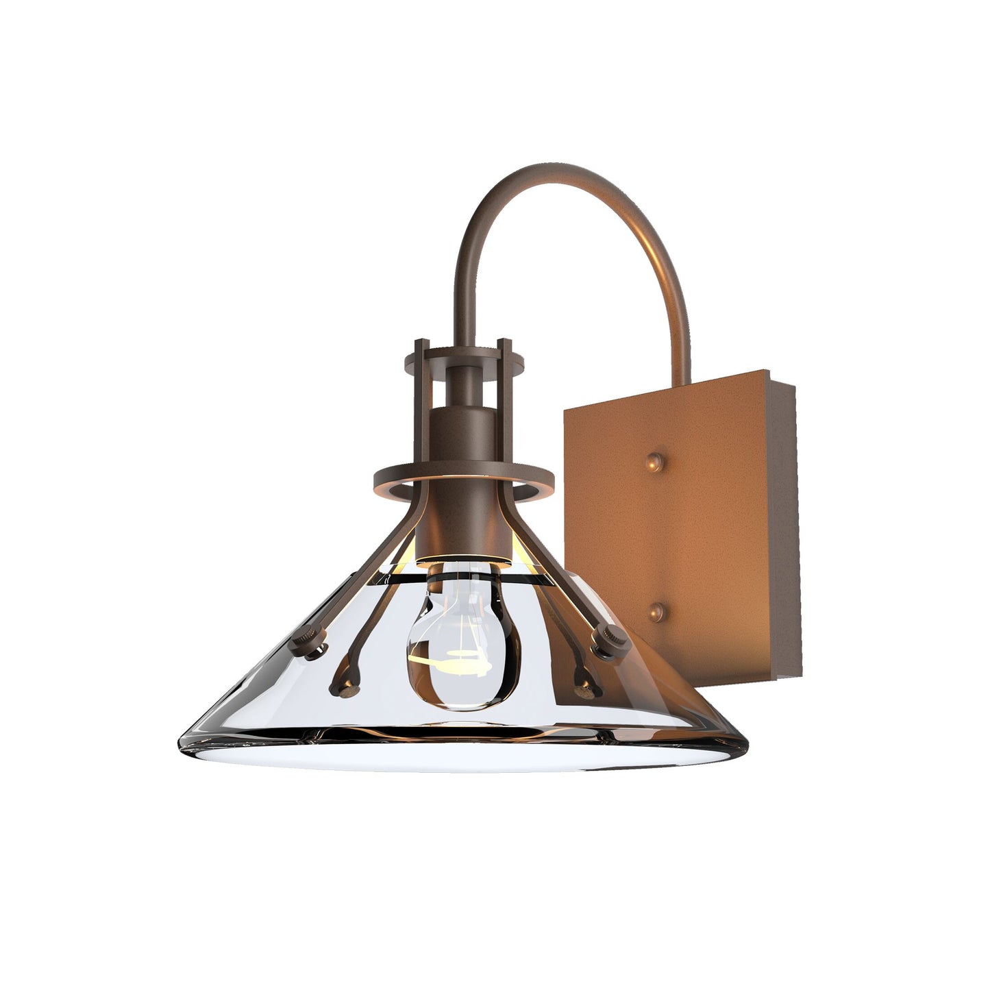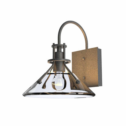 The Henry Glass Shade Outdoor Wall Light from Hubbardton Forge combines classic a touch of modern allure, featuring a dramatically curved neck for visual appeal.