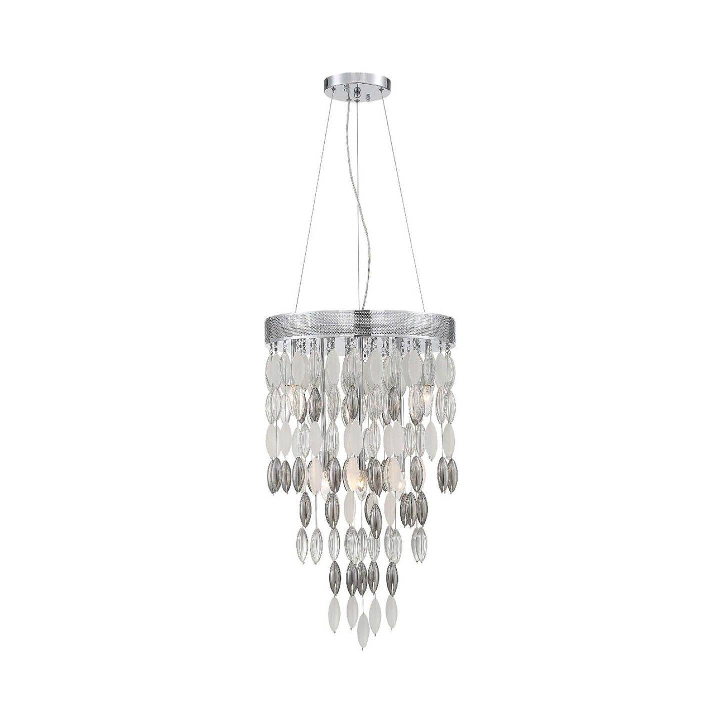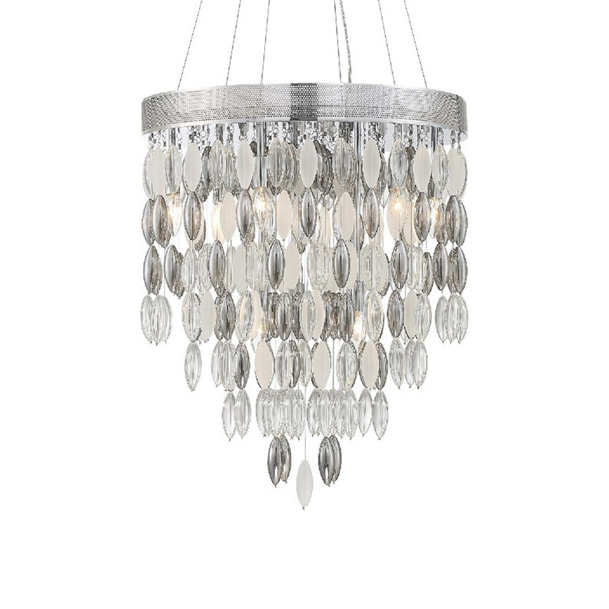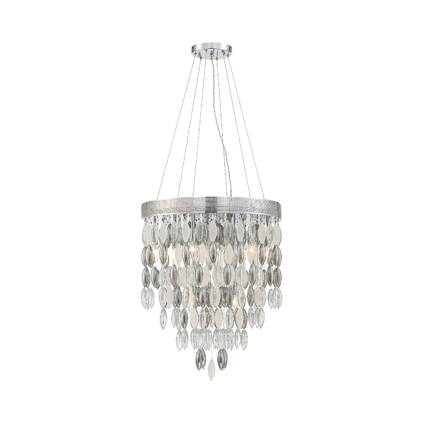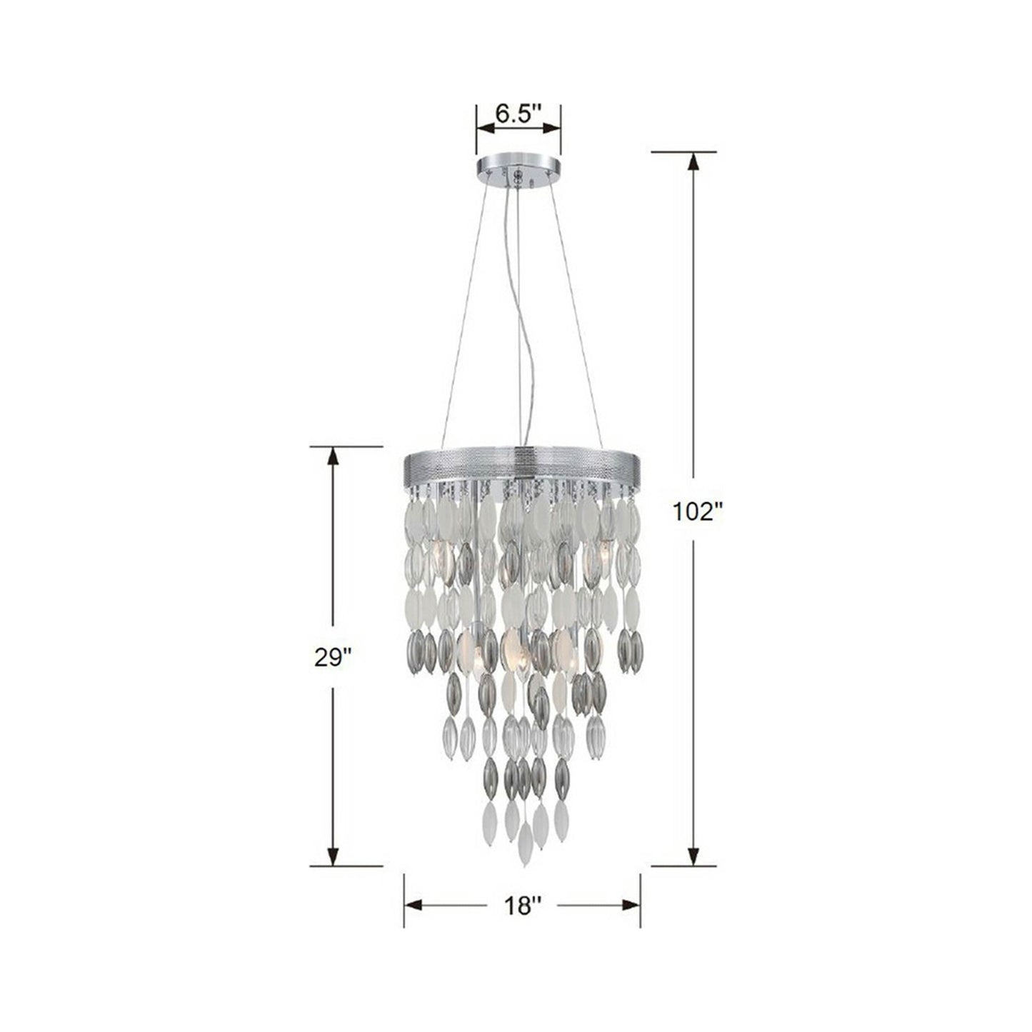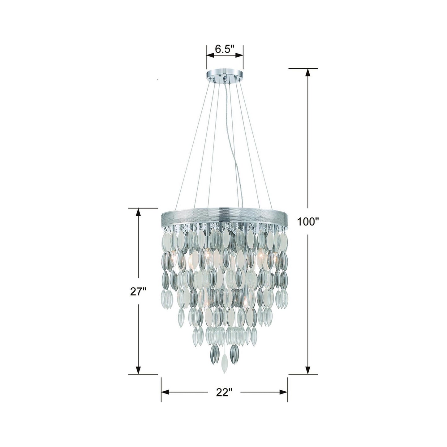 Exceptional artistry and an optically pleasing tapered silhouette create a light fixture that lifts the ambiance in a modern or transitional space. Indulge in measured glam with the Hudson Chandelier from Crystorama and appreciate the assortment of frosted, silver, and clear glass beads cut into leaf-like shapes. Layers of glass dangle from textural metal with a polished chrome finish, adding synchronous radiance and a tastefully sophisticated look.