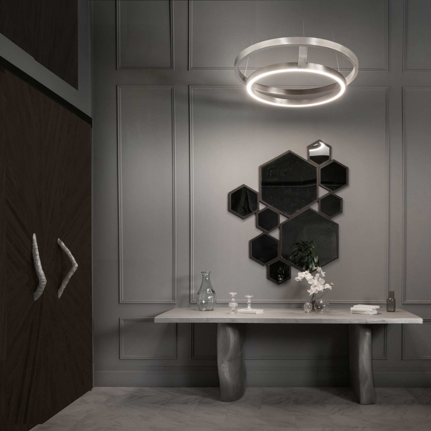 An architecturally scaled, two tiered pendant offering both upward and downward illumination from energy efficient LEDs. Clean curvaceous lines from the streamlined silhouette complement the best in today's upscale interiors.
