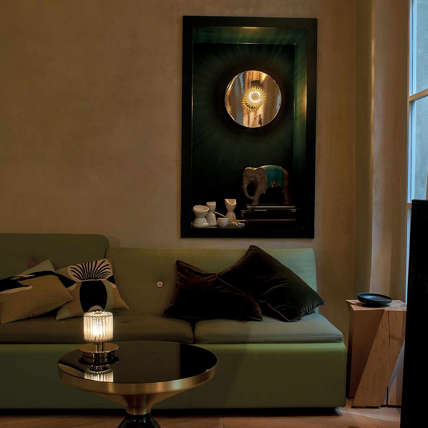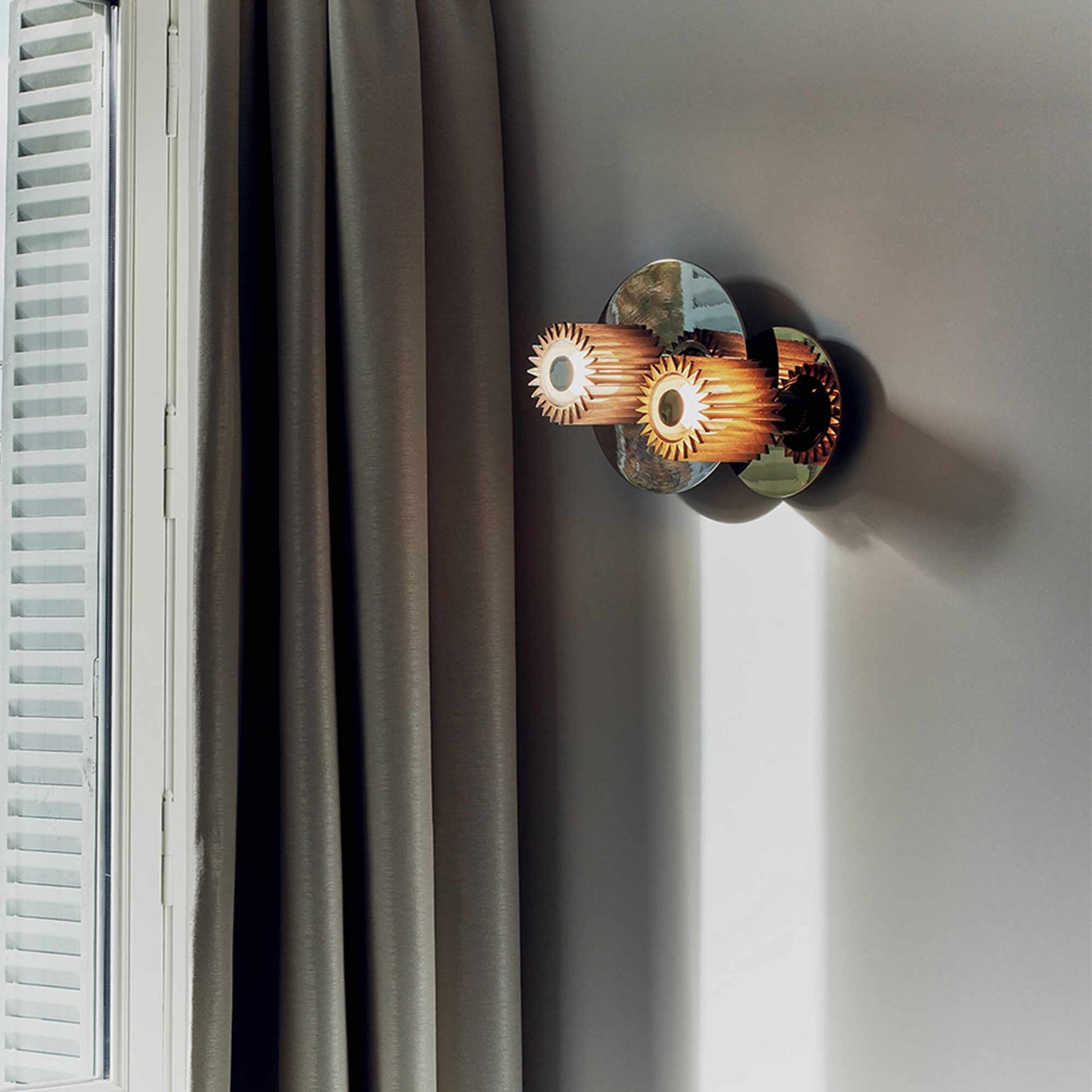 Wall or ceiling lamp in steel, aluminum, brass or stainless steel mesh, and glass. The In The Sun collection, designed by Dominique Perrault and Gaëlle Lauriot-Prévost in homage to the Sun King, shines with its joyful shadows and festive lights.