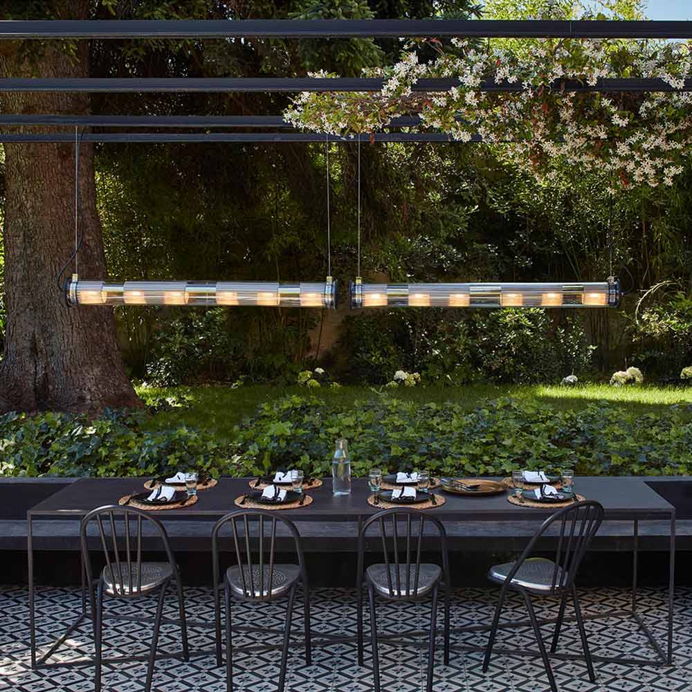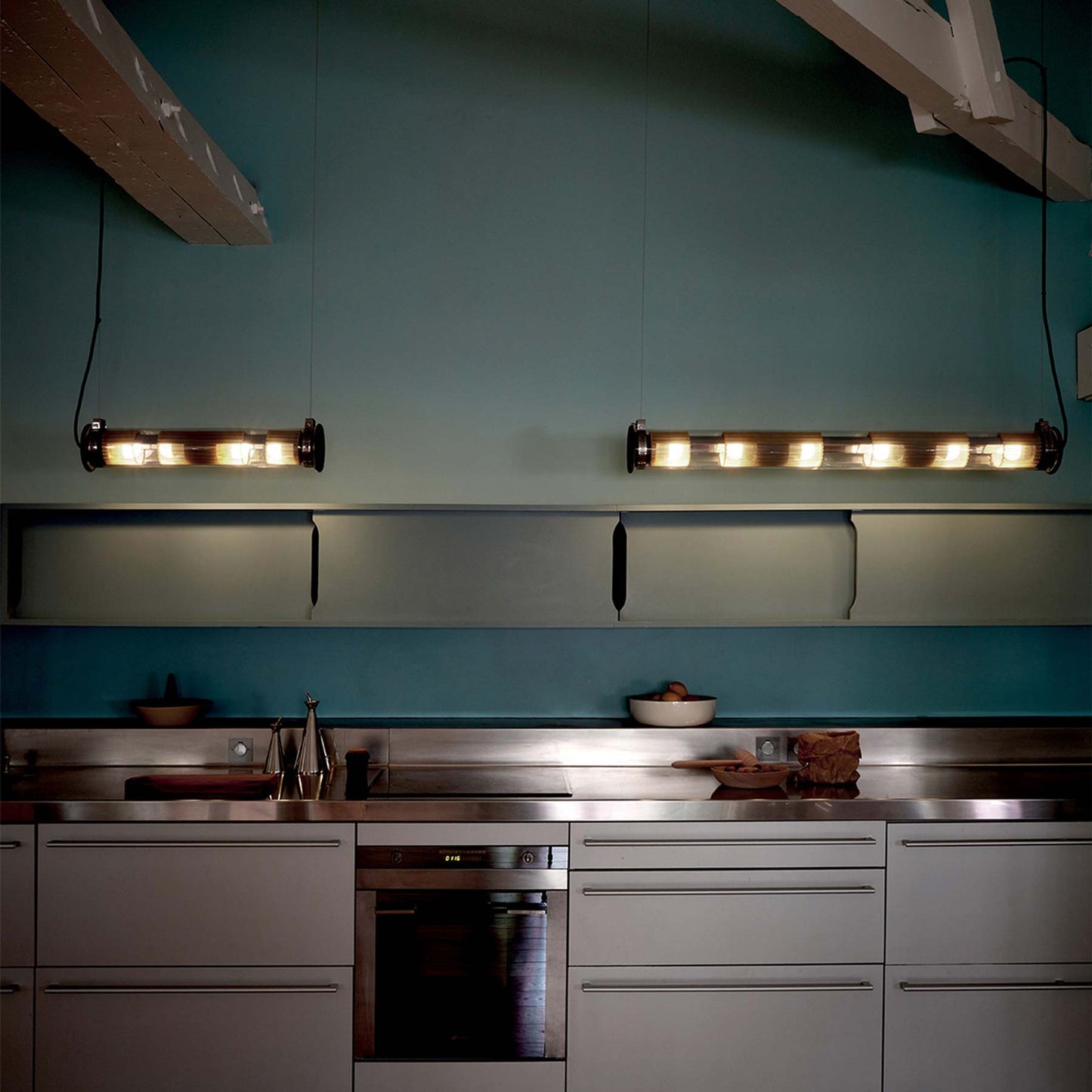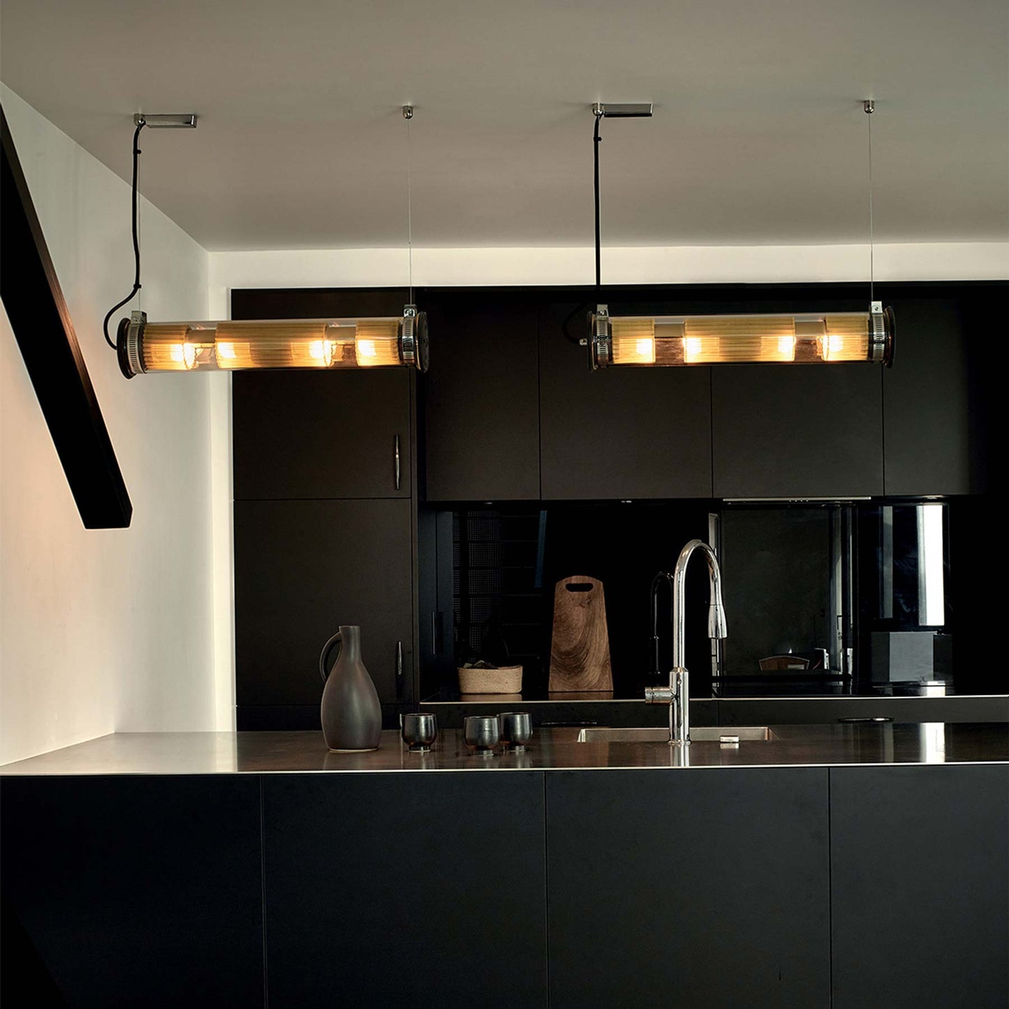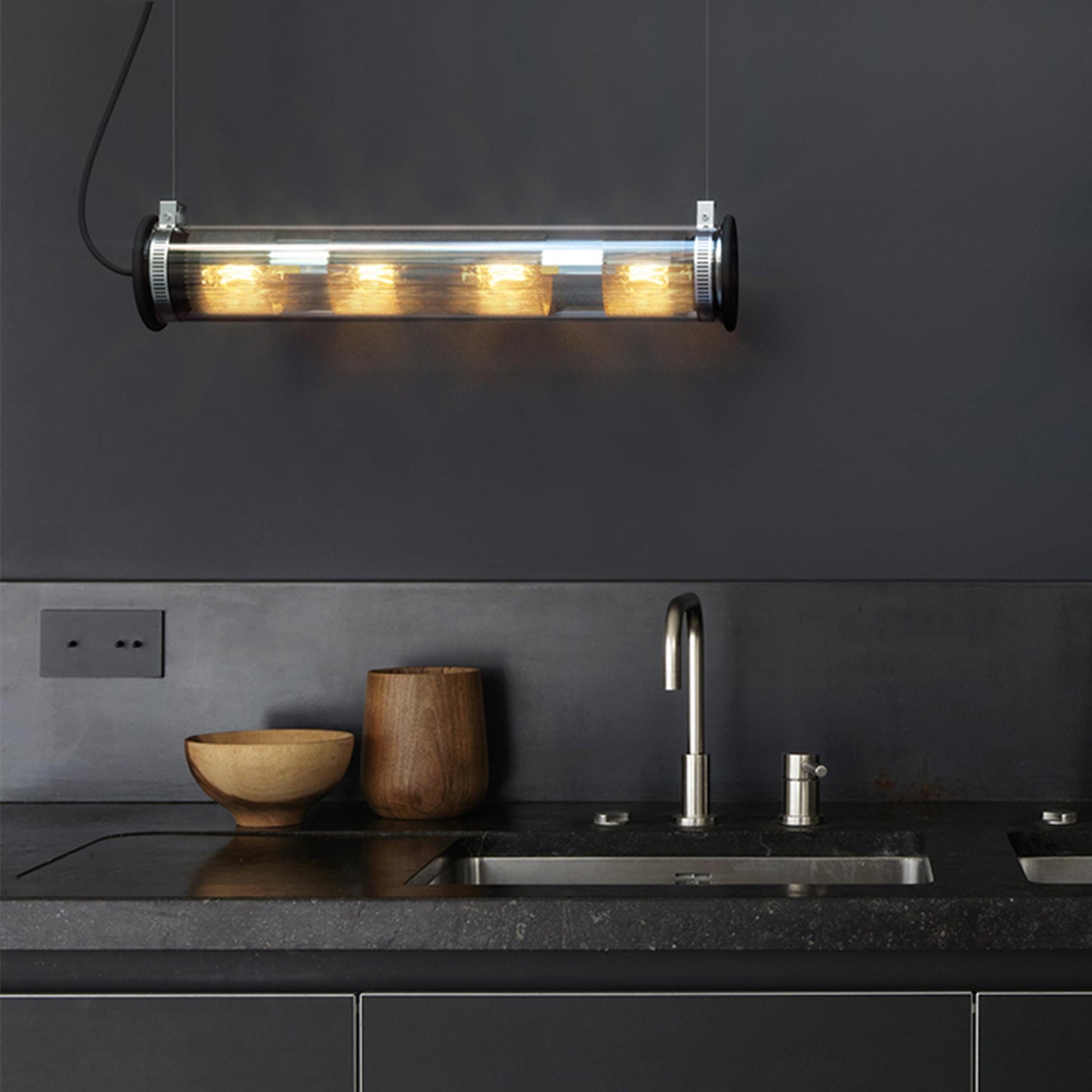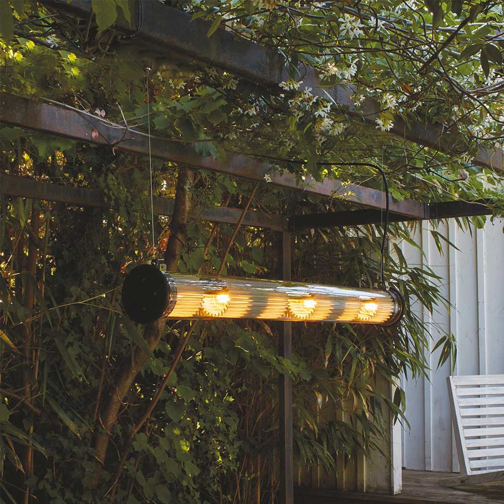 Horizontal pendant lamp. In The Tube diffuses a filtered, softened, directed and oriented light via the simple fixed or removable positioning of a shaped filter-mesh or a reflector, whose material "gives" the colour.