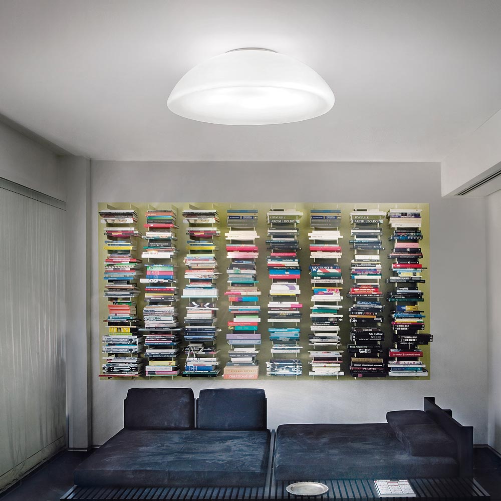 Inspired by retro design influence, the Infinita Flush Mount Ceiling Light from Vistosi reflects on classic fixture styles throughout the ages. This minimalist yet elegant light delivers a whimsical wide saucer silhouette that glows with ambient lighting through a white satin finish glass shade and glossy white framing. Make this light a versatile yet captivating source of illumination that stretches artisanal elements from floor to ceiling.