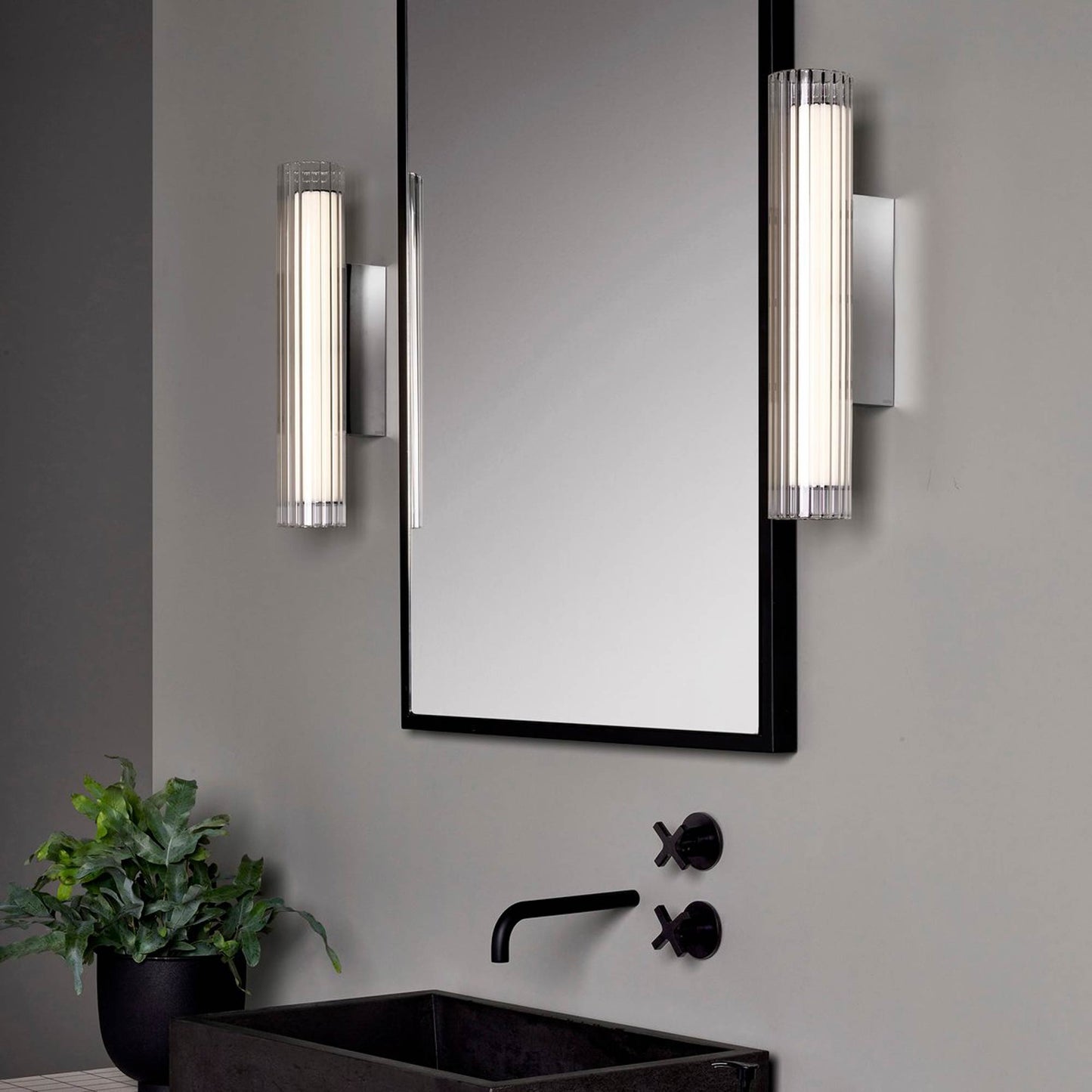 The use of glass in lighting design is common, but the io LED Wall Light from Astro Lighting takes it to a new level with a chic look and sophisticated presence. A textured glass cylinder shade mounted to metal delivers an exquisite style motif, slender and eye-catching. This energy-efficient bathroom light frames vanities or other living spaces with sheer elegance.