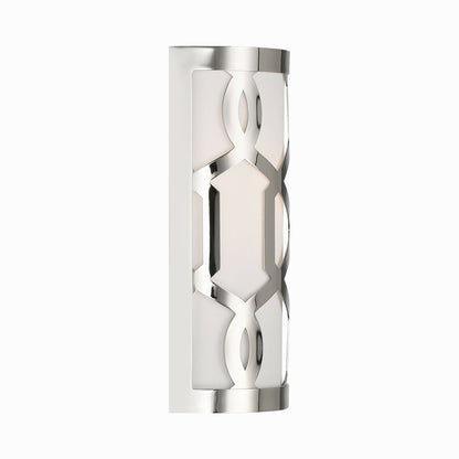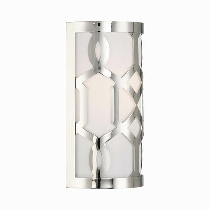 With precision-cut metal framing borrowed from Art Deco fare, the Jennings Wall Light from Crystorama repurposes Mid-Century Modern design aesthetics to make a statement in a hallway or living area. Geometric patterning makes metal stand out as it overlays a soft white silk shade and becomes a focal point in any custom space.