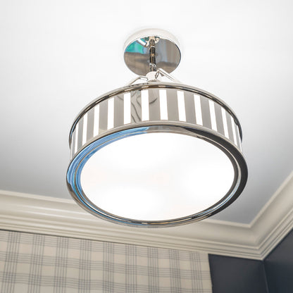 Thick stripes create engaging uniformity for the Kendall Pendant Light from Crystorama. A white glass diffuser adds the perfect dose of contrast and assures diffused, inviting illumination over a dining table or in an entryway.