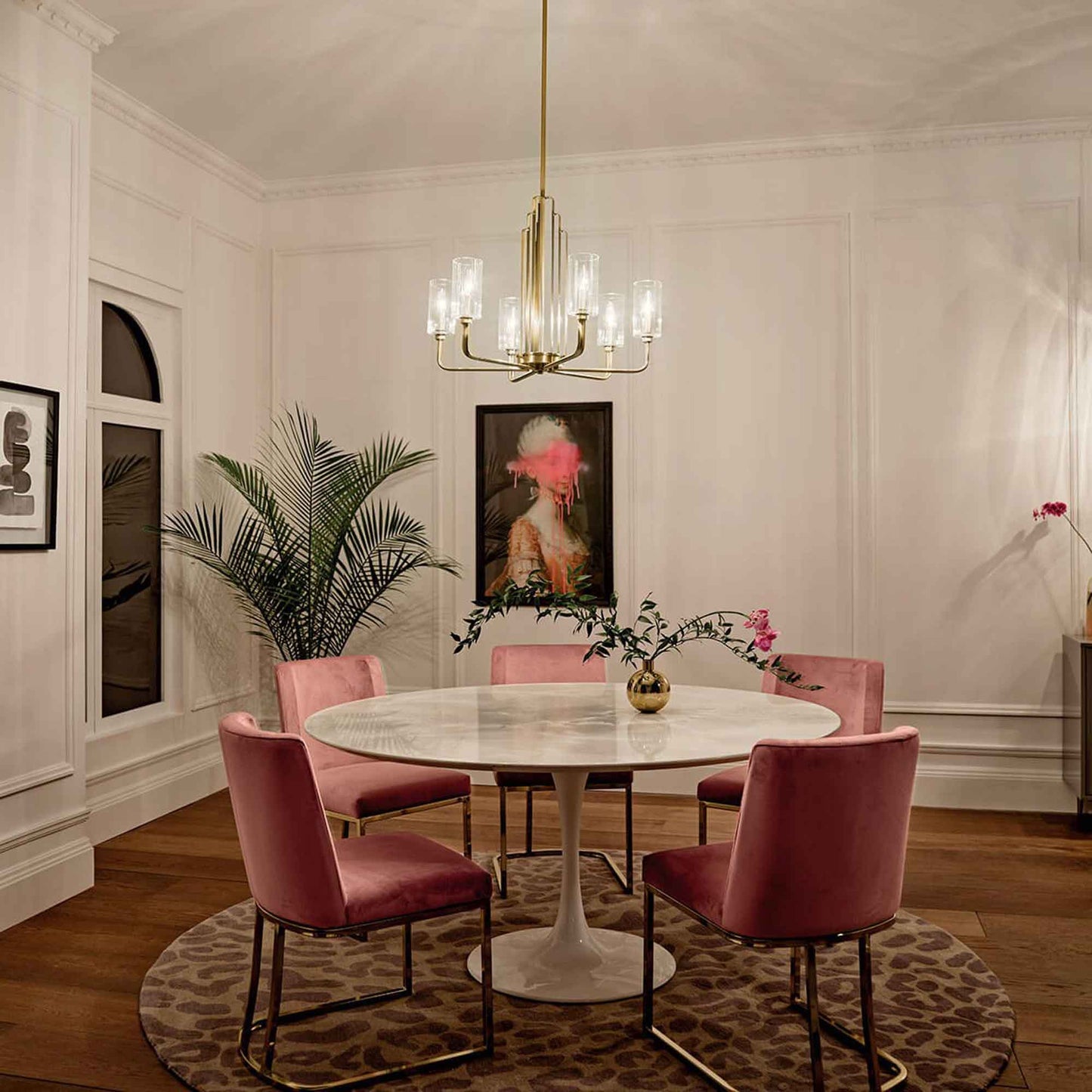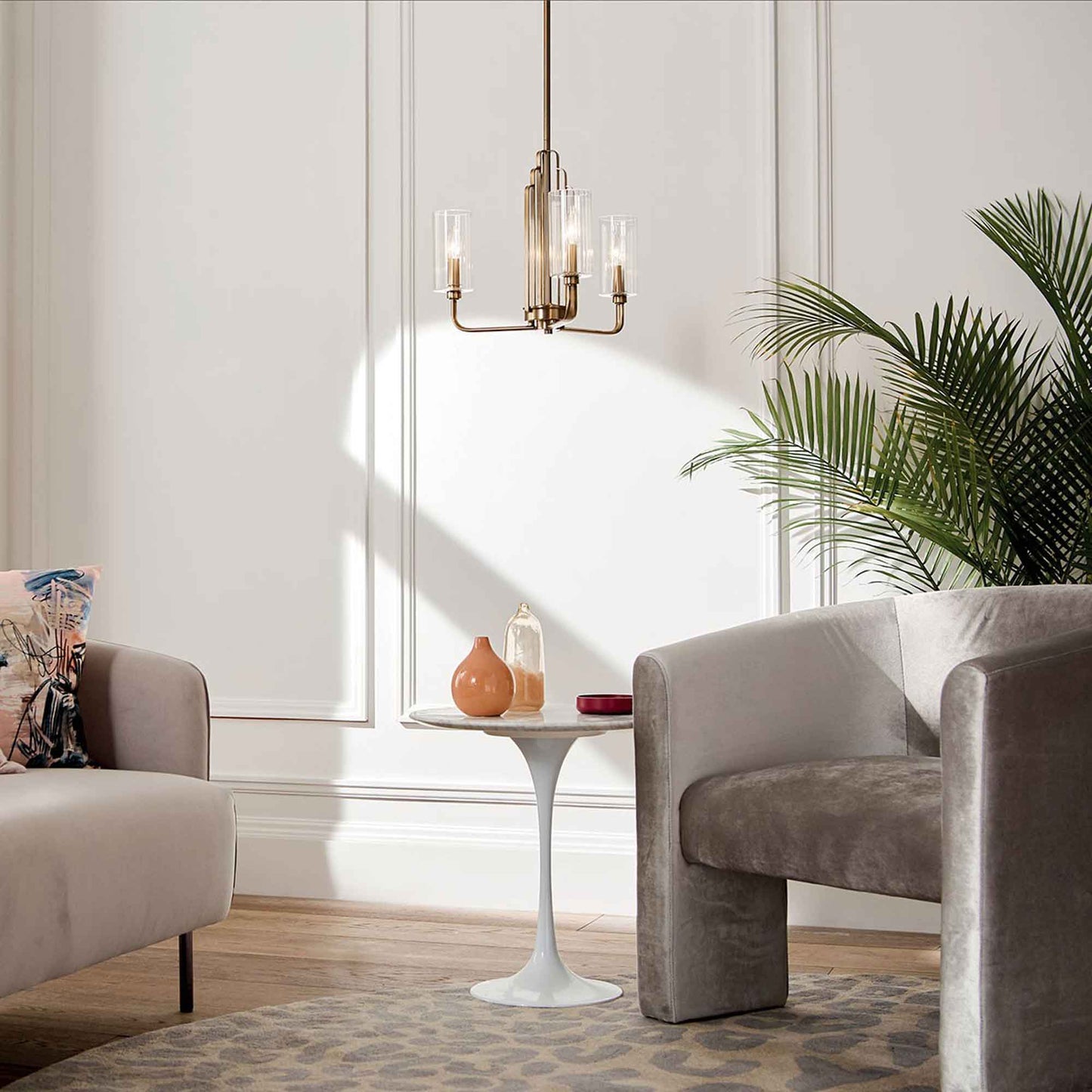 The Kimrose™ 3 light chandelier may be small in size but big in style. Its Art Deco-inspired geometric shapes take center stage in a gorgeous Brushed Natural Brass and Polished Nickel finish. The shades are Clear Fluted Glass, meaning they're ribbed gently with vertical grooves to produce a subtle lighting effect. For lighting without the effect, simply remove the shades.
