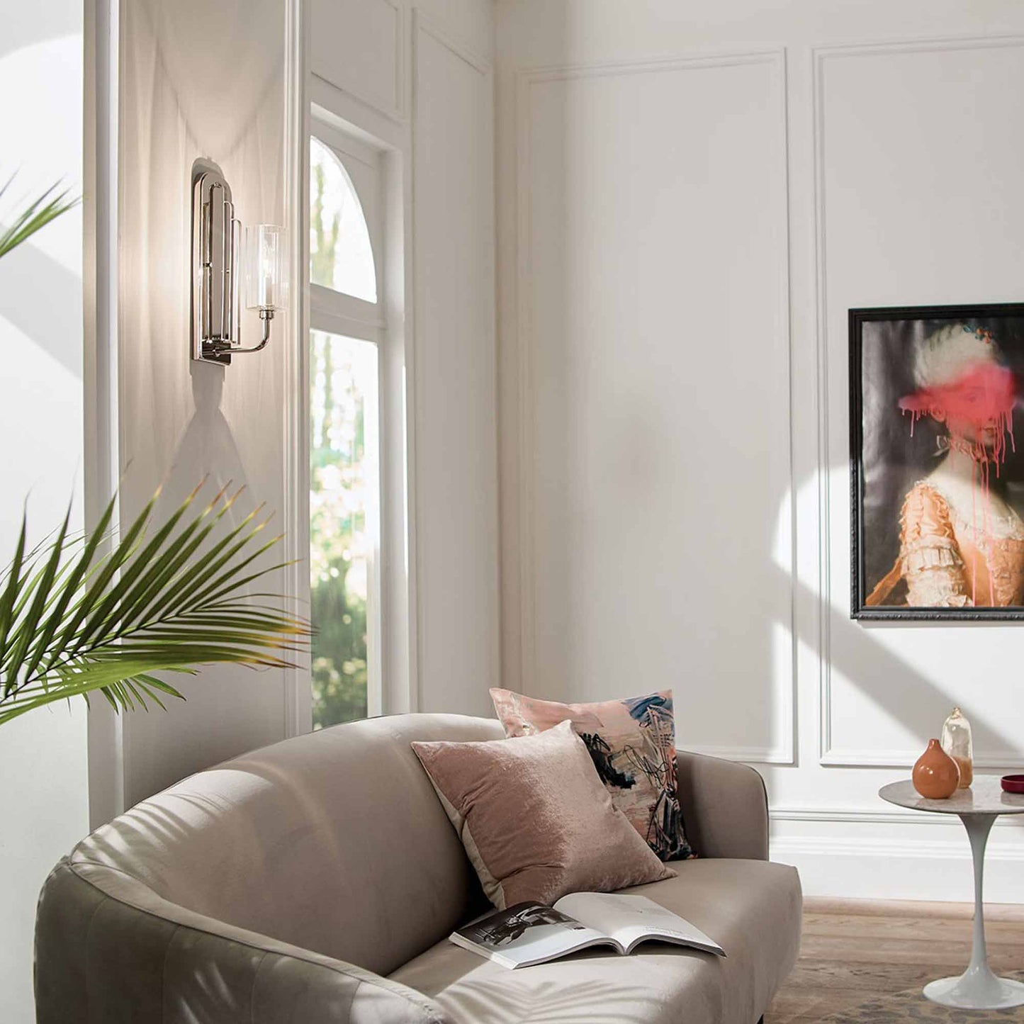 The Kimrose™ 1 light sconce features Art Deco-inspired geometric shapes against an oversized backdrop, both in a gorgeous mix of Polished Nickel and Brushed Natural Brass finishes. The shade is Clear Fluted Glass, so it's ribbed gently with vertical grooves to produce a subtle lighting effect. For lighting without the effect, simply remove the shade.