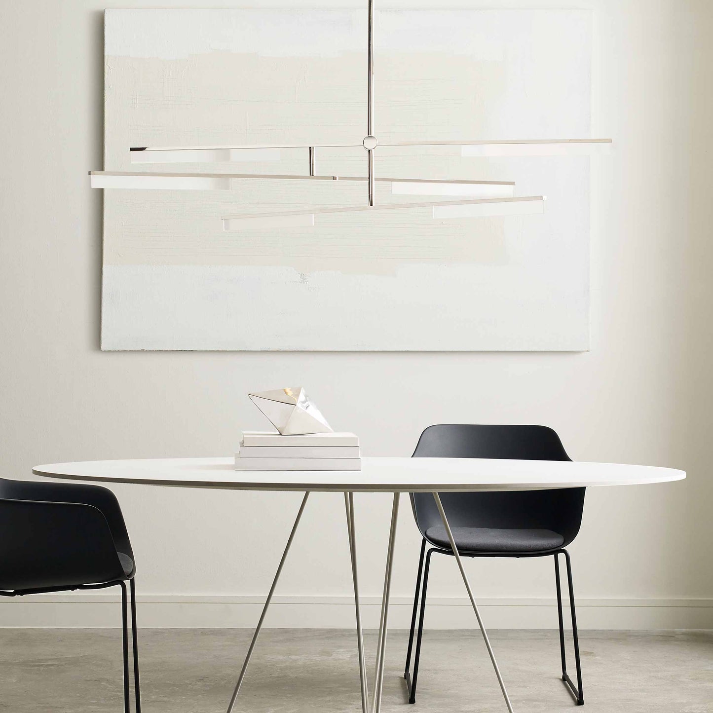 The Klee LED Chandelier by Sean Lavin for Visual Comfort Modern features an unsystematic pattern of asymmetric arms converging to form a stunning and modern look. Klee LED Chandelier is offered in three finishes, Natural Brass that will patina over time, Nightshade Black and Polished Nickel finish. Linear arms are designed with a thin acrylic panel of light guide technology spanning 50" to 56" and can pivot to a desired position. Complete the look with the entire Klee collection, including Table Lamps, Floor Lamps, and Wall Sconce.