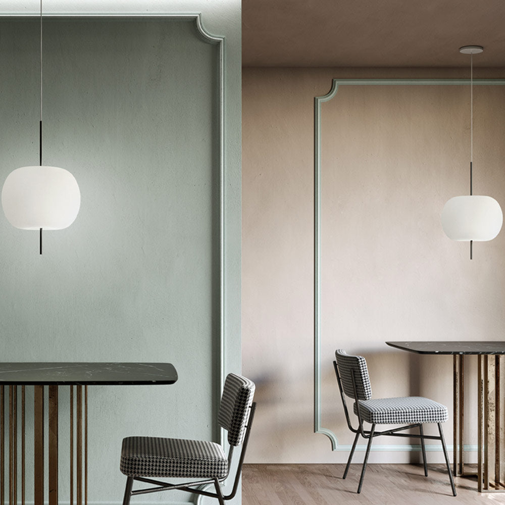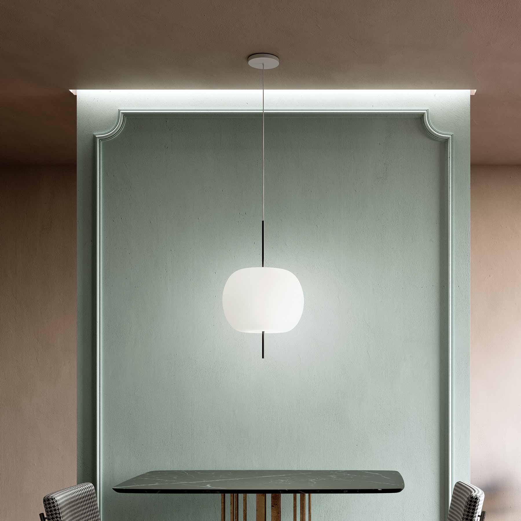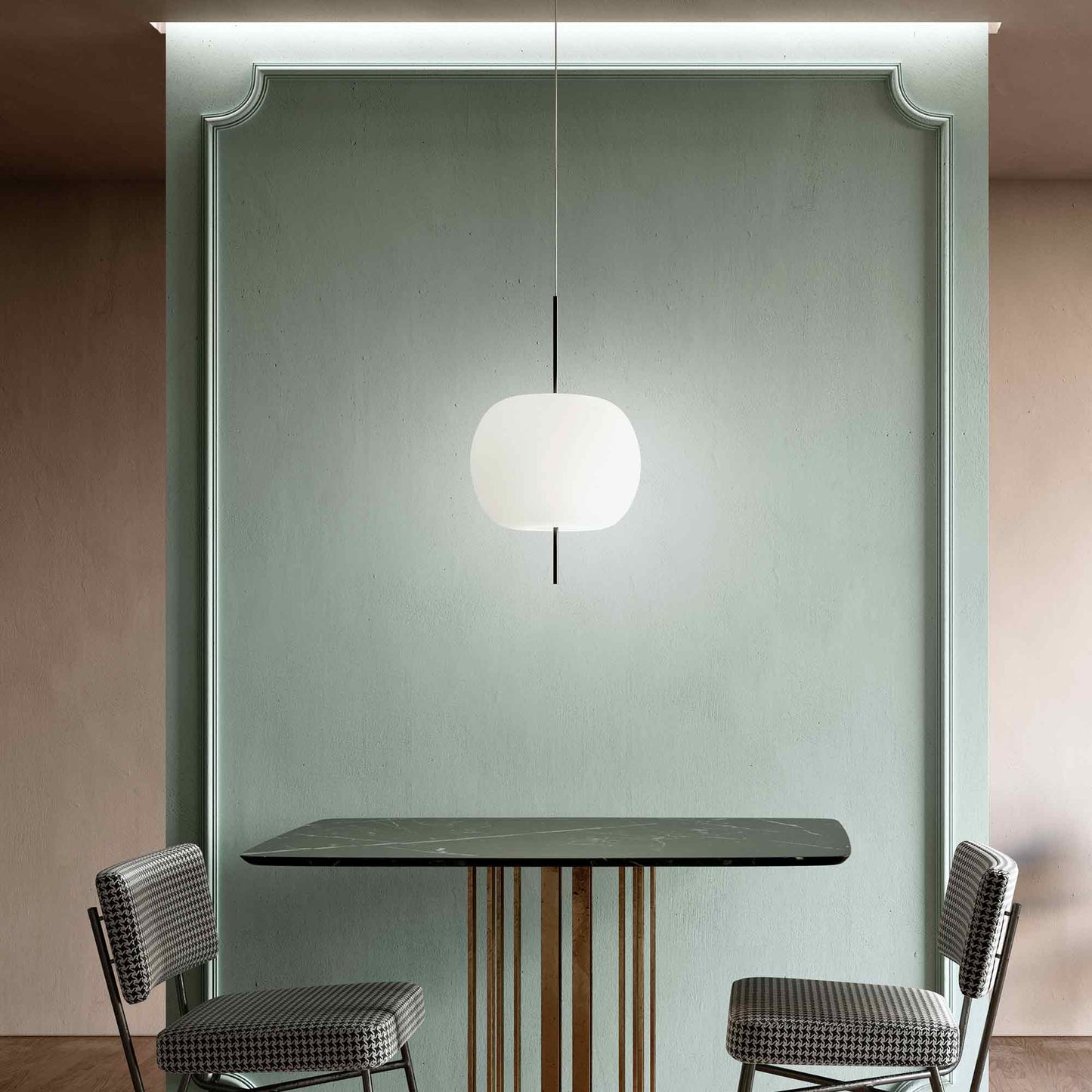 The Kushi Pendant Light from KDLN is custom designed to highlight surrounding décor, offering its own chic yet simplified aesthetic. A delightfully festive rounded jacketed blown glass diffuser offers radiant illumination, accented with a linear metal element that reinforces visual placement. Make a dining or living space more stylish with this savvy and ornate fixture.