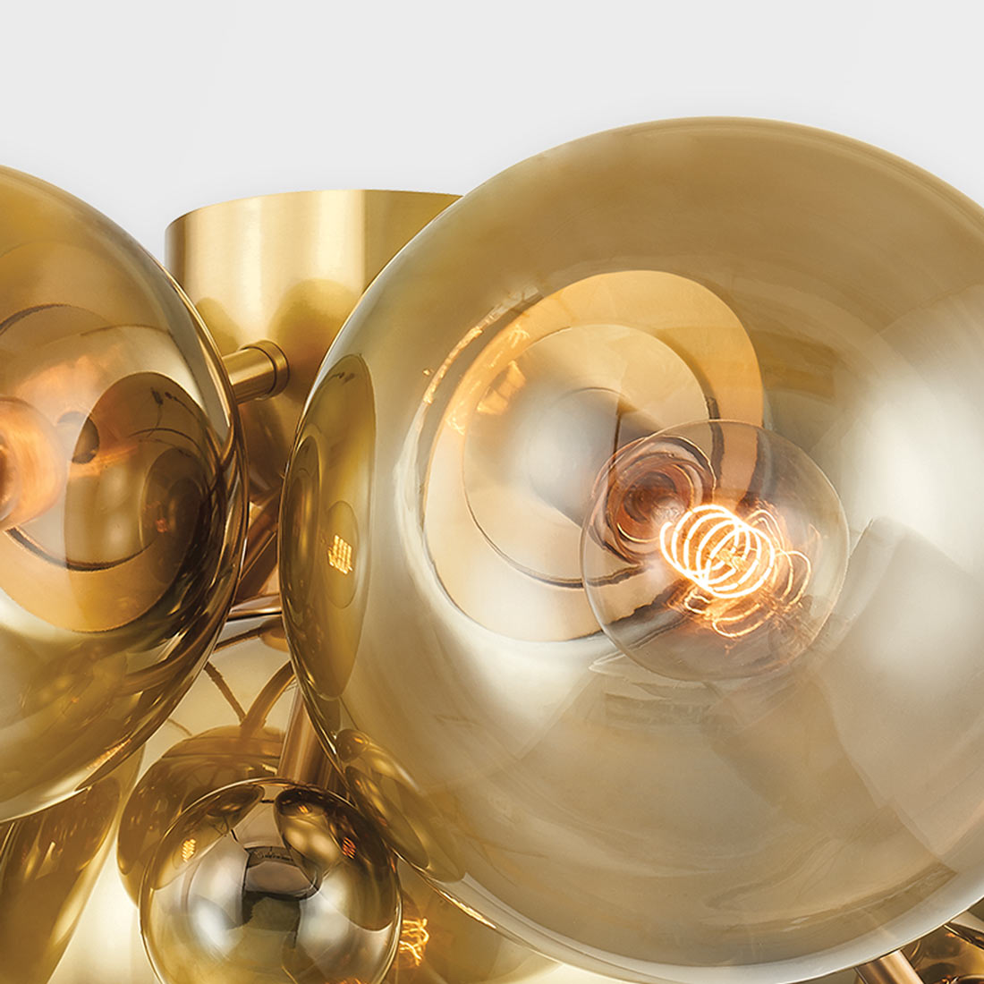 The Kyoto Flush Mount Ceiling Light from Corbett Lighting plays with shape in clusters, delivering a warm look in illumination in a custom living, dining, and entryway settings. Rich vintage polished brass metal and ombre glass reflect the exquisite nature of globe shades with a nod to festive holiday-inspired artistry.