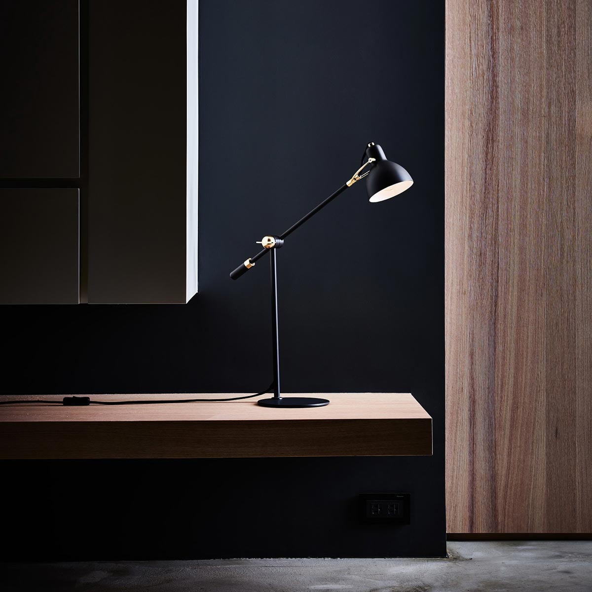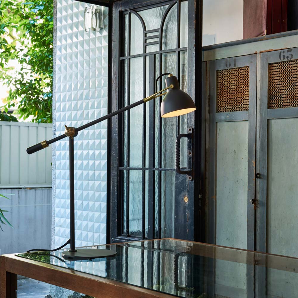 Sophisticated styling embraces an industrial motif in the Laito Gentle Table Lamp from Seed Design, complementing a modern office or living space. Change height settings with a rotary arm lamp attached to a studio-inspired metal shade in an asymmetrical silhouette, delivering a crisp look.