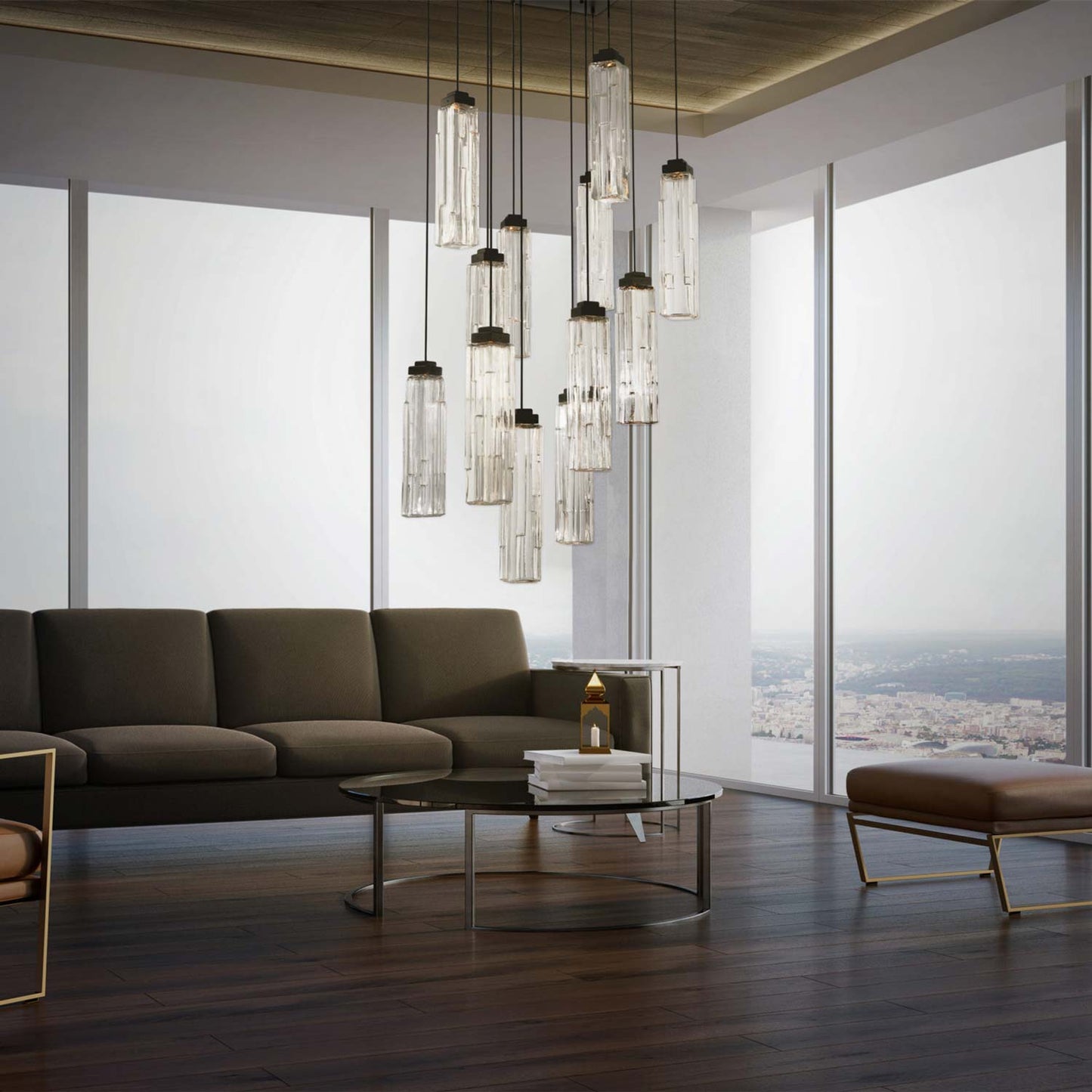 Myriad glass shades refract the light of this Ledgestone Round LED Multi Light Pendant Light from Hammerton Studio. Beautiful over a foyer or stairwell, the pendant shows off individual pendants suspended at differing lengths to create a sophisticated, multi-dimensional presentation.