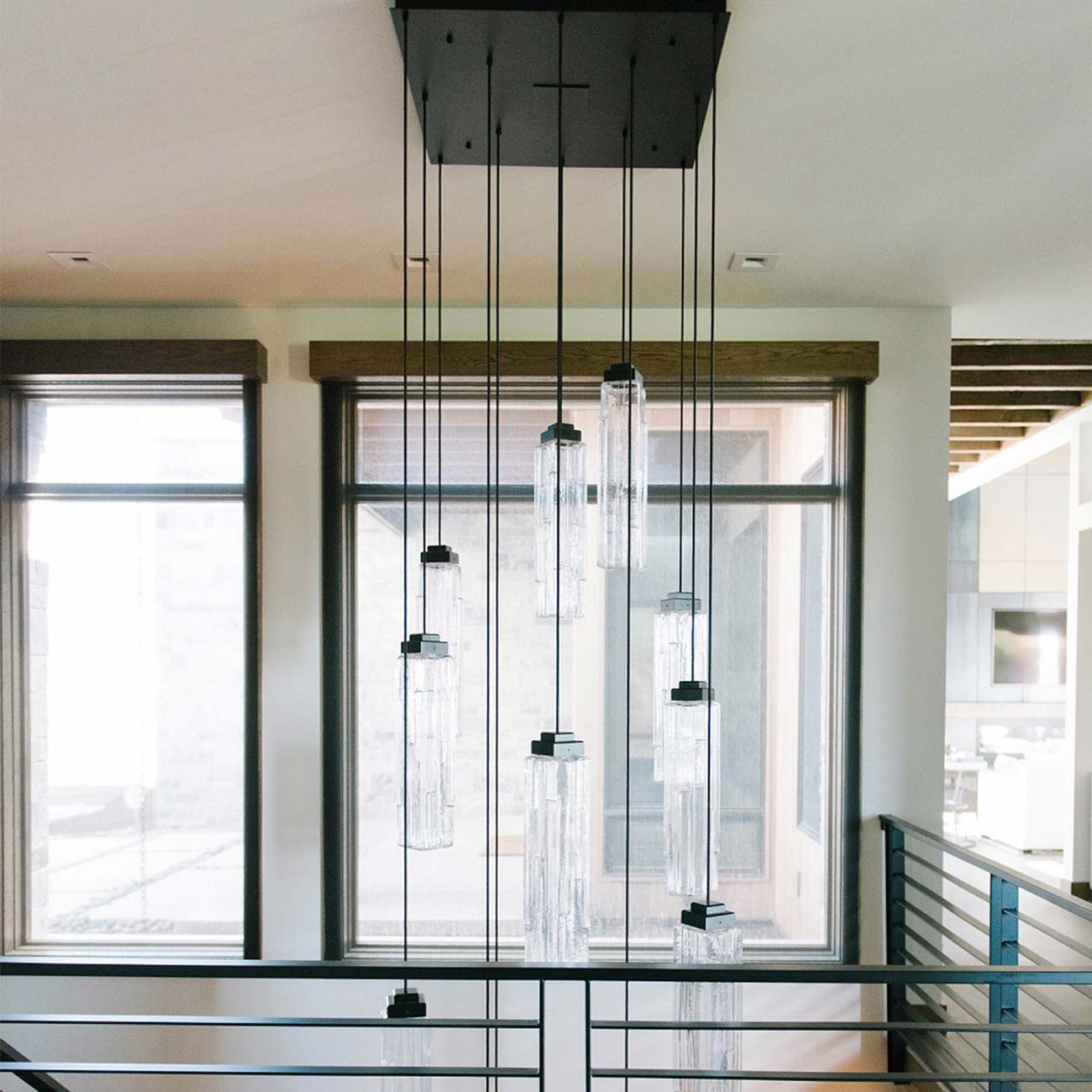 Icy in its elegance, the Ledgestone Square LED Multi Light Pendant Light from Hammerton Studio is a stellar choice to spotlight a living room or foyer. Its dramatic silhouette is punctuated with dimensional, rectangular glass shades that suspend at varying heights to create a dazzling effect on surrounding decor.