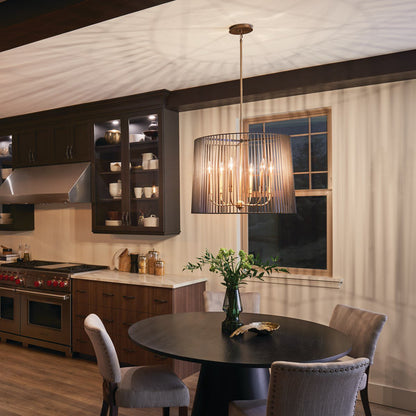 The Natural Brass finish on this Linara Chandelier, is like jewelry to the Matte Black metal slatted shade. A refreshing twist on contemporary and midcentury modern décor.