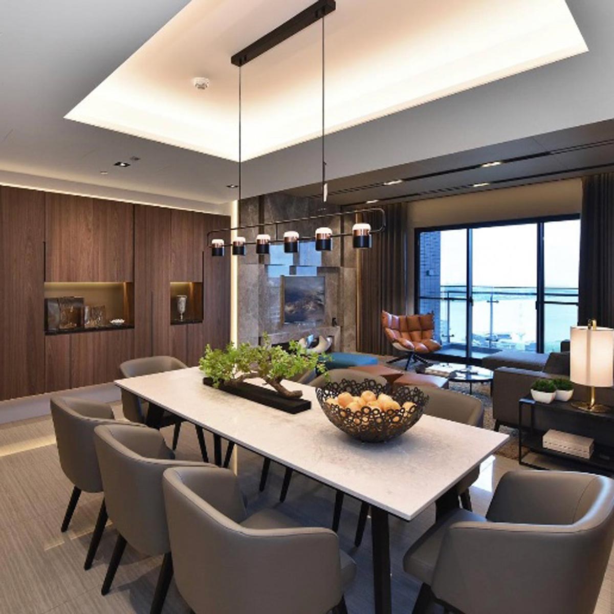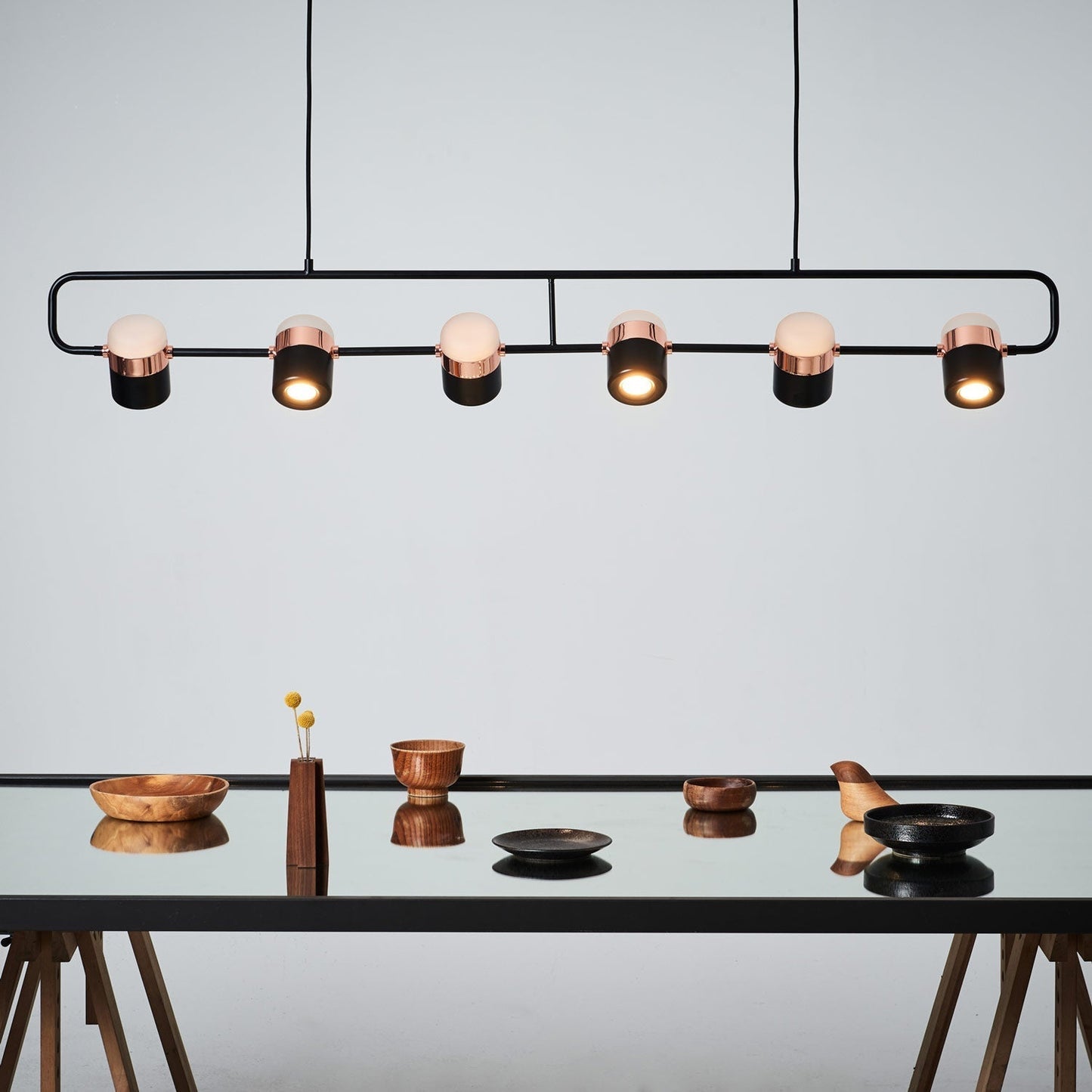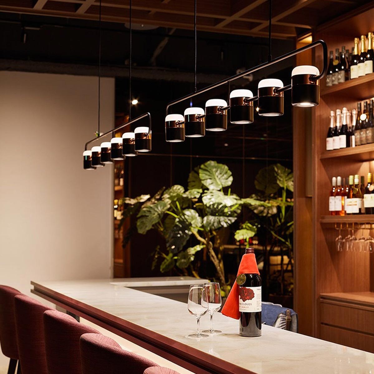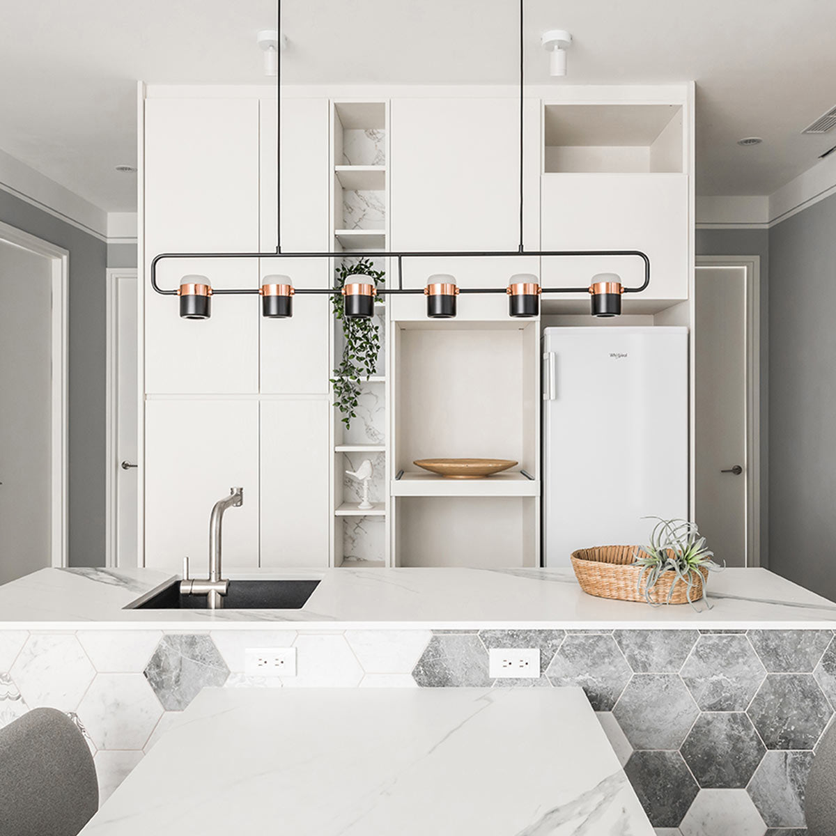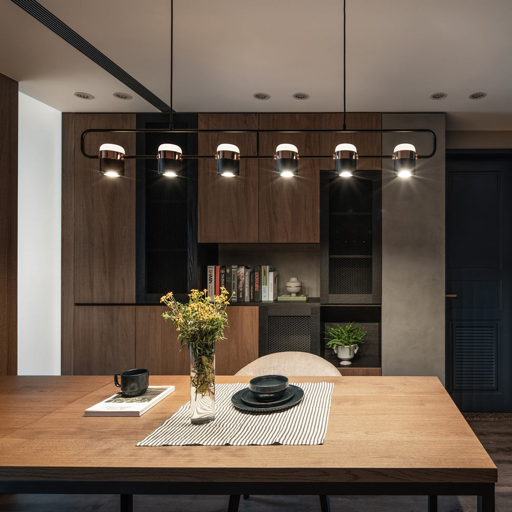 A captivating open linear silhouette begins an alluring effect, making the Ling LED Linear Pendant Light from Seed Design an extraordinary fixture sending soft lighting over a kitchen island or bar space. Energy-efficient light embellishes a host of features highlighted with aligned shades showcasing perfectly equalized spacing.