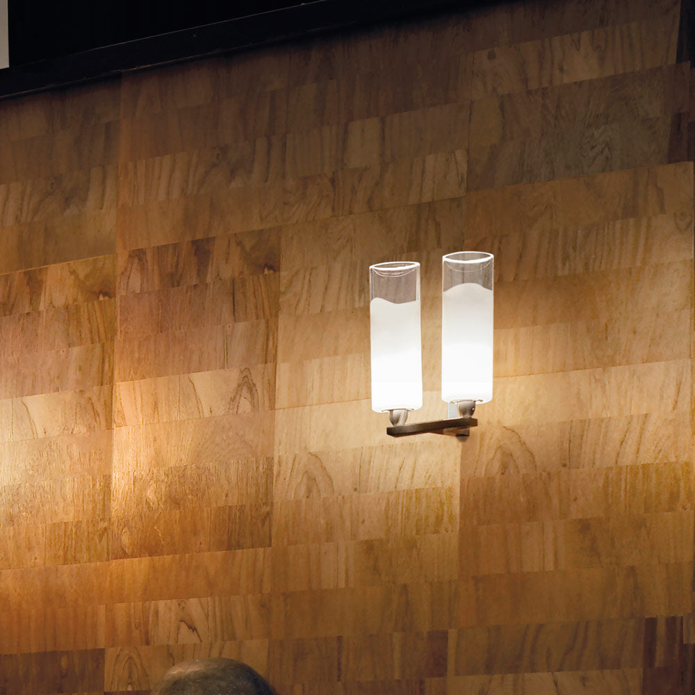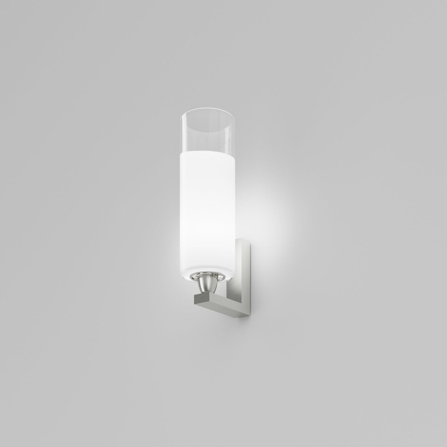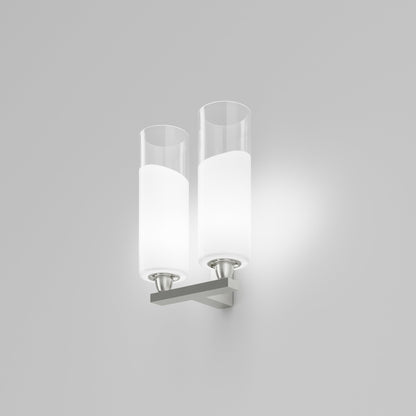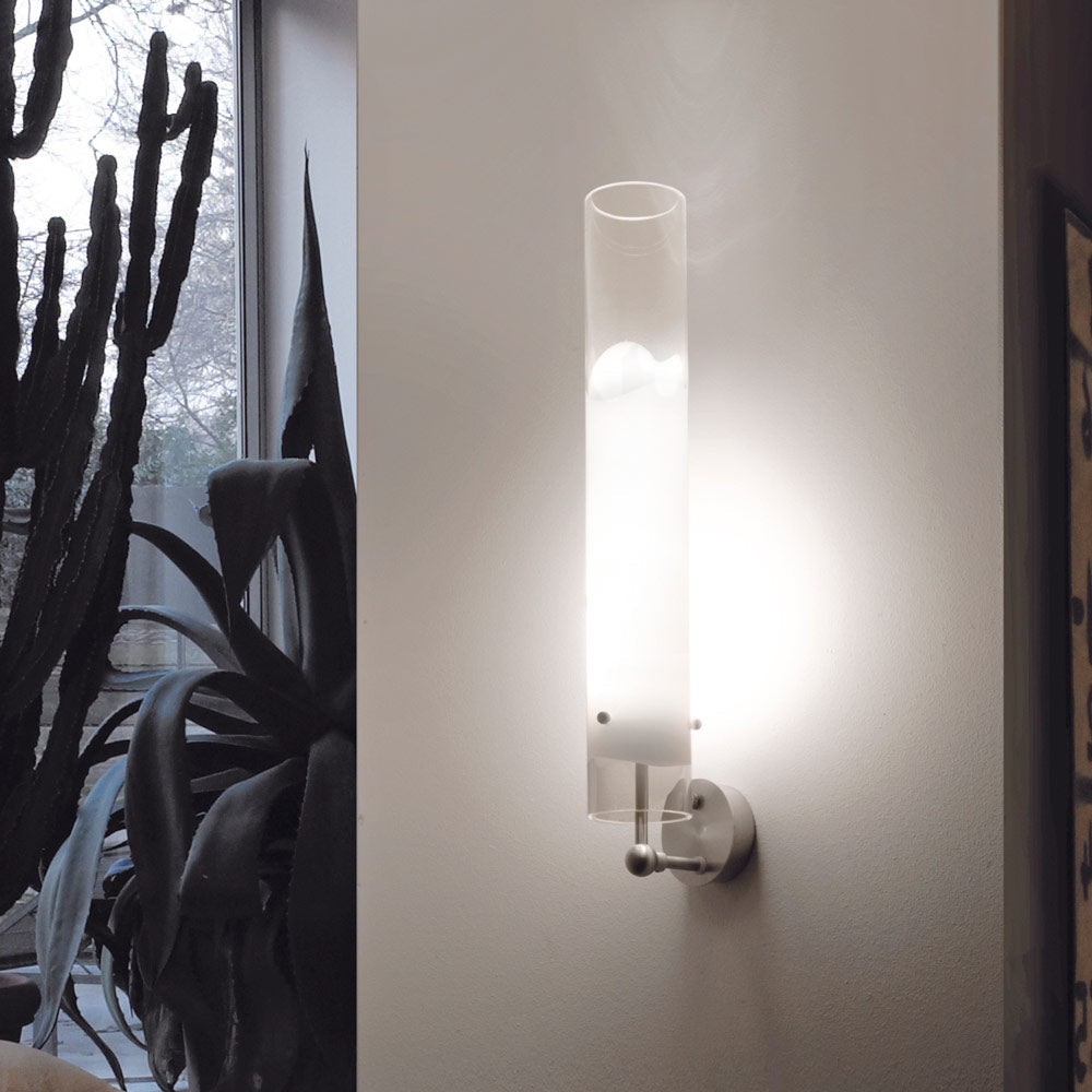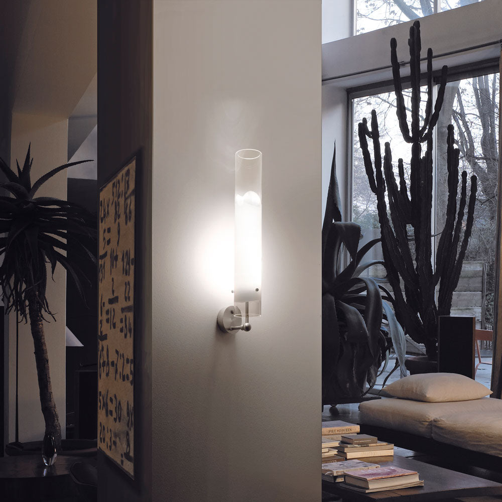 Refreshing lightness borrows from delicacy and simplicity to fashion a superb light source. Illuminate contemporary spaces with the Lio Wall Light from Vistosi, admiring its cylindrical silhouette that creates a clean vibe. Blending with sleek satin nickel finish frame, its classic glass shade offers clear sparkling glass coated with a layer of crystal white glass.