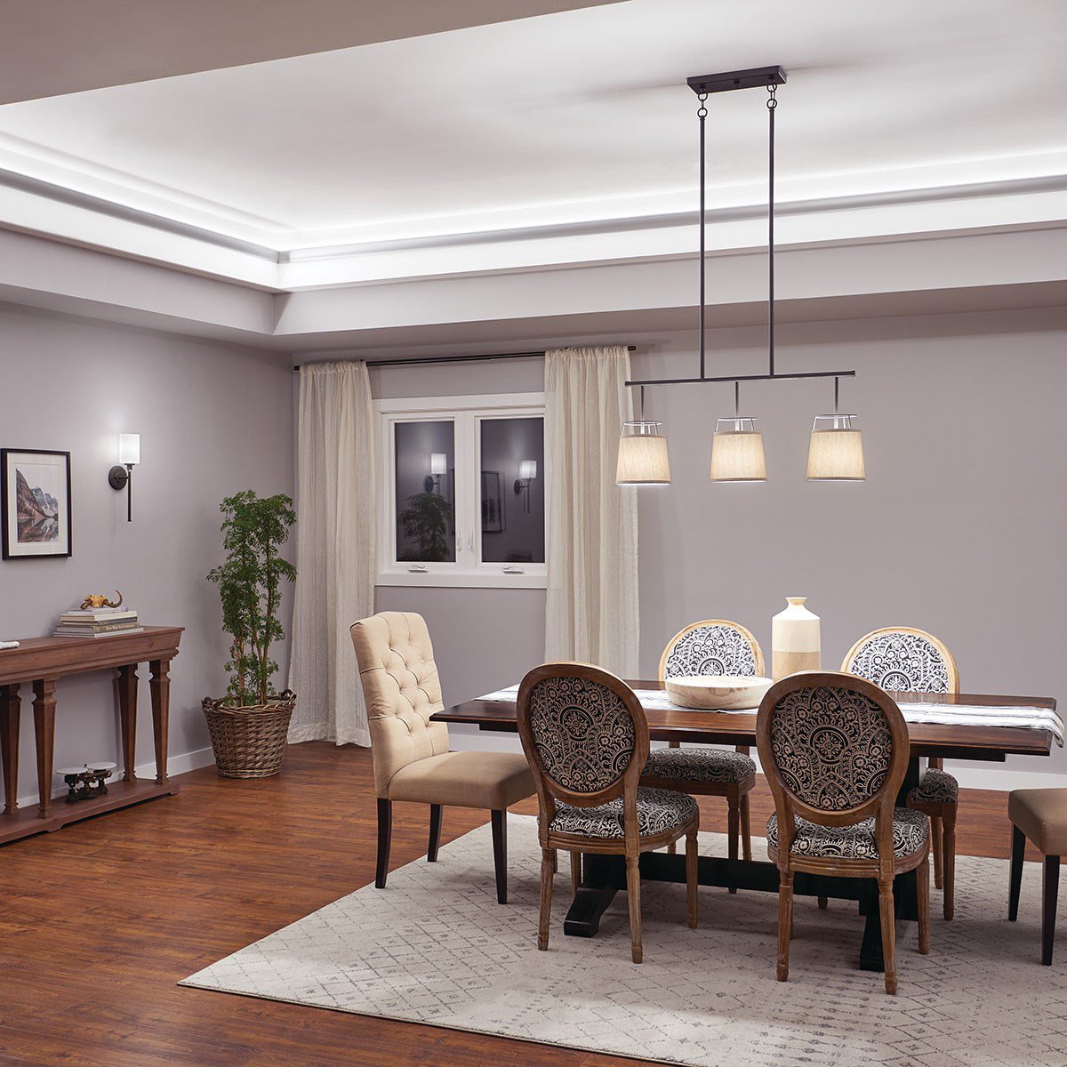 The Marika™ 16" 3 light linear chandelier with grey linen shades in Olde Bronze finish. A perfect addition in several aesthetic environments, including traditional and transitional.