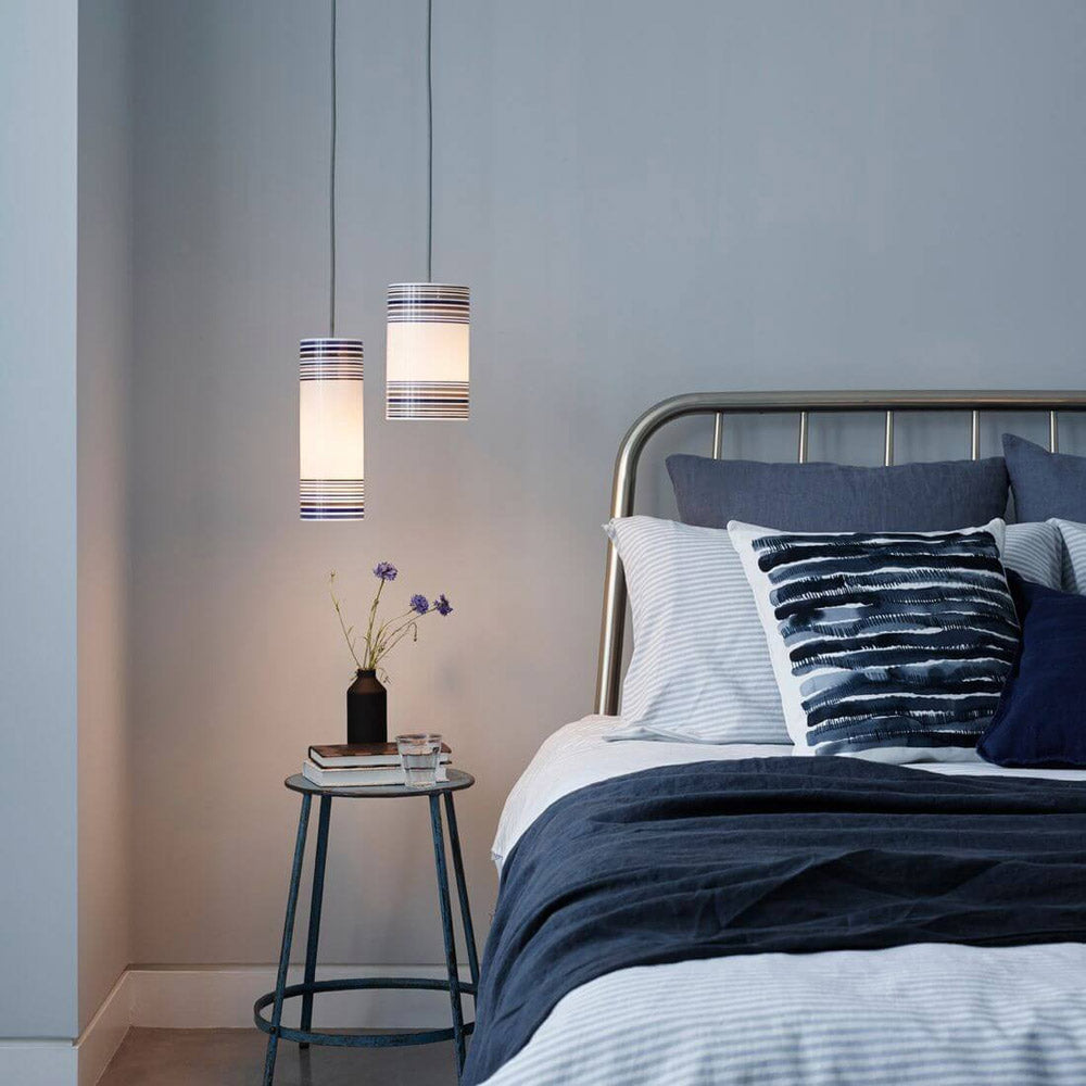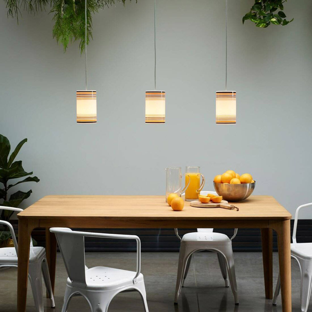 An absence of distracting detail meshes with cylindrical silhouetting to create a light fixture with excellent accenting options. The May Pendant Light from Original BTC delivers just enough style to be relevant as it glows with soft lighting through a shade with colorful striped accents.