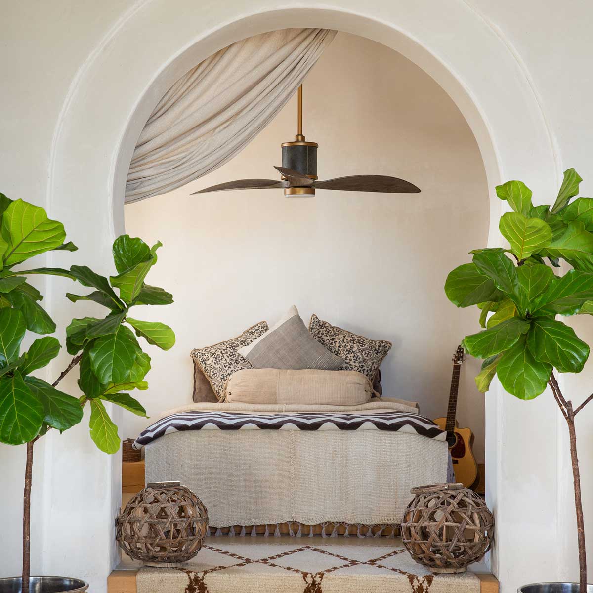 Merrick blends aesthetic appeal and practicality. Its authentic leather accents add a touch of tradition, while its carefully crafted blades provide just the right balance of contemporary style. Available in a variety of finishes, Merrick is the perfect accent piece to all spaces.
