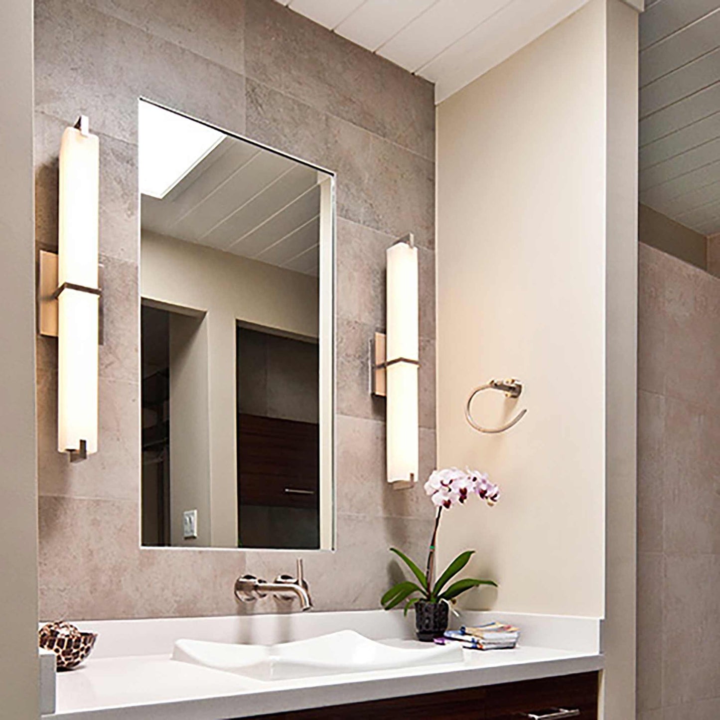 The Metro LED Bath Vanity Light from Visual Comfort Modern is sophisticated and modern in design due to its multi-layer white or white acrylic shade and three on-trend hardware finishes. The Metro bath light can be mounted horizontally above a mirror or mounted vertically flanking a mirror as a wall sconce. Two length options allow this bath light to be adapted to powder room lighting as well as master bathroom lighting. Both size fixtures are fully dimmable with your choice of either incandescent or integrated LED lamping to create the desired ambiance in your unique space.