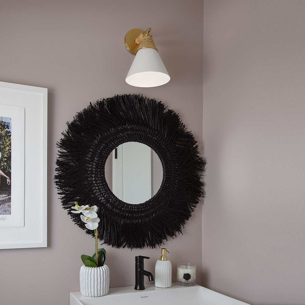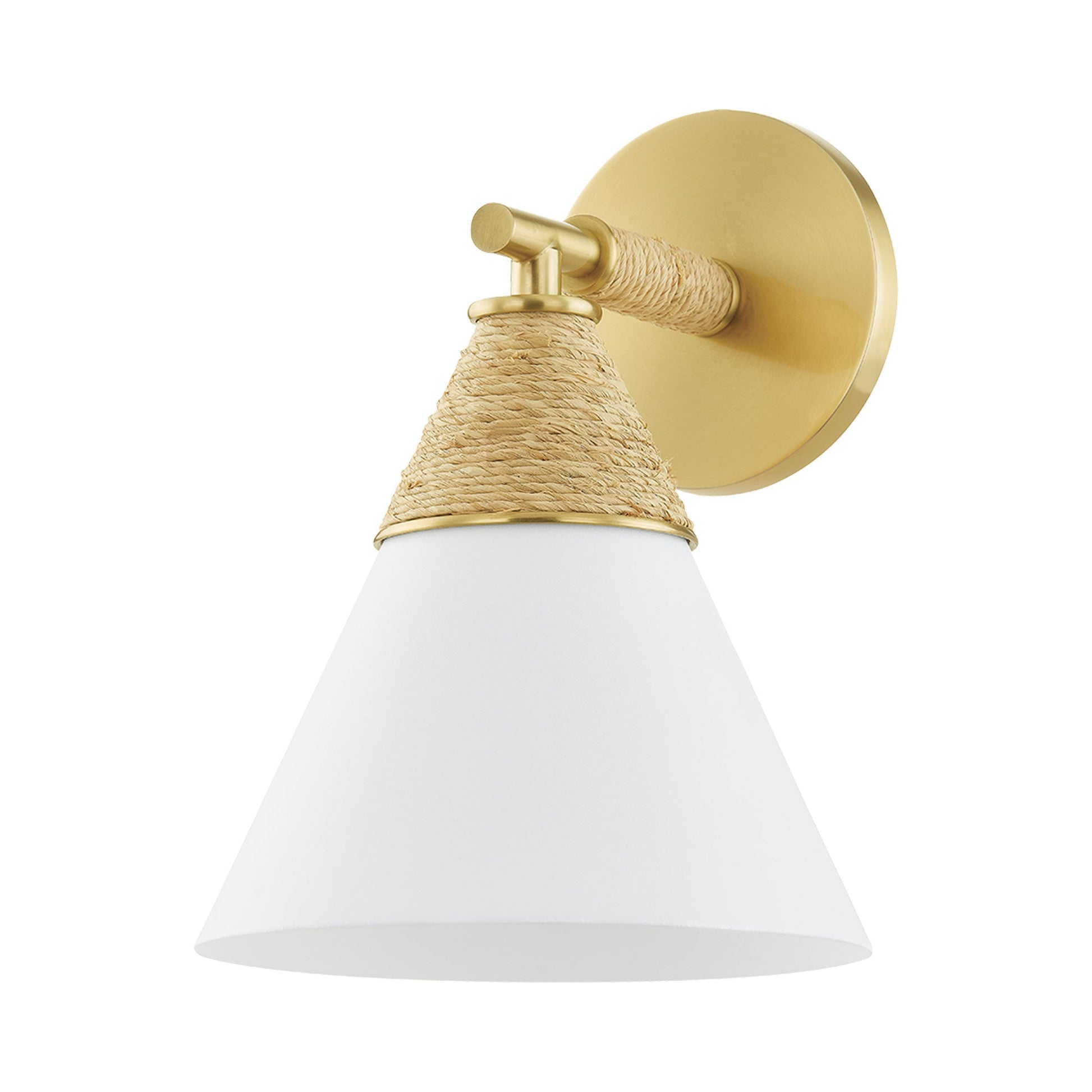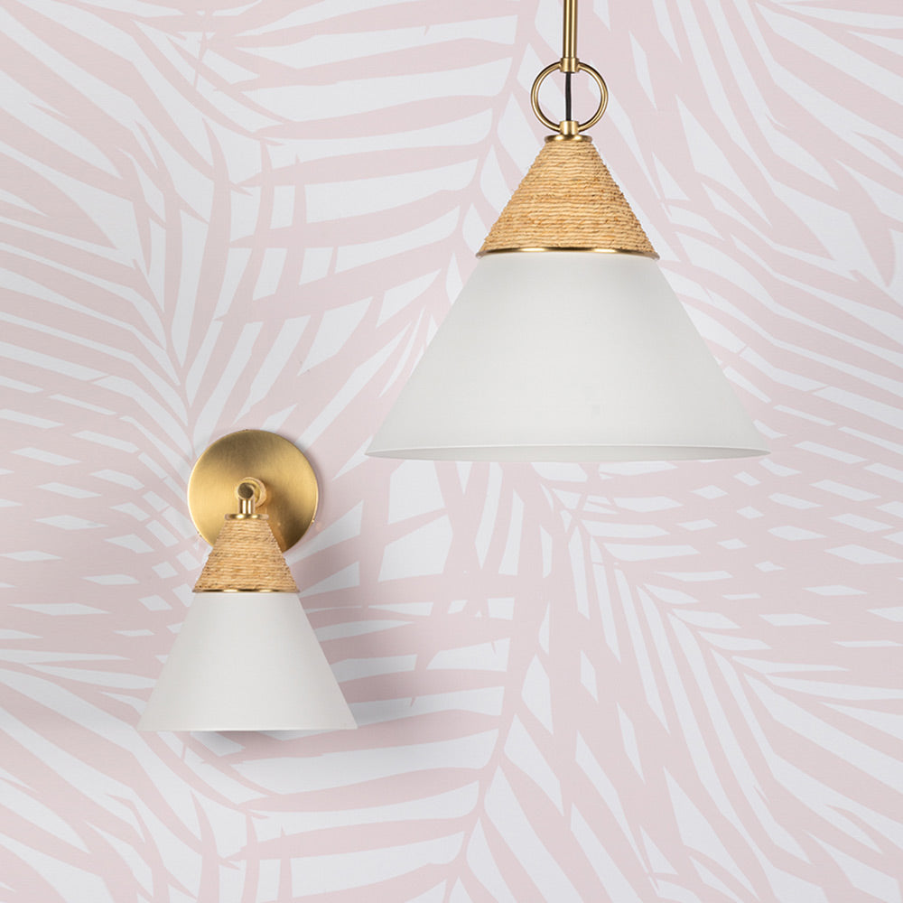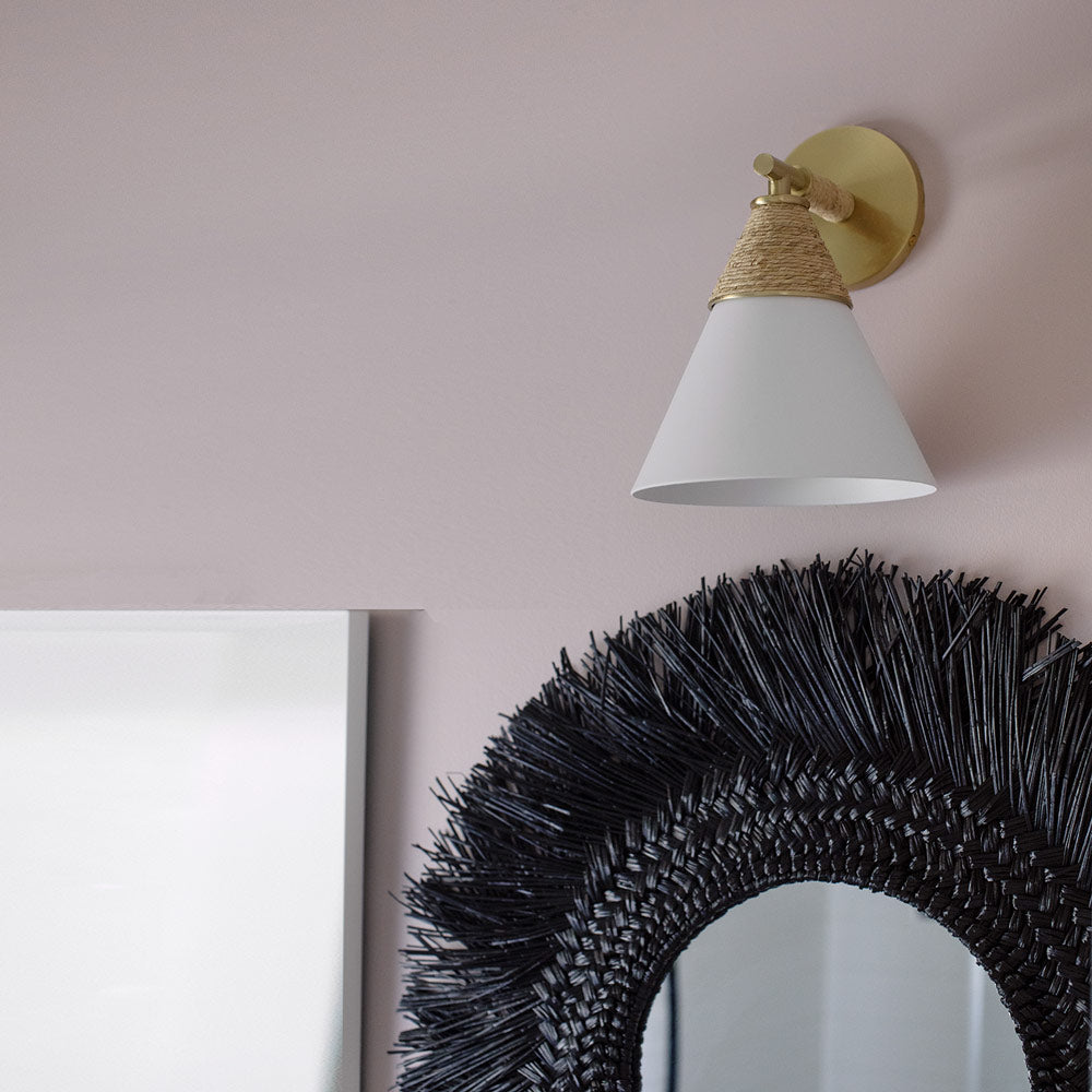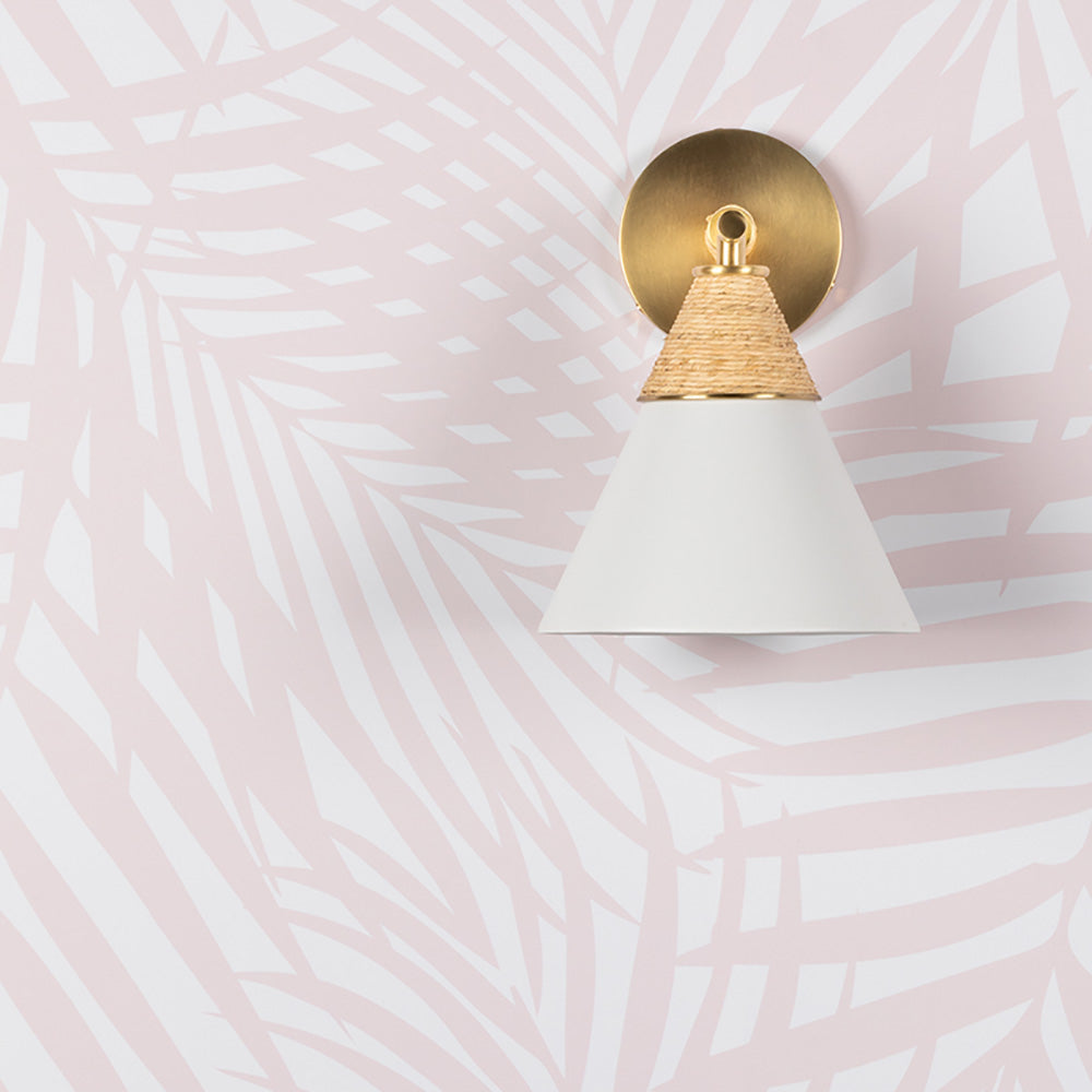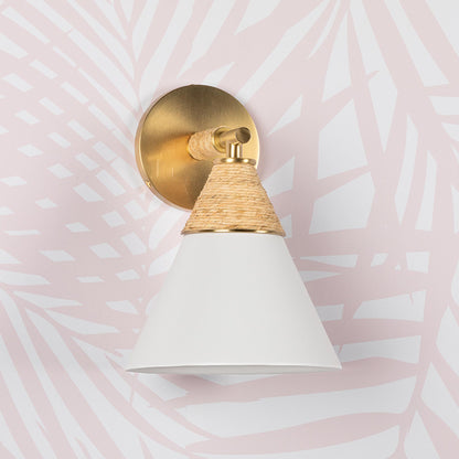 Delicacy contrasts with organic texture in the white shade and raffia wrapping of the impeccable Mica Wall Light from Mitzi. Gorgeous in a foyer, the sconce shows off superb modern coastal character. Casually sophisticated, its augmented with the warmth of aged brass accents and simplicity of familiar shapes.