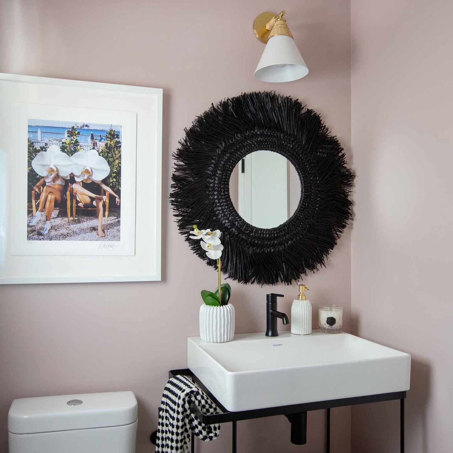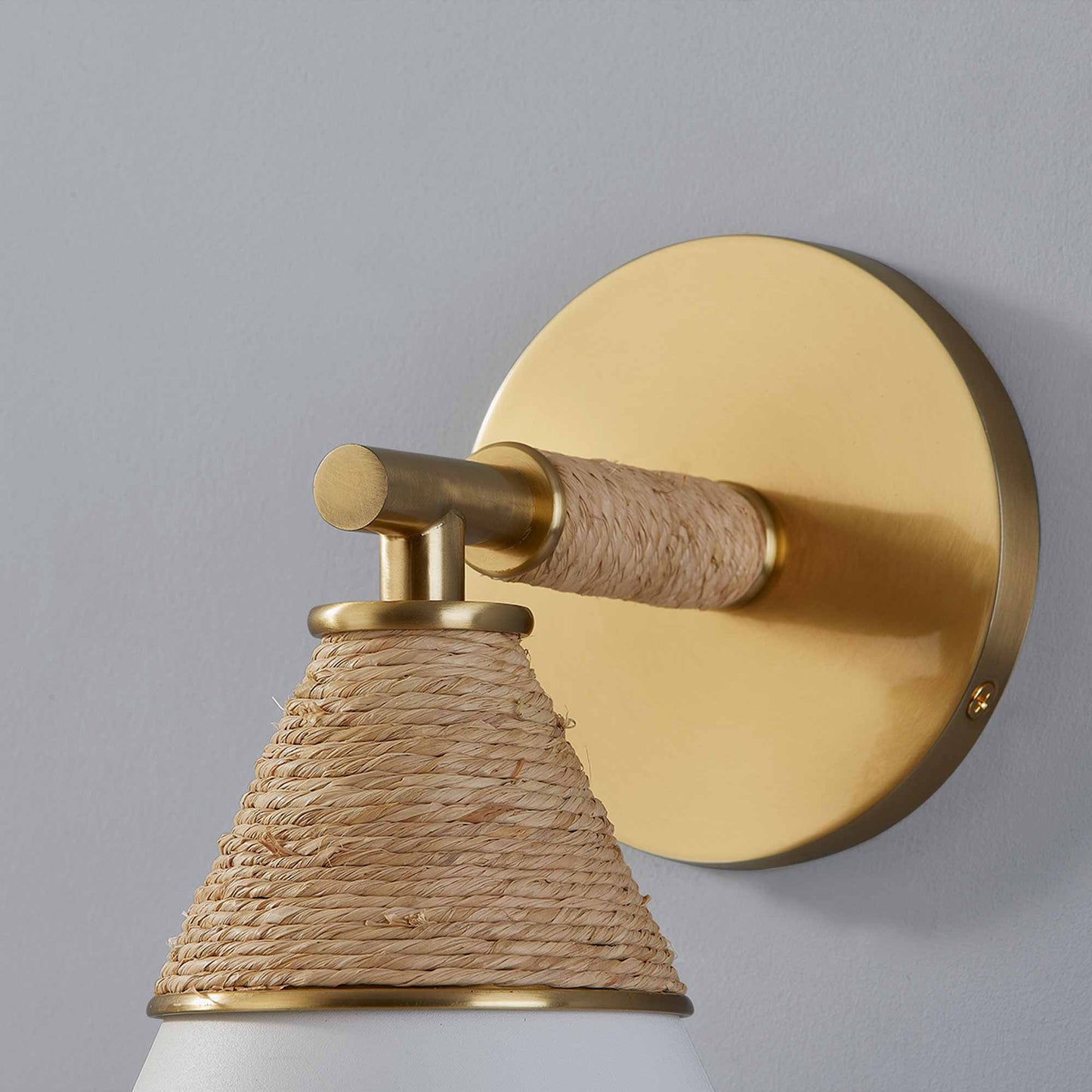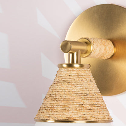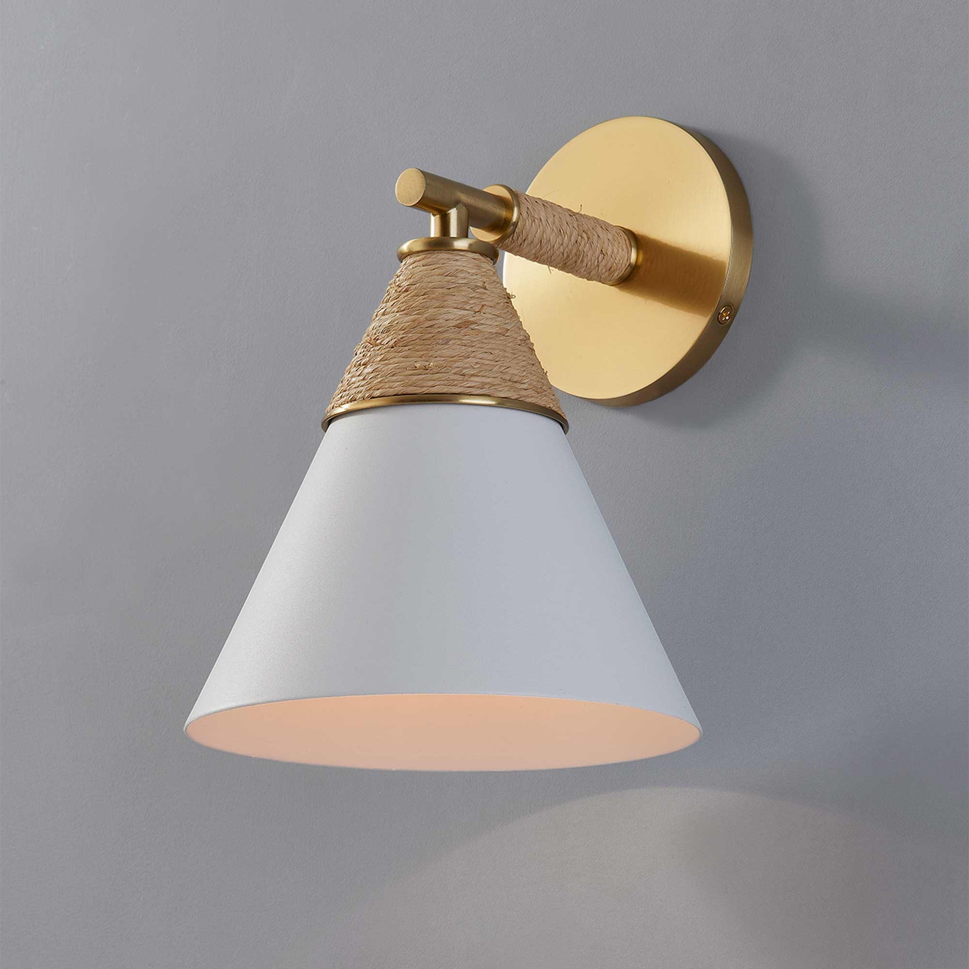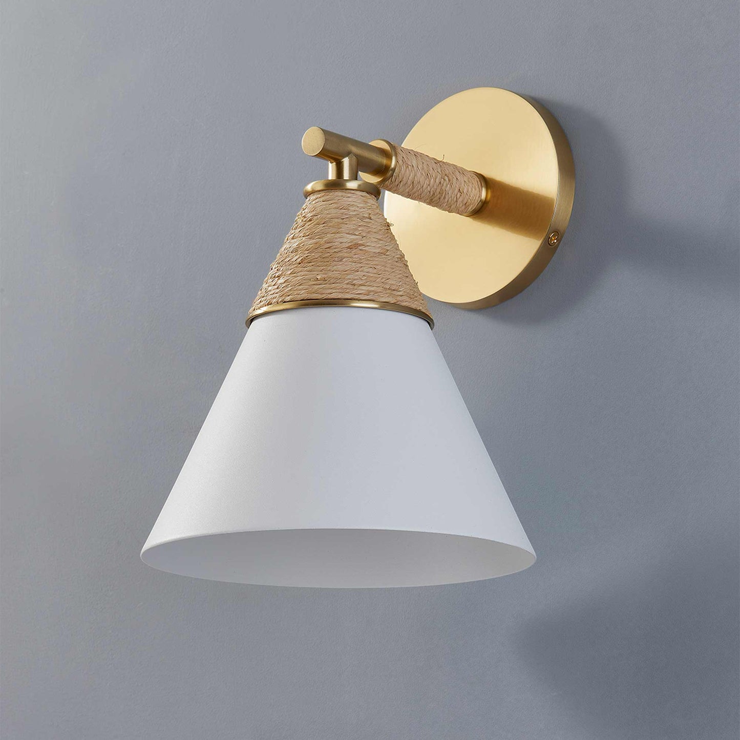 Delicacy contrasts with organic texture in the white shade and raffia wrapping of the impeccable Mica Wall Light from Mitzi. Gorgeous in a foyer, the sconce shows off superb modern coastal character. Casually sophisticated, its augmented with the warmth of aged brass accents and simplicity of familiar shapes.