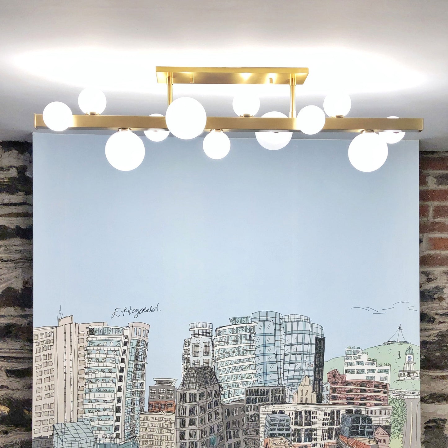 Playful and minimal, orbs of light cluster around a square metal beam as if some unseen magnetism were at work. Hand-blown glass spheres are finely etched inside while maintaining a clear glossy sheen on the outside. The result is a pleasing diffusion of light. Hinsdale exhibits sophistication and confidence.