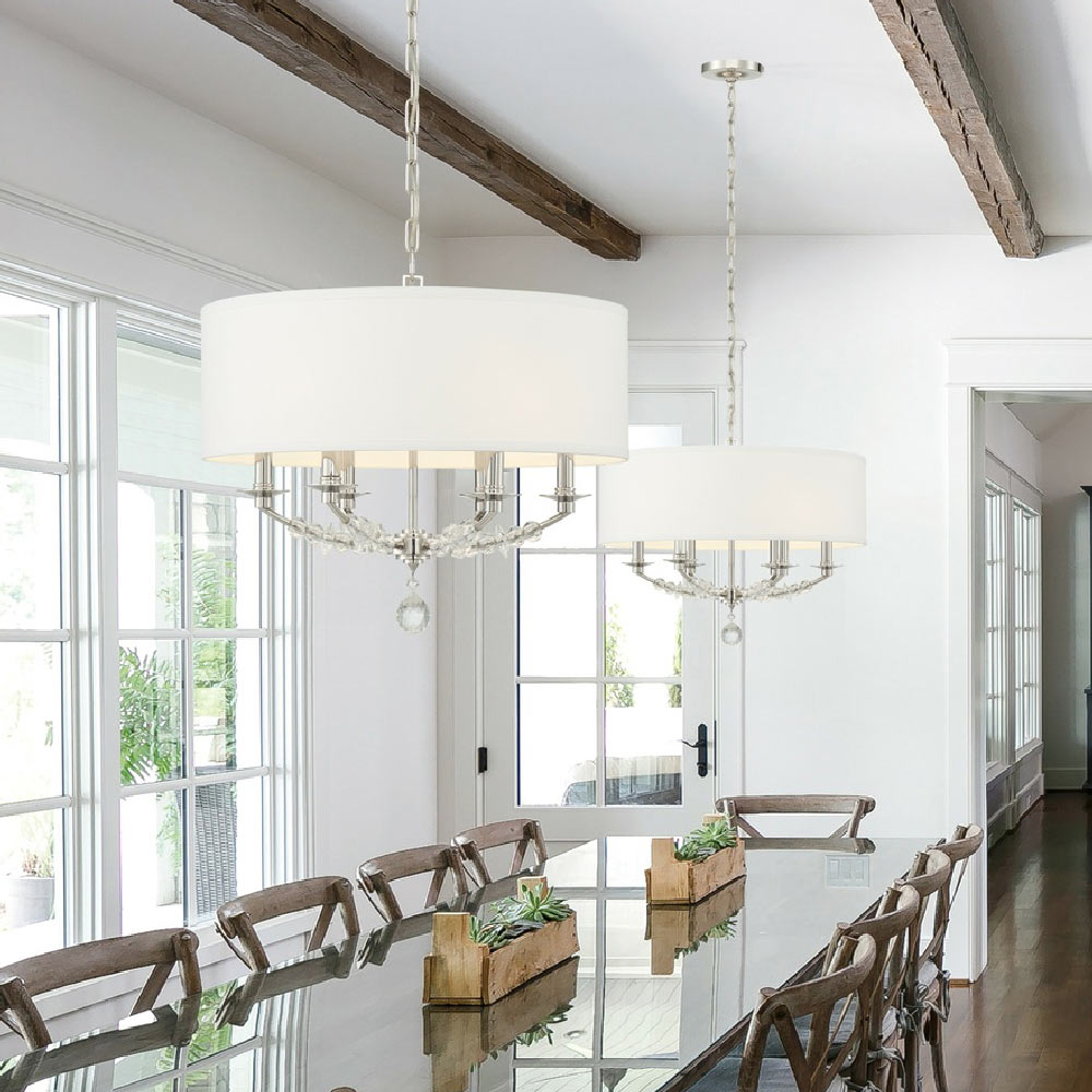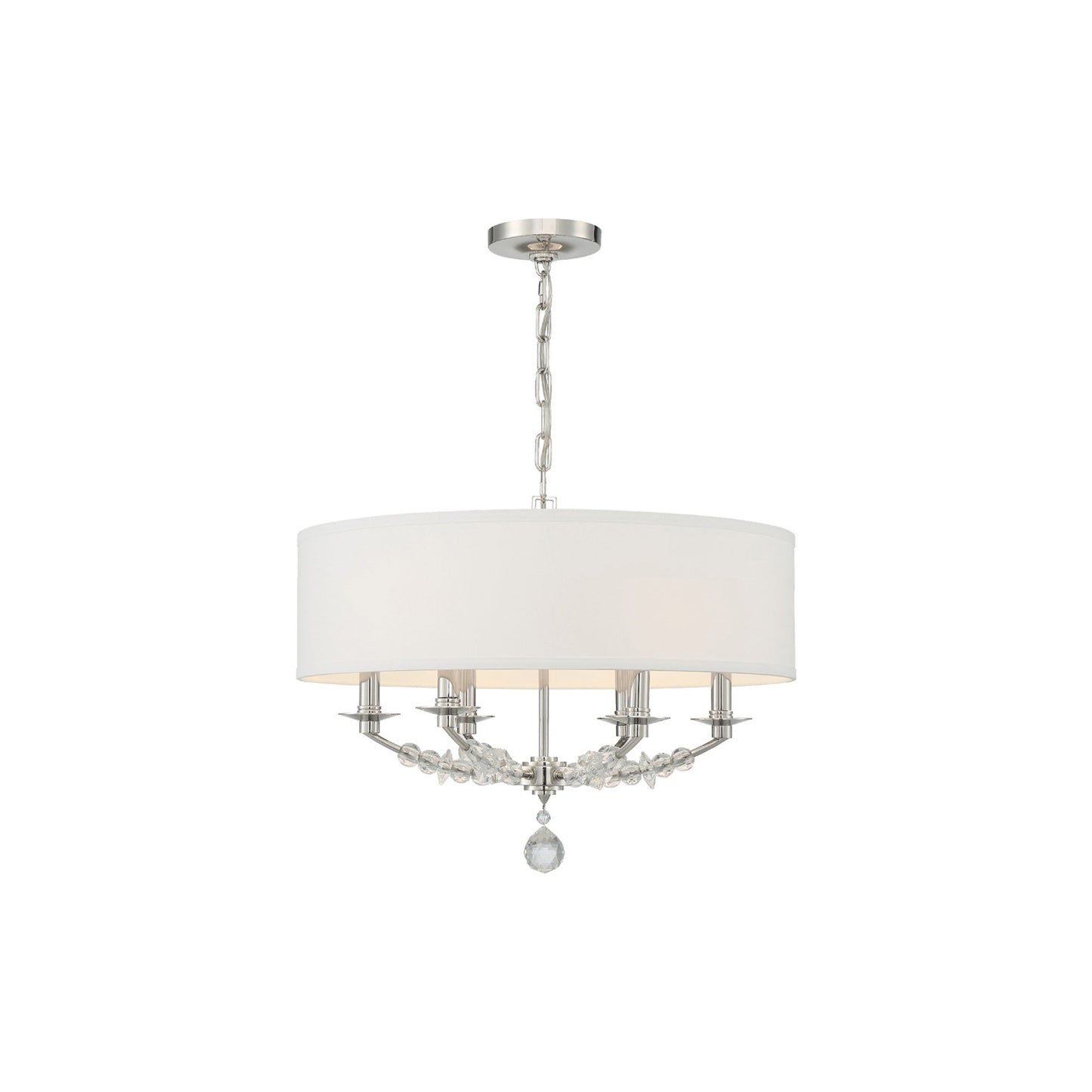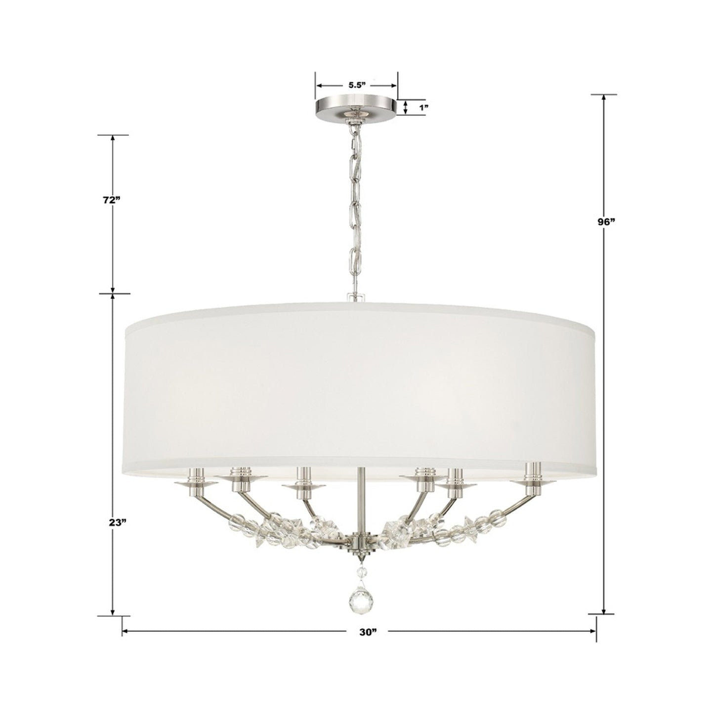The Mirage Chandelier from Crystorama delivers a luxurious look with a minimum of detail, ideal for balance in a living space or foyer. Its crisp white silk shade partially conceals candelabra lights while offering full view of polished nickel finish metal framing, with hand-cut crystal beads and a prominent faceted crystal drop element form proportional silhouetting that catches the eye.