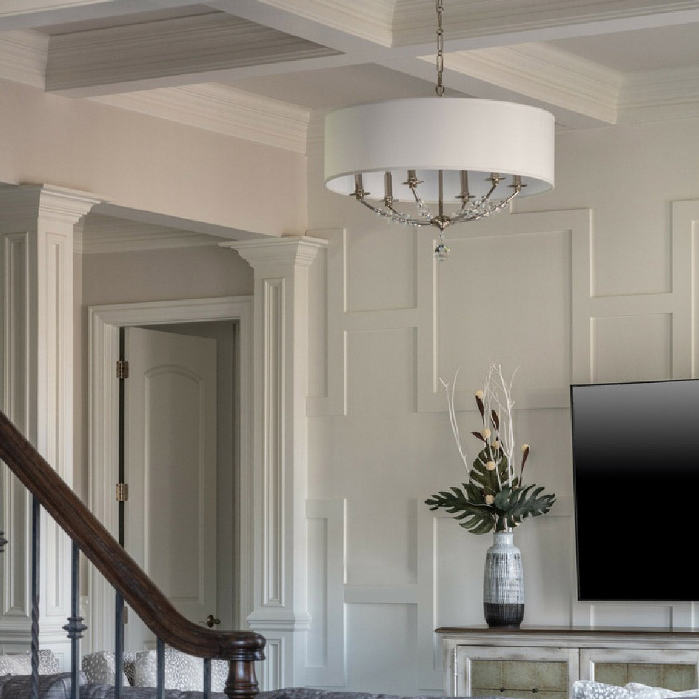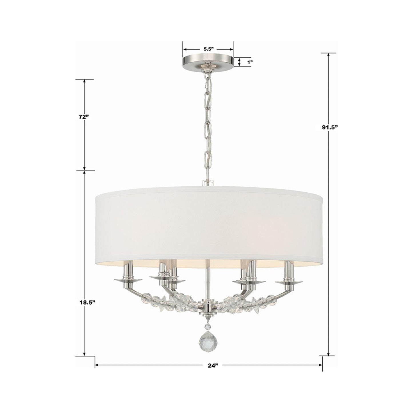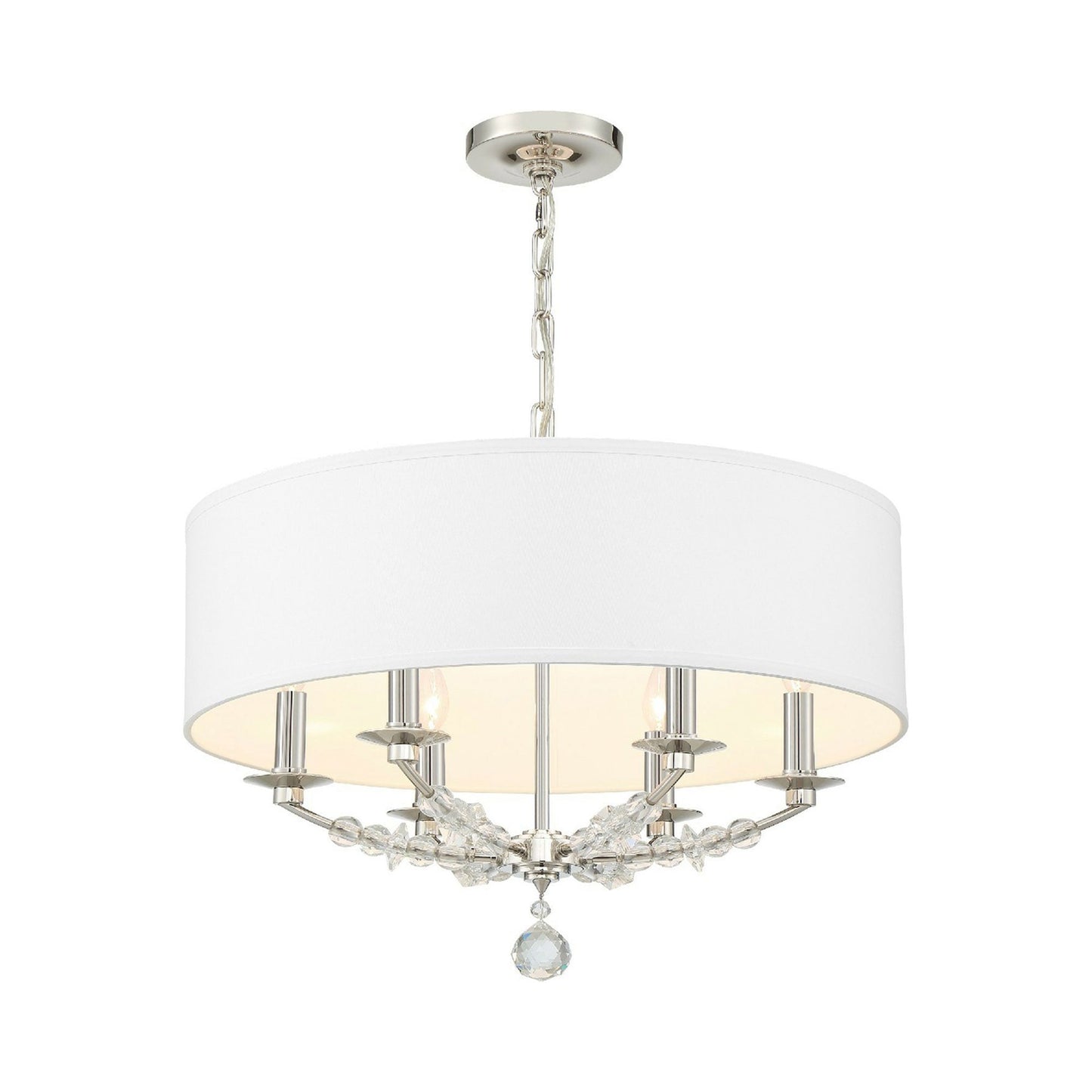 The Mirage Chandelier from Crystorama delivers a luxurious look with a minimum of detail, ideal for balance in a living space or foyer. Its crisp white silk shade partially conceals candelabra lights while offering full view of polished nickel finish metal framing, with hand-cut crystal beads and a prominent faceted crystal drop element form proportional silhouetting that catches the eye.