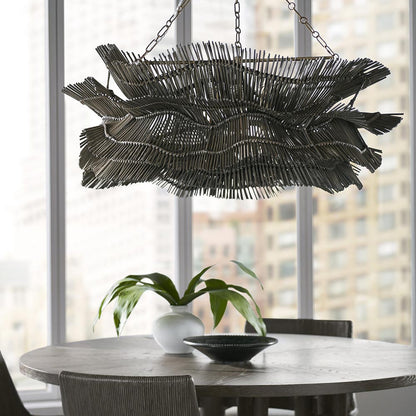 The Miramar Pendant from Palecek brims with earthy texture and depth, delivering organic artistry over an entry or dining table. Braided binding creates ribbons from rattan sticks, which wrap to create the incredible shade showcased at the end of an antique brass finish chain suspension and canopy that add a hint of richness and warmth.