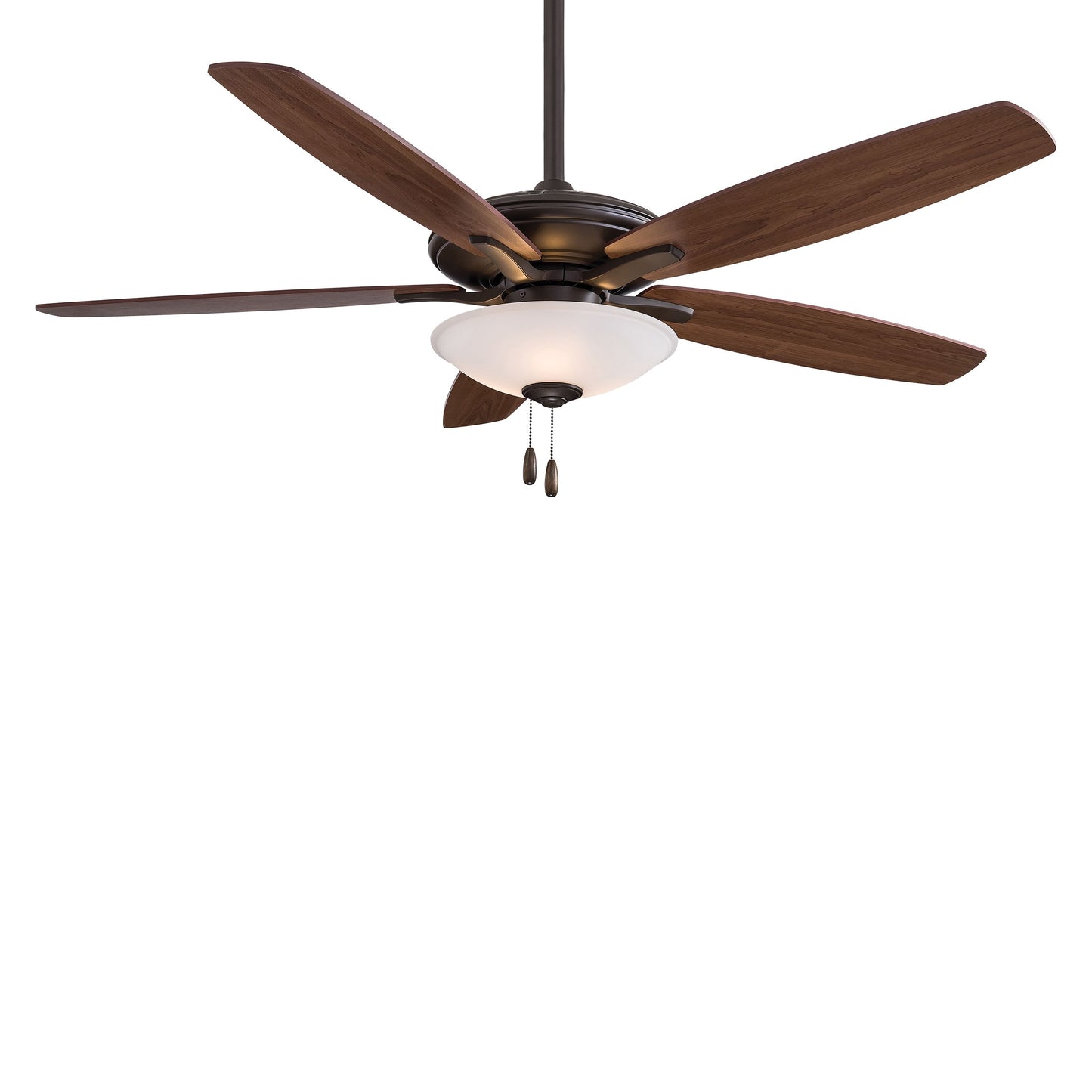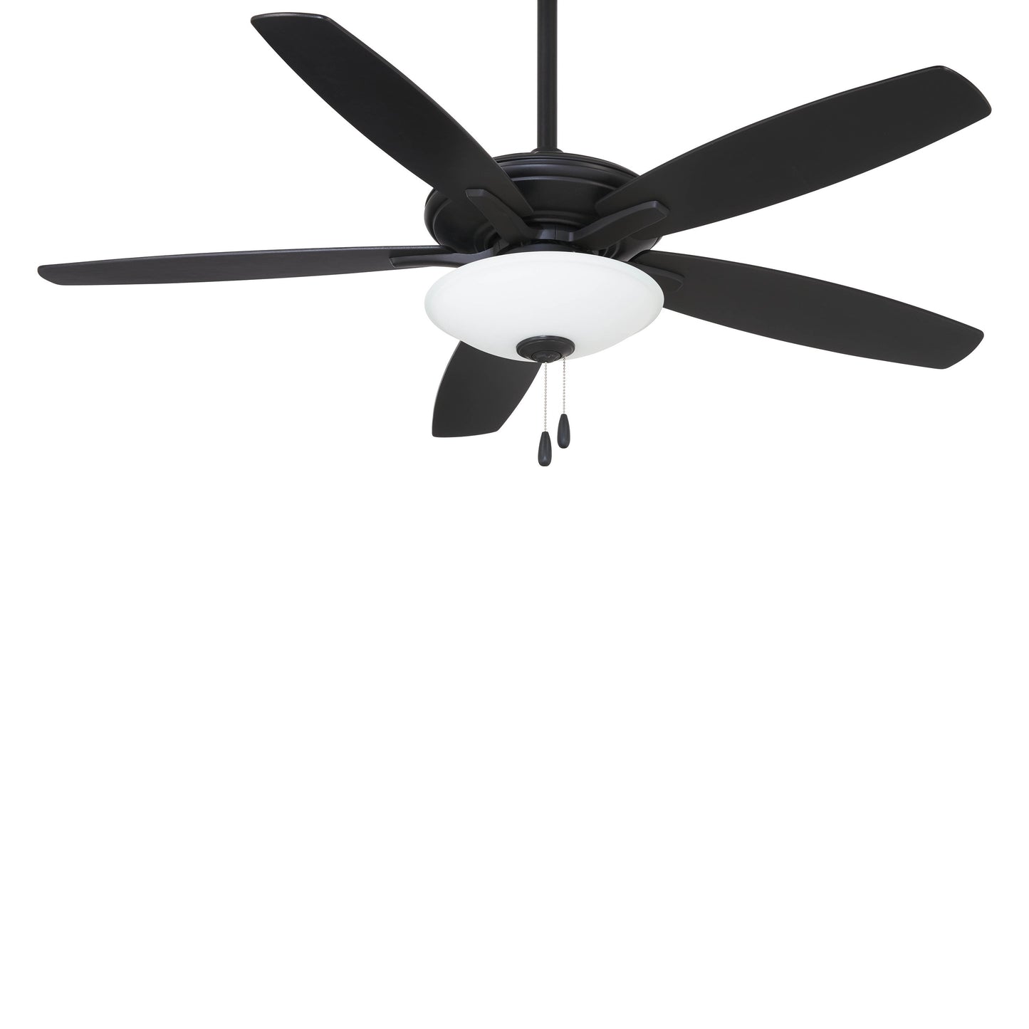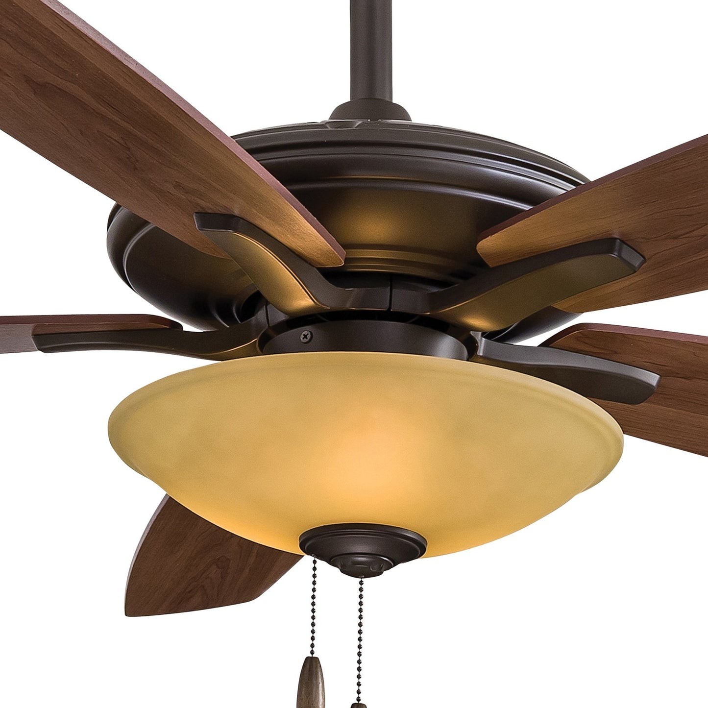 Embrace the traditional style of the Mojo Ceiling Fan from Minka Aire and its carefully designed assembly of accents that make it a visually enticing addition to a main living space. Five wood-like blades in a variety of finish options join an extended down rod and an ornate glass shade, as pull chains contribute an iconic traditional flavor.