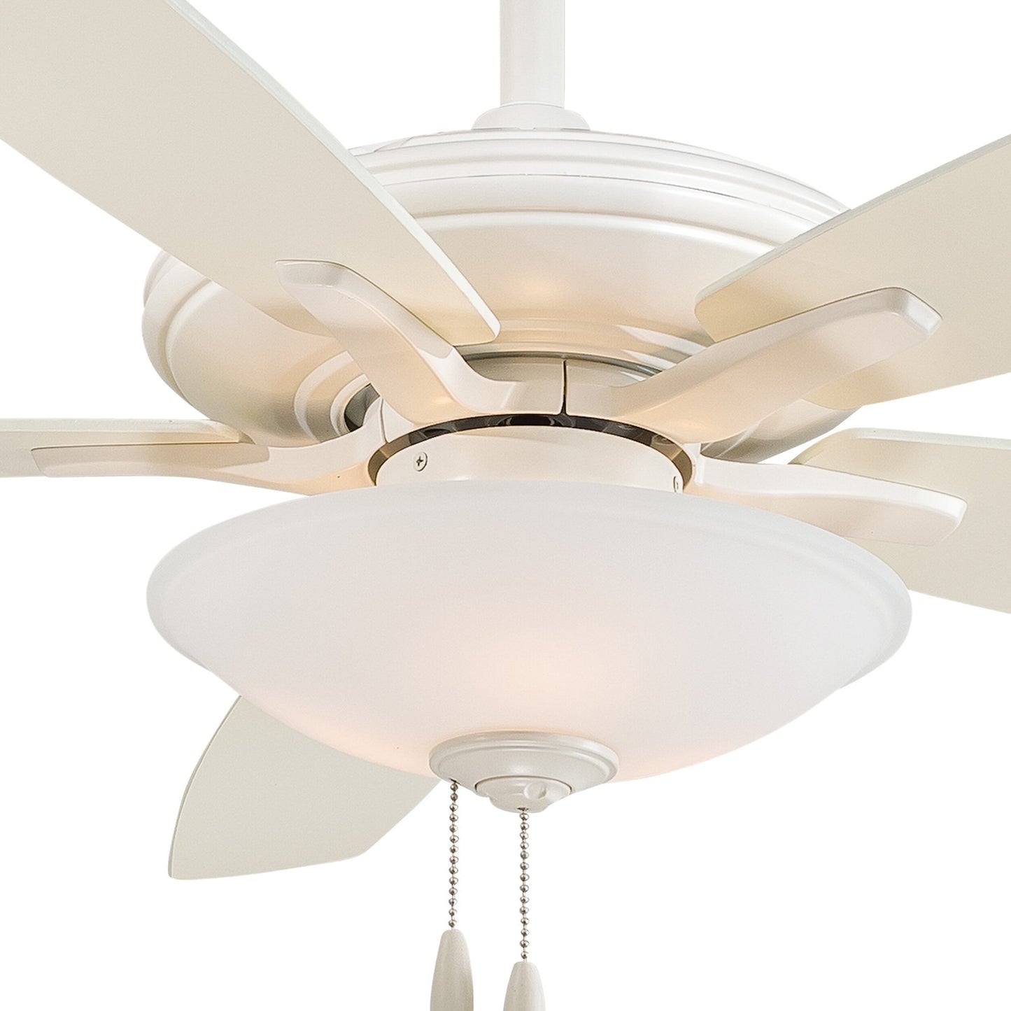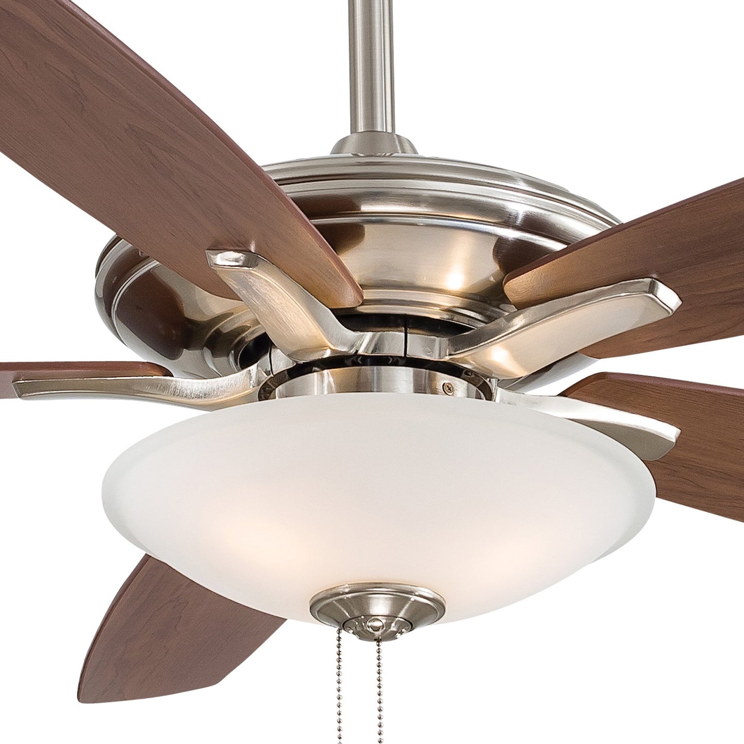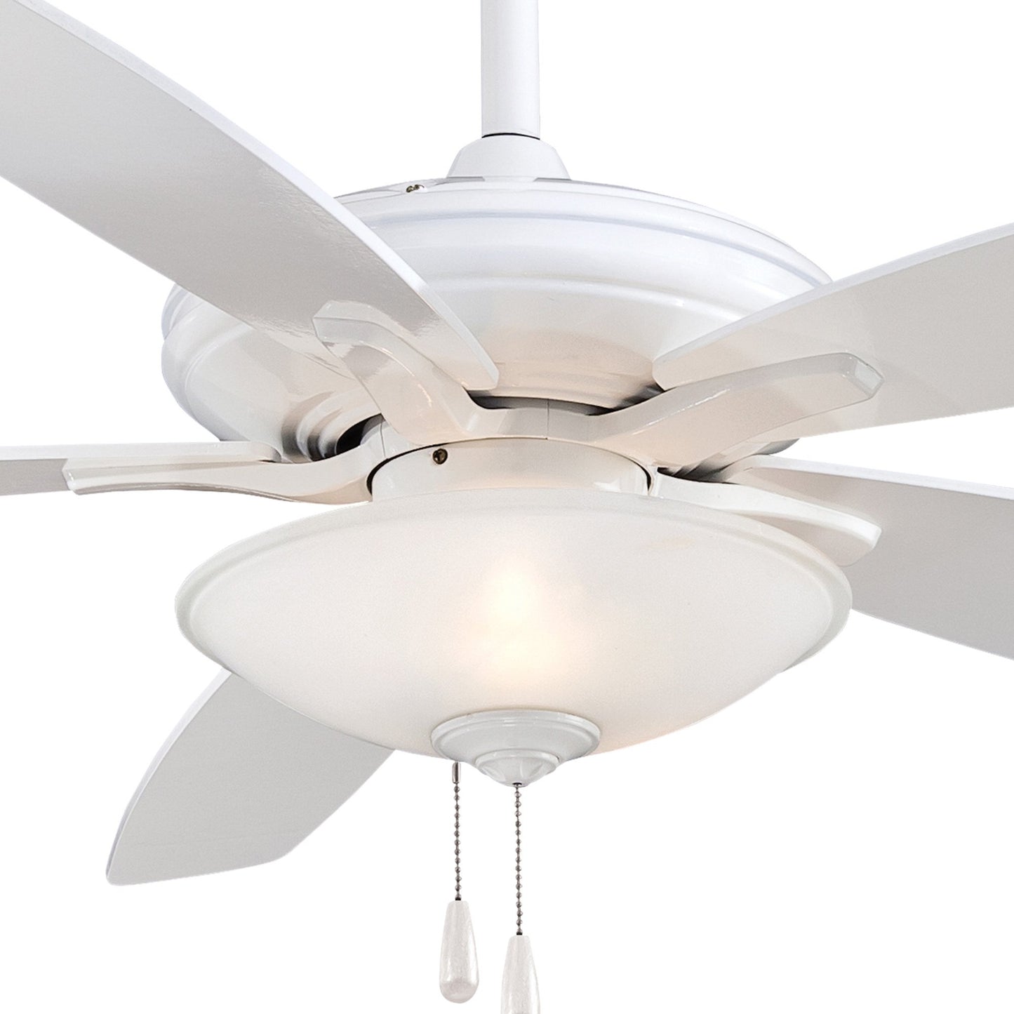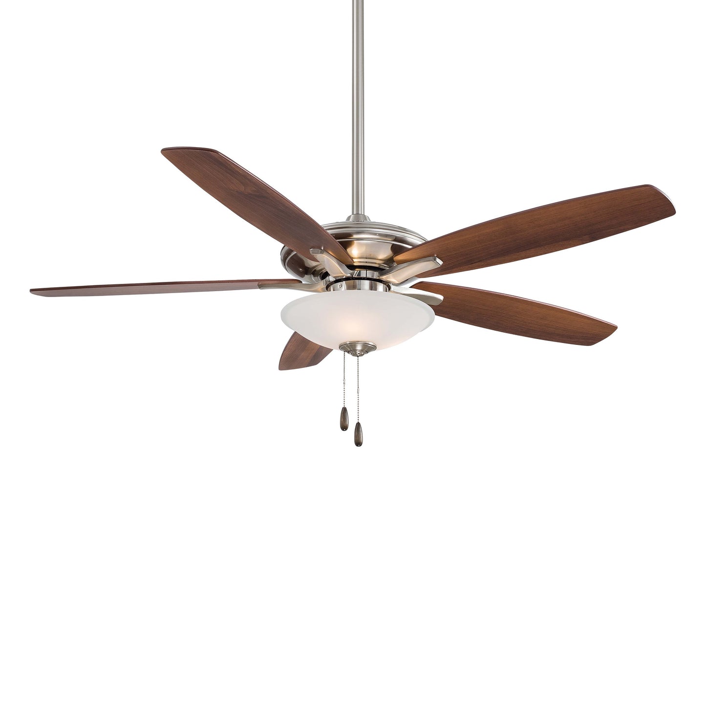 Embrace the traditional style of the Mojo Ceiling Fan from Minka Aire and its carefully designed assembly of accents that make it a visually enticing addition to a main living space. Five wood-like blades in a variety of finish options join an extended down rod and an ornate glass shade, as pull chains contribute an iconic traditional flavor.