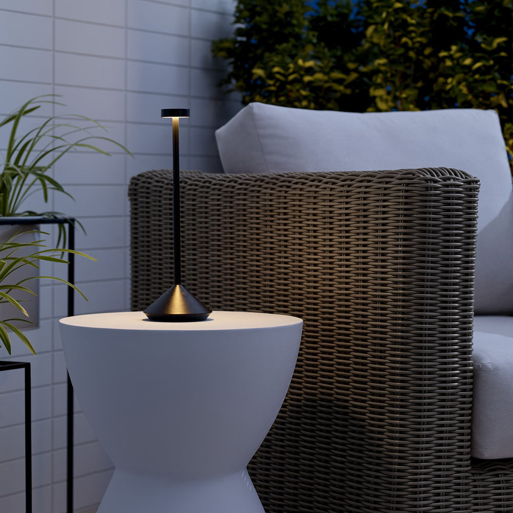 A compact light ring creates a soft glow from the Moneta LED Table Lamp from Visual Comfort Modern. It's chic, minimalist silhouette is anchored with a conical base, offering easy portability and a fit that works virtually anywhere. This rechargeable table lamp is easily portable, while delivering soft illumination and three-way dimming.
